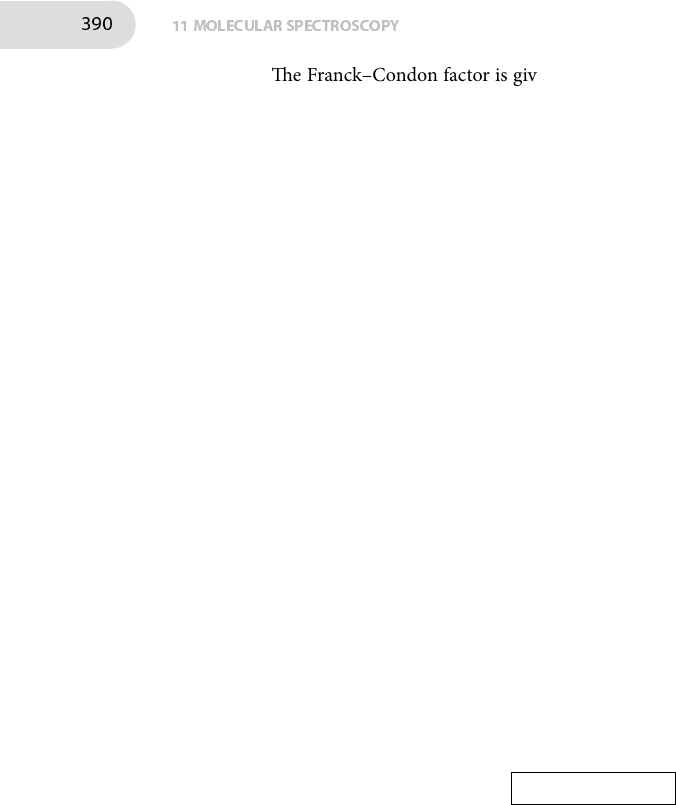 390 11MOLECULAR SPECTROSCOPY �e Franck–Condon factor is given by [11F.5–464] and involves the square of integral of the product of the two wavefunctions I = N1N0 ∫ +∞ −∞ e−ax 2/2(x − x0)e−a(x−x0) 2/2 dx = (a/π)1/4(4a3/π)1/4 ∫ +∞ −∞ (x − x0)e−a[x 2/2+(x−x0)2/2] dx = (2a2/π)1/2 ∫ +∞ −∞ (x − x0)e−a[x 2/2+x2/2−xx0+x20/2] dx = (2a2/π)1/2 ∫ +∞ −∞ (x − x0)e−a[x 2−xx0+x20/2] dx = (2a2/π)1/2 ∫ +∞ −∞ (x − x0)e−a(x−x0/2) 2 e−ax 2 0/4 dx the �nal equality above is veri�ed by expanding out the square and recombining the terms.�e next step is to take out the constant factors and split the integral into two using (x − x0) = (x − x0/2) − x0/2 I = (2a2/π)1/2e−ax 2 0/4 ∫ +∞ −∞ (x − x0)e−a(x−x0/2) 2 dx = (2a2/π)1/2e−ax 2 0/4 × [∫ +∞ −∞ (x − x0/2)e−a(x−x0/2) 2 dx − (x0/2)∫ +∞ −∞ e−a(x−x0/2) 2 dx] �e �rst integral is of an odd function over a symmetric interval and so is zero. �e second integral is of the form of Integral G.1 with k = a and evaluates to (π/a)1/2 (it does not matter that it is centred at x0 rather than 0). Hence I = −(2a2/π)1/2e−ax 2 0/4(x0/2)(π/a)1/2 = −(2a)1/2(x0/2)e−ax 2 0/4 �e Franck–Condon factor is I2 = (ax20/2)e−ax 2 0/2 . As expected, this factor is zero when x0 = 0 as then the two wavefunctions align and have zero overlap on account of one being even andone being odd. By taking the derivative of I2 with respect to x0 it is easily shown that the Franck–Condon factor is a maximum at x0 = ±(2/a)1/2. E11F.6(b) �e Franck–Condon factor is given by [11F.5–464] and involves the square of integral of the product of the two wavefunctions. �e region over which both wavefunctions are non-zero is from L/2 to L: this is the domain of integration I = (2/L)∫ L L/2 sin(πx/L) sin(π[x − L/2]/L)dx Note that sin(π[x − L/2]/L) = sin(πx/L − π/2) = − cos(πx/L), this gives a useful simpli�cation I = −(2/L)∫ L L/2 sin(πx/L) cos(πx/L)dx
