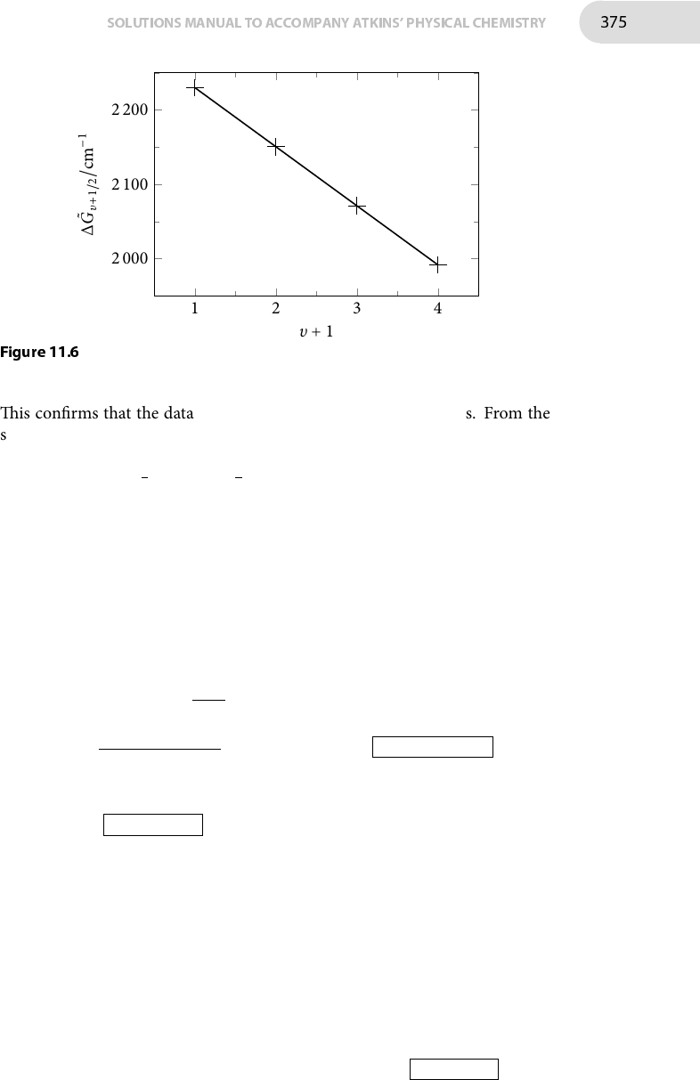 SOLUTIONSMANUAL TO ACCOMPANY ATKINS' PHYSICAL CHEMISTRY 375 1 2 3 4 2 000 2 100 2 200 υ + 1 ∆G̃ υ+ 1/ 2/ cm −1 Figure 11.6 �is con�rms that the data are well-described by the Morse levels. From the slope xe ν̃/cm−1 = − 12 × slope = − 1 2 (−79.46) hence xe ν̃ = 39.73 cm−1 and from the intercept ν̃/cm−1 = intercept = 2 309.5 hence ν̃ = 2 309.5 cm−1 �e depth of the well, D̃e is then found using [11C.8–444], xe = ν̃/4D̃e rear- ranged to D̃e = ν̃/4xe = ν̃2/4ν̃xe. �e dissociation energy is D̃0 = D̃e − G̃(0) (Fig. 11C.3 on page 444), hence D̃0 = D̃e − G̃(0) = ν̃2 4ν̃xe − G̃(0) = (2309.5 cm−1)2 4 × (39.73 cm−1) − (1144.83 cm−1) = 3.24 × 104 cm−1 To convert to eV, the conversion 1 eV = 8065.5 cm−1 from inside the front cover is used to give D0 = 4.02 eV . �e result is only quoted to modest precision because in e�ect the dissociation limit is extrapolated from just a few levels near to the bottom of the potential energy well. E11C.8(b) �e wavenumber of the transition arising from the rotational state J in the P branch (∆J = −1) of the fundamental transition (υ = 1 ← υ = 0) is given by [11C.13a–447], ν̃P(J) = ν̃ − 2B̃J. In this case ν̃ = 2648.98 cm−1 and B̃ = 8.465 cm−1 hence ν̃R(2) = (2648.98 cm−1) − 2 × (8.465 cm−1) × 2 = 2615.1 cm−1