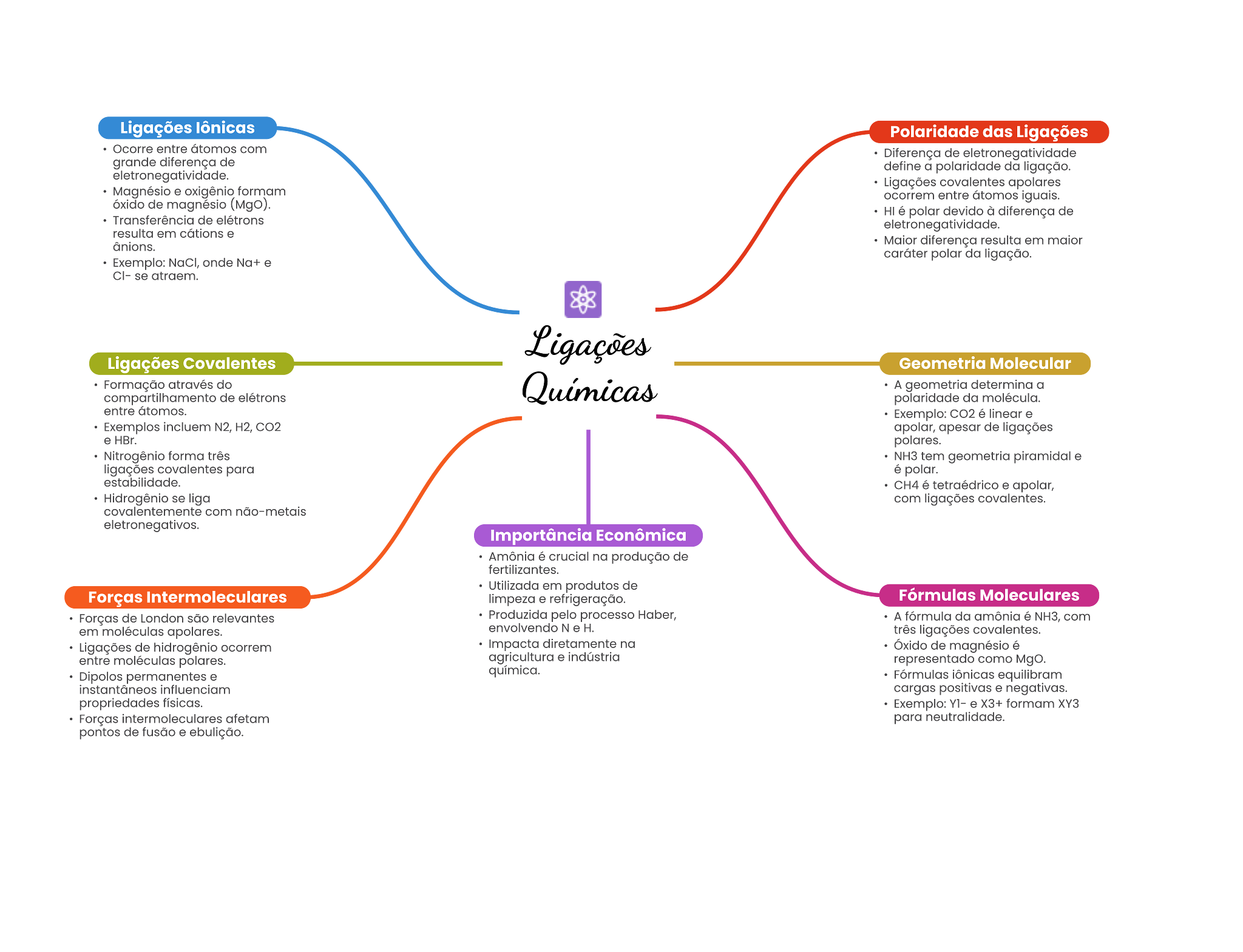 Ligações lônicas Polaridade das Ligações Ocorre entre com Diferença de grande diferença de define a polaridade da ligação. Ligações covalentes oxigênio formam entre átomos de (MgO). HI devido à diferença de Transferência de elétrons resulta em diferença resulta em caráter polar da ligação. Exemplo: onde atraem. Ligações Covalentes Geometria Molecular Formação do A determina a de elétrons polaridade da molécula. entre Exemplo: CO2 linear . N2, H2, CO2 apeear de ligações HBr. polares. Nitrogênio forma trêe NH3 tern geometria piramidal ligações covalentes para polar. CH4 . apolar, Hidrogênio se liga com ligações covalentes. covalentemente com Importância Econômica Amônia crucial na produção de fertilizantes. Utilizada em produtos de Forças Intermoleculares limpeza refrigeração. Fórmulas Moleculares Forças de são relevantes Produzida pelo processo Haber, A fórmula da amônia 6 NH3, com em moléculas envolvendo N ligações covalentes. Ligações de diretamente Óxido de magnésio é entre polares. agricultura representado como MgO. permanentes quimica. Fórmulas equilibram cargas positivas e negativas. propriedades Exemplo: YH X3+ formam XY3 Forças afetam para pontos de e