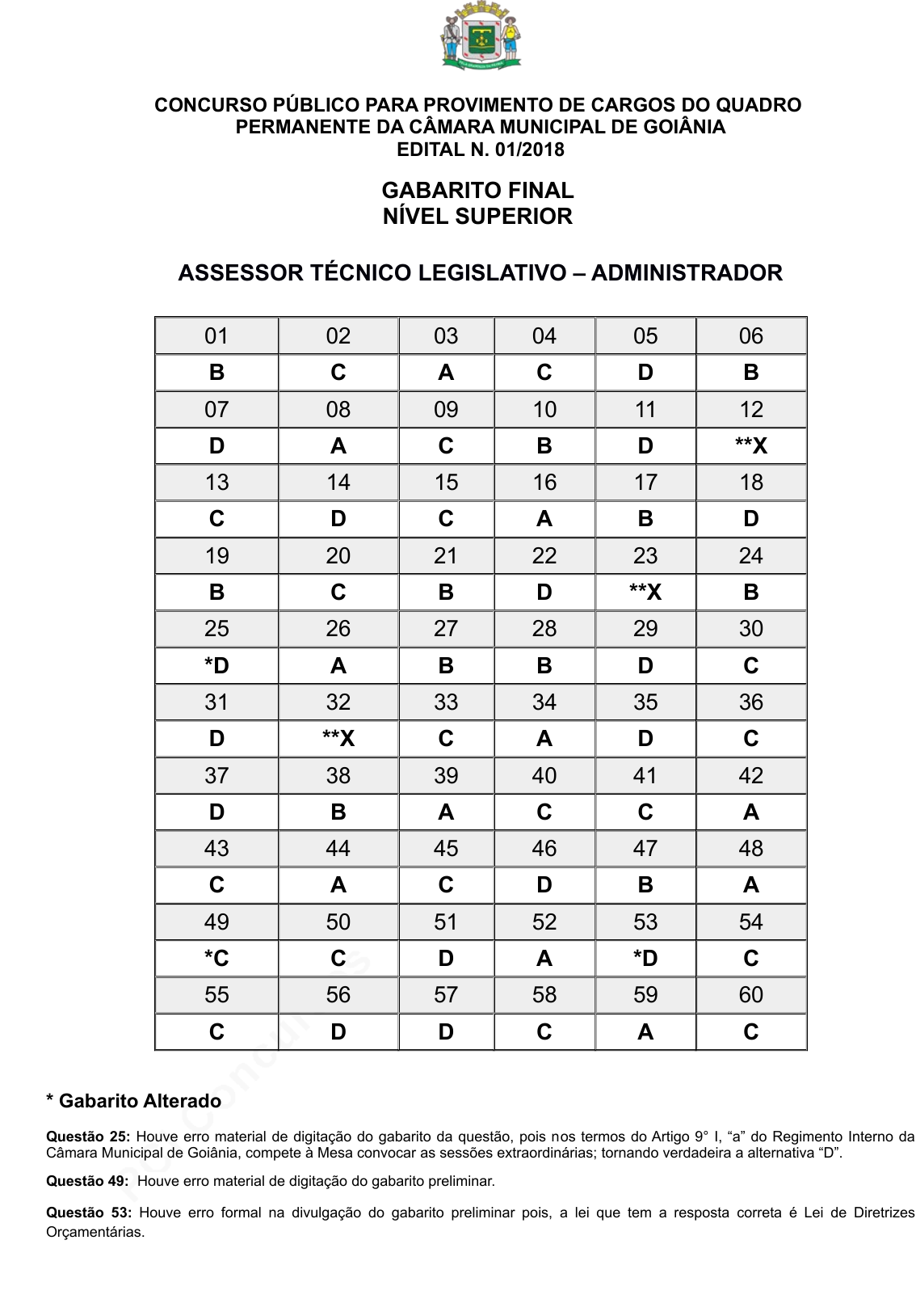 pcimarkpci MjgwNDowZTY0OjE1ZTc6Y2UwMDowOWI5OmZjZDA6NDNjYzoyODc4:U2F0LCAwMSBOb3YgMjAyNSAwMDoxNTo0NiAtMDMwMA== www.pciconcursos.com.br CONCURSO PÚBLICO PARA PROVIMENTO DE CARGOS DO QUADRO PERMANENTE DA CÂMARA MUNICIPAL DE GOIÂNIA EDITAL N. 01/2018 GABARITO FINAL NÍVEL SUPERIOR ASSESSOR TÉCNICO LEGISLATIVO – ADMINISTRADOR 01 02 03 04 05 06 B C A C D B 07 08 09 10 11 12 D A C B D **X 13 14 15 16 17 18 C D C A B D 19 20 21 22 23 24 B C B D **X B 25 26 27 28 29 30 *D A B B D C 31 32 33 34 35 36 D **X C A D C 37 38 39 40 41 42 D B A C C A 43 44 45 46 47 48 C A C D B A 49 50 51 52 53 54 *C C D A *D C 55 56 57 58 59 60 C D D C A C * Gabarito Alterado Questão 25: Houve erro material de digitação do gabarito da questão, pois nos termos do Artigo 9° I, “a” do Regimento Interno da Câmara Municipal de Goiânia, compete à Mesa convocar as sessões extraordinárias; tornando verdadeira a alternativa “D”. Questão 49: Houve erro material de digitação do gabarito preliminar. Questão 53: Houve erro formal na divulgação do gabarito preliminar pois, a lei que tem a resposta correta é Lei de Diretrizes Orçamentárias. pcimarkpci MjgwNDowZTY0OjE1ZTc6Y2UwMDowOWI5OmZjZDA6NDNjYzoyODc4:U2F0LCAwMSBOb3YgMjAyNSAwMDoxNTo0NiAtMDMwMA== www.pciconcursos.com.br ** Questão Anulada Questão 12: Houve erro material na digitação da questão, pois no enunciado, onde se lê R$ 24.00,00 deveria estar escrito R$ 24.000,00. Questão 23: Houve erro formal na elaboração da questão, pois, a dicção da alternativa “A” encontra-se escupida no art. 132 da Lei Complementar n. 011, de 11 de maio de 1992 (Estatuto dos Servidores Públicos do Município de Goiânia), portanto está correta a afirmação. No entanto, a Emenda à Lei Orgânica n. 052, de 01 de agosto de 2012, revogou o art. 32 do referido Estatuto, que disciplinava a estabilidade após o cumprimento de 02 anos de exercício no cargo, e introduziu à Lei Orgânica o art. 36-A, que determina novo prazo de 03 anos. Há duas alternativas corretas, letras “A” e “C”. Questão 32: Houve erro formal na elaboração da questão, pois as decisões programadas, embora sejam classificadas por Sobral e Peci (2008, p. 102) como decisões rotineiras, recorrentes, programáveis e genéricas, dão margem para a interpretação de que podem também ser caracterizadas por serem específicas, já que representam "soluções para situações repetitivas e estruturadas, determinadas por abordagens específicas para as quais a organização já desenvolveu mecanismos de atuação e controle (Ibid., p. 101). Cabe dizer que esses mesmos autores consideram também que as decisões não-programadas são "soluções específicas para resolver situações desestruturadas" (Ibid, p. 102). A definição de Chiavenato (2004, p. 367) para decisão programada também reforça a possibilidade de dupla interpretação: "são decisões que implementam soluções específicas, determinadas pela experiência passada como adequadas para problemas similares". Goiânia, 14 de setembro de 2018. pcimarkpci MjgwNDowZTY0OjE1ZTc6Y2UwMDowOWI5OmZjZDA6NDNjYzoyODc4:U2F0LCAwMSBOb3YgMjAyNSAwMDoxNTo0NiAtMDMwMA== www.pciconcursos.com.br CONCURSO PÚBLICO PARA PROVIMENTO DE CARGOS DO QUADRO PERMANENTE DA CÂMARA MUNICIPAL DE GOIÂNIA EDITAL N. 01/2018 GABARITO FINAL NÍVEL MÉDIO ASSISTENTE TÉCNICO LEGISLATIVO - AGENTE ADMINISTRATIVO 01 02 03 04 05 06 B D C A B C 07 08 09 10 11 12 D A B B C A 13 14 15 16 17 18 D C B A D B 19 20 21 22 23 24 A C C A A C 25 26 27 28 29 30 B *D B C B D 31 32 33 34 35 36 B D B A C C 37 38 39 40 41 42 **X D C A D C 43 44 45 46 47 48 A B A B D **X 49 50 C D * Gabarito Alterado Questão 26: Houve erro material de digitação do gabarito, pois de acordo com o Estatuto dos Servidores Públicos do Município de Goiânia a alternativa (D) é a CORRETA, por estar fundamentada no art. 24 do respectivo diploma. ** Questão Anulada Questão 37: Houve erro material na elaboração da questão, pois há 2 alternativas corretas: A e C. Questão 48: Houve erro formal na elaboração da questão, pois, quanto à origem, a dívida pode ser interna e externa. Assim, as alternativas A e C estariam corretas. Goiânia, 14 de setembro de 2018. pcimarkpci MjgwNDowZTY0OjE1ZTc6Y2UwMDowOWI5OmZjZDA6NDNjYzoyODc4:U2F0LCAwMSBOb3YgMjAyNSAwMDoxNTo0NiAtMDMwMA== www.pciconcursos.com.br CONCURSO PÚBLICO PARA PROVIMENTO DE CARGOS DO QUADRO PERMANENTE DA CÂMARA MUNICIPAL DE GOIÂNIA EDITAL N. 01/2018 GABARITO FINAL NÍVEL MÉDIO ASSISTENTE TÉCNICO LEGISLATIVO - AGENTE DE SEGURANÇA DO PLENÁRIO 01 02 03 04 05 06 B D C A B C 07 08 09 10 11 12 D A B B C A 13 14 15 16 17 18 D C B A D B 19 20 21 22 23 24 A C C A A C 25 26 27 28 29 30 B *D A C D A 31 32 33 34 35 36 C D B B A D 37 38 39 40 41 42 A D C C B D 43 44 45 46 47 48 C A B A C A 49 50 D A * Gabarito Alterado Questão 26: Houve erro material de digitação do gabarito, pois de acordo com o Estatuto dos Servidores Públicos do Município de Goiânia a alternativa (D) é a CORRETA, por estar fundamentada no art. 24 do respectivo diploma. Goiânia, 14 de setembro de 2018. pcimarkpci MjgwNDowZTY0OjE1ZTc6Y2UwMDowOWI5OmZjZDA6NDNjYzoyODc4:U2F0LCAwMSBOb3YgMjAyNSAwMDoxNTo0NiAtMDMwMA== www.pciconcursos.com.br CONCURSO PÚBLICO PARA PROVIMENTO DE CARGOS DO QUADRO PERMANENTE DA CÂMARA MUNICIPAL DE GOIÂNIA EDITAL N. 01/2018 GABARITO FINAL NÍVEL SUPERIOR ASSESSOR TÉCNICO LEGISLATIVO – ANALISTA DE SISTEMAS 01 02 03 04 05 06 B C A C D B 07 08 09 10 11 12 D A C B D **X 13 14 15 16 17 18 C D C A B D 19 20 21 22 23 24 B C B D **X B 25 26 27 28 29 30 *D A B A D B 31 32 33 34 35 36 A D C D C B 37 38 39 40 41 42 B A D C A A 43 44 45 46 47 48 C B D A D A 49 50 51 52 53 54 C D C B A C 55 56 57 58 59 60 D B A C B C * Gabarito Alterado Questão 25: Houve erro formal na digitação do gabarito da questão, pois nos termos do Artigo 9° I, “a” do Regimento Interno da Câmara Municipal de Goiânia, compete à Mesa convocar as sessões extraordinárias; to
