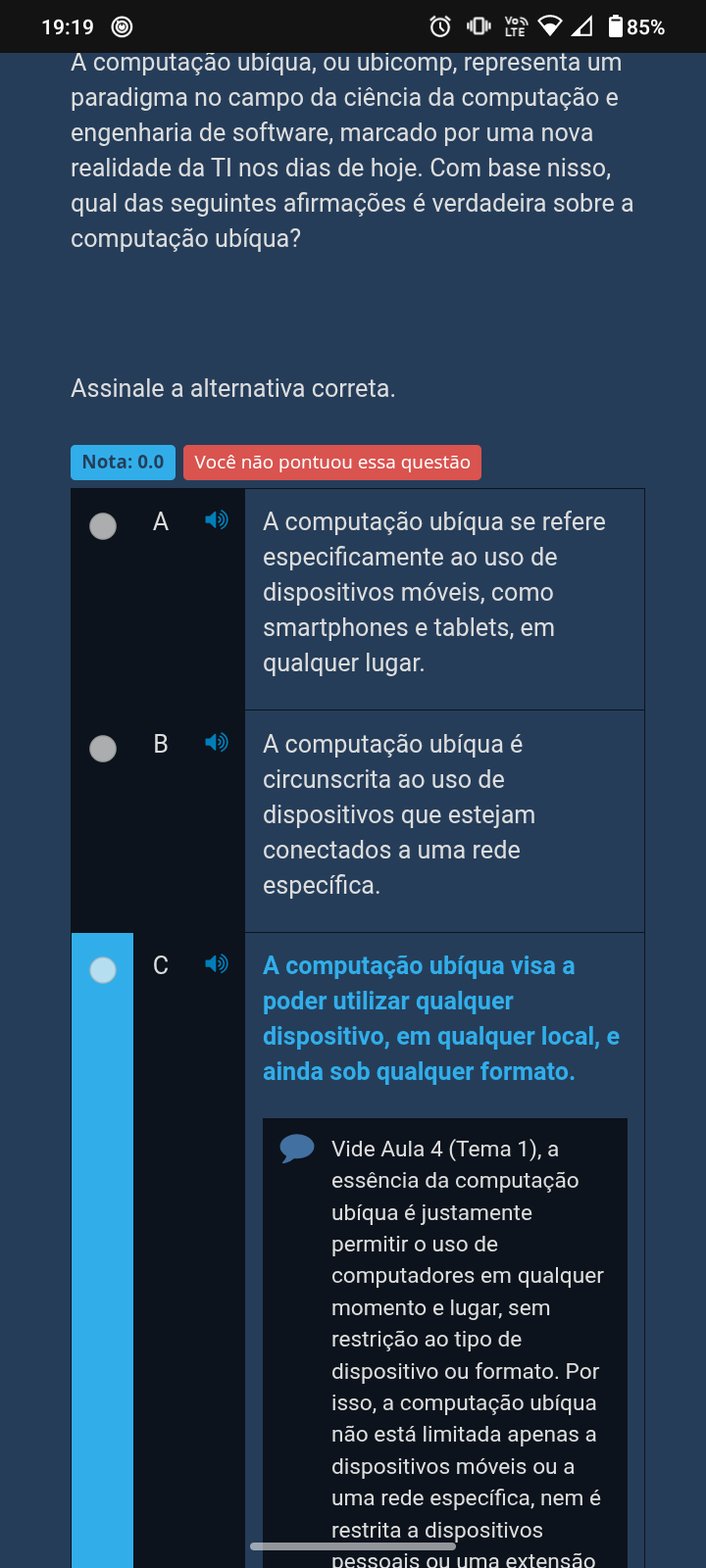 19:19 LTE 85% A computação ubíqua, ou ubicomp, representa um paradigma no campo da ciência da computação e engenharia de software, marcado por uma nova realidade da TI nos dias de hoje. Com base nisso, qual das seguintes afirmações é verdadeira sobre a computação ubíqua? Assinale a alternativa correta. Nota: 0.0 Você não pontuou essa questão A A computação ubíqua se refere especificamente ao uso de dispositivos móveis, como smartphones e tablets, em qualquer lugar. A computação ubíqua é circunscrita ao uso de dispositivos que estejam conectados a uma rede específica. A computação ubíqua visa a poder utilizar qualquer dispositivo, em qualquer local, e ainda sob qualquer formato. Vide Aula 4 (Tema 1), a essência da computação ubíqua é justamente permitir uso de computadores em qualquer momento e lugar, sem restrição ao tipo de dispositivo ou formato. Por isso, a computação ubíqua não está limitada apenas a dispositivos móveis ou a uma rede específica, nem é restrita a dispositivos pessoais ou uma extensão