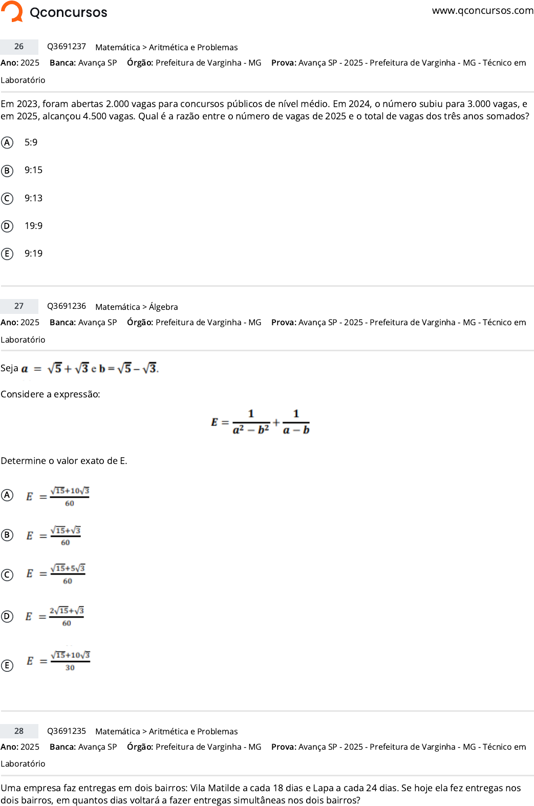 www.qconcursos.com Ano: 2025 Banca: Avança SP Órgão: Prefeitura de Varginha - MG Em 2023, foram abertas 2.000 vagas para concursos públicos de nível médio. Em 2024, o número subiu para 3.000 vagas, e em 2025, alcançou 4.500 vagas. Qual é a razão entre o número de vagas de 2025 e o total de vagas dos três anos somados? A 5:9 B 9:15 C 9:13 D 19:9 E 9:19 Ano: 2025 Banca: Avança SP Órgão: Prefeitura de Varginha - MG Seja Considere a expressão: Determine o valor exato de E. A B C D E Ano: 2025 Banca: Avança SP Órgão: Prefeitura de Varginha - MG Uma empresa faz entregas em dois bairros: Vila Matilde a cada 18 dias e Lapa a cada 24 dias. Se hoje ela fez entregas nos dois bairros, em quantos dias voltará a fazer entregas simultâneas nos dois bairros? 26 Q3691237 >Matemática Aritmética e Problemas Prova: Avança SP - 2025 - Prefeitura de Varginha - MG - Técnico em Laboratório 27 Q3691236 >Matemática Álgebra Prova: Avança SP - 2025 - Prefeitura de Varginha - MG - Técnico em Laboratório 28 Q3691235 >Matemática Aritmética e Problemas Prova: Avança SP - 2025 - Prefeitura de Varginha - MG - Técnico em Laboratório https://www.qconcursos.com/ https://www.qconcursos.com/questoes-de-concursos/bancas/avanca-sp https://www.qconcursos.com/questoes-de-concursos/institutos/prefeitura-de-varginha-mg https://www.qconcursos.com/questoes-de-concursos/bancas/avanca-sp https://www.qconcursos.com/questoes-de-concursos/institutos/prefeitura-de-varginha-mg https://www.qconcursos.com/questoes-de-concursos/bancas/avanca-sp https://www.qconcursos.com/questoes-de-concursos/institutos/prefeitura-de-varginha-mg https://www.qconcursos.com/questoes-de-concursos/questoes/0b7c275e-b4 https://www.qconcursos.com/questoes-de-concursos/disciplinas/matematica-matematica https://www.qconcursos.com/questoes-de-concursos/disciplinas/matematica-matematica/aritmetica-e-problemas https://www.qconcursos.com/questoes-de-concursos/provas/avanca-sp-2025-prefeitura-de-varginha-mg-tecnico-em-laboratorio https://www.qconcursos.com/questoes-de-concursos/provas/avanca-sp-2025-prefeitura-de-varginha-mg-tecnico-em-laboratorio https://www.qconcursos.com/questoes-de-concursos/questoes/0b79a785-b4 https://www.qconcursos.com/questoes-de-concursos/disciplinas/matematica-matematica https://www.qconcursos.com/questoes-de-concursos/disciplinas/matematica-matematica/algebra https://www.qconcursos.com/questoes-de-concursos/provas/avanca-sp-2025-prefeitura-de-varginha-mg-tecnico-em-laboratorio https://www.qconcursos.com/questoes-de-concursos/provas/avanca-sp-2025-prefeitura-de-varginha-mg-tecnico-em-laboratorio https://www.qconcursos.com/questoes-de-concursos/questoes/0b76f593-b4 https://www.qconcursos.com/questoes-de-concursos/disciplinas/matematica-matematica https://www.qconcursos.com/questoes-de-concursos/disciplinas/matematica-matematica/aritmetica-e-problemas https://www.qconcursos.com/questoes-de-concursos/provas/avanca-sp-2025-prefeitura-de-varginha-mg-tecnico-em-laboratorio https://www.qconcursos.com/questoes-de-concursos/provas/avanca-sp-2025-prefeitura-de-varginha-mg-tecnico-em-laboratorio A 42 dias B 36 dias C 48 dias D 54 dias E 72 dias Ano: 2025 Banca: Avança SP Órgão: Prefeitura de Varginha - MG Assinale o número de ocorrências destacadas nas frases abaixo em que o emprego ou não do acento grave se apresenta correto. - Ontem nós comemos filé à parmegiana. - Ele saiu à francesa do escritório às duas horas da tarde. - Fiz referência a tudo quanto era desconto. - Fazia reverência a qualquer pessoa que chegasse ao recinto. A Uma B Duas C Três D Quatro E Cinco Ano: 2025 Banca: Avança SP Órgão: Prefeitura de Varginha - MG 29 Q3691233 >Português Crase Prova: Avança SP - 2025 - Prefeitura de Varginha - MG - Técnico em Laboratório 30 Q3691232 >Português Morfologia Prova: Avança SP - 2025 - Prefeitura de Varginha - MG - Técnico em Laboratório https://www.qconcursos.com/questoes-de-concursos/bancas/avanca-sp https://www.qconcursos.com/questoes-de-concursos/institutos/prefeitura-de-varginha-mg https://www.qconcursos.com/questoes-de-concursos/bancas/avanca-sp https://www.qconcursos.com/questoes-de-concursos/institutos/prefeitura-de-varginha-mg https://www.qconcursos.com/questoes-de-concursos/questoes/0b71e624-b4 https://www.qconcursos.com/questoes-de-concursos/disciplinas/letras-portugues https://www.qconcursos.com/questoes-de-concursos/disciplinas/letras-portugues/crase https://www.qconcursos.com/questoes-de-concursos/provas/avanca-sp-2025-prefeitura-de-varginha-mg-tecnico-em-laboratorio https://www.qconcursos.com/questoes-de-concursos/provas/avanca-sp-2025-prefeitura-de-varginha-mg-tecnico-em-laboratorio https://www.qconcursos.com/questoes-de-concursos/questoes/0b6f8036-b4 https://www.qconcursos.com/questoes-de-concursos/disciplinas/letras-portugues https://www.qconcursos.com/questoes-de-concursos/disciplinas/letras-portugues/morfologia https://www.qconcursos.com/questoes-de-concursos/provas/avanca-sp-2025-prefeitura-de-varginha-mg-tecnico-em-laboratorio https://www.qconcursos.com/questoes-de-concursos/provas/avanca-sp-2025-prefeitura-de-varginha-mg-tecnico-em-laboratorio PUBLISHNEWS. Os passarinhos – esquecimento global. 09 maio 2025. Disponível em . Assinale a alternativa que apresenta uma análise correta em relação aos quadrinhos acima. A Na expressão “um calor de rachar”, “de rachar” funciona como um adjetivo em relação a “calor”. B Na expressão “esquecimento global”, “esquecimento” funciona como um adjetivo em relação a “global”. C Na expressão “aquecimento global”, “global” funciona como um advérbio em relação a “aquecimento”. D “Nossa!” é uma interjeição que possui o sentido de desejo. E A forma verbal “degradam” possui um sentido positivo no texto, desejável. Respostas 26: E 27: A 28: E 29: E 30: A www.qconcursos.com https://www.qconcursos.com/