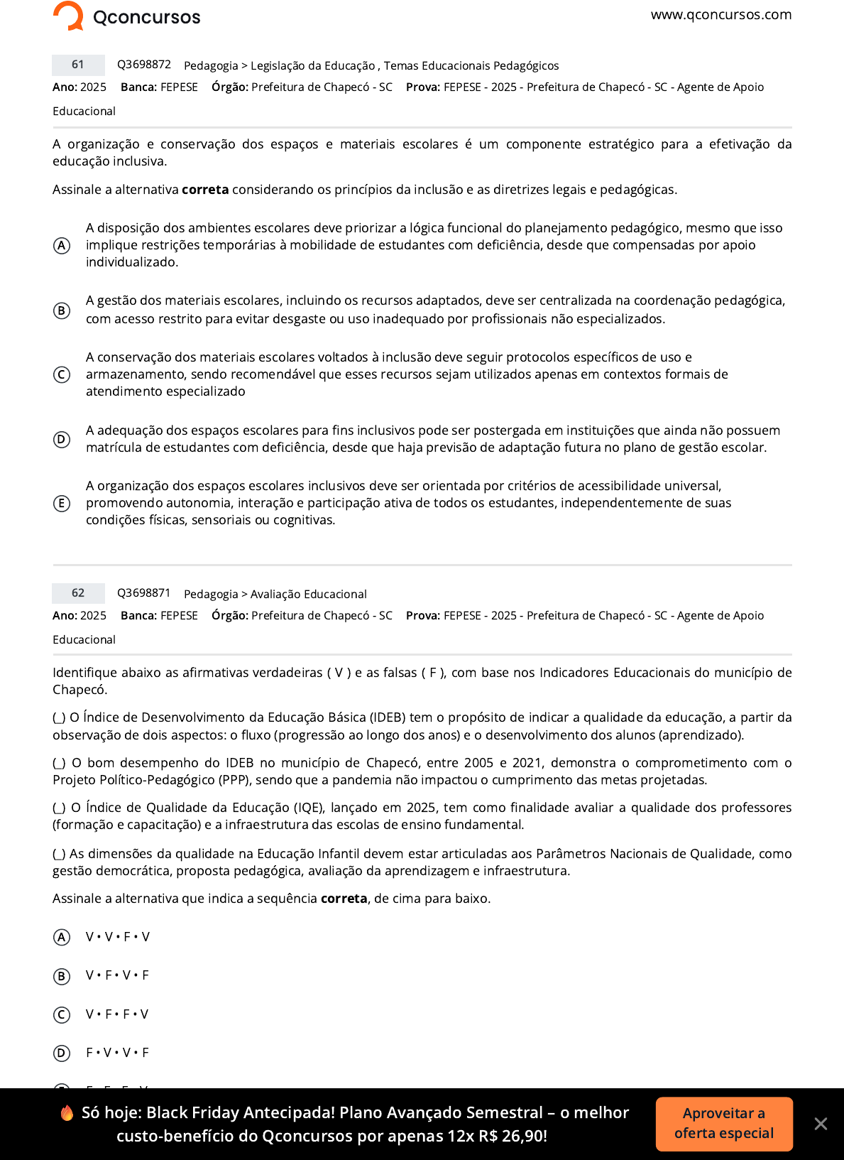 www.qconcursos.com Ano: 2025 Banca: FEPESE Órgão: Prefeitura de Chapecó - SC A organização e conservação dos espaços e materiais escolares é um componente estratégico para a efetivação da educação inclusiva. Assinale a alternativa correta considerando os princípios da inclusão e as diretrizes legais e pedagógicas. A A disposição dos ambientes escolares deve priorizar a lógica funcional do planejamento pedagógico, mesmo que isso implique restrições temporárias à mobilidade de estudantes com deficiência, desde que compensadas por apoio individualizado. B A gestão dos materiais escolares, incluindo os recursos adaptados, deve ser centralizada na coordenação pedagógica, com acesso restrito para evitar desgaste ou uso inadequado por profissionais não especializados. C A conservação dos materiais escolares voltados à inclusão deve seguir protocolos específicos de uso e armazenamento, sendo recomendável que esses recursos sejam utilizados apenas em contextos formais de atendimento especializado D A adequação dos espaços escolares para fins inclusivos pode ser postergada em instituições que ainda não possuem matrícula de estudantes com deficiência, desde que haja previsão de adaptação futura no plano de gestão escolar. E A organização dos espaços escolares inclusivos deve ser orientada por critérios de acessibilidade universal, promovendo autonomia, interação e participação ativa de todos os estudantes, independentemente de suas condições físicas, sensoriais ou cognitivas. Ano: 2025 Banca: FEPESE Órgão: Prefeitura de Chapecó - SC Identifique abaixo as afirmativas verdadeiras ( V ) e as falsas ( F ), com base nos Indicadores Educacionais do município de Chapecó. (_) O Índice de Desenvolvimento da Educação Básica (IDEB) tem o propósito de indicar a qualidade da educação, a partir da observação de dois aspectos: o fluxo (progressão ao longo dos anos) e o desenvolvimento dos alunos (aprendizado). (_) O bom desempenho do IDEB no município de Chapecó, entre 2005 e 2021, demonstra o comprometimento com o Projeto Político-Pedagógico (PPP), sendo que a pandemia não impactou o cumprimento das metas projetadas. (_) O Índice de Qualidade da Educação (IQE), lançado em 2025, tem como finalidade avaliar a qualidade dos professores (formação e capacitação) e a infraestrutura das escolas de ensino fundamental. (_) As dimensões da qualidade na Educação Infantil devem estar articuladas aos Parâmetros Nacionais de Qualidade, como gestão democrática, proposta pedagógica, avaliação da aprendizagem e infraestrutura. Assinale a alternativa que indica a sequência correta, de cima para baixo. A V • V • F • V B V • F • V • F C V • F • F • V D F • V • V • F E F • F • F • V 61 Q3698872 >Pedagogia Legislação da Educação , Temas Educacionais Pedagógicos Prova: FEPESE - 2025 - Prefeitura de Chapecó - SC - Agente de Apoio Educacional 62 Q3698871 >Pedagogia Avaliação Educacional Prova: FEPESE - 2025 - Prefeitura de Chapecó - SC - Agente de Apoio Educacional 🔥 Só hoje: Black Friday Antecipada! Plano Avançado Semestral – o melhor custo-benefício do Qconcursos por apenas 12x R$ 26,90! Aproveitar a oferta especial https://www.qconcursos.com/ https://www.qconcursos.com/questoes-de-concursos/bancas/fepese https://www.qconcursos.com/questoes-de-concursos/institutos/prefeitura-de-chapeco-sc https://www.qconcursos.com/questoes-de-concursos/bancas/fepese https://www.qconcursos.com/questoes-de-concursos/institutos/prefeitura-de-chapeco-sc https://www.qconcursos.com/questoes-de-concursos/questoes/869e3f3a-b6 https://www.qconcursos.com/questoes-de-concursos/disciplinas/pedagogia-pedagogia https://www.qconcursos.com/questoes-de-concursos/disciplinas/pedagogia-pedagogia/legislacao-da-educacao https://www.qconcursos.com/questoes-de-concursos/disciplinas/pedagogia-pedagogia/temas-educacionais-pedagogicos https://www.qconcursos.com/questoes-de-concursos/provas/fepese-2025-prefeitura-de-chapeco-sc-agente-de-apoio-educacional https://www.qconcursos.com/questoes-de-concursos/provas/fepese-2025-prefeitura-de-chapeco-sc-agente-de-apoio-educacional https://www.qconcursos.com/questoes-de-concursos/questoes/869bdb39-b6 https://www.qconcursos.com/questoes-de-concursos/disciplinas/pedagogia-pedagogia https://www.qconcursos.com/questoes-de-concursos/disciplinas/pedagogia-pedagogia/avaliacao-educacional https://www.qconcursos.com/questoes-de-concursos/provas/fepese-2025-prefeitura-de-chapeco-sc-agente-de-apoio-educacional https://www.qconcursos.com/questoes-de-concursos/provas/fepese-2025-prefeitura-de-chapeco-sc-agente-de-apoio-educacional Ano: 2025 Banca: FEPESE Órgão: Prefeitura de Chapecó - SC Analise as afirmativas abaixo com base na Educação Especial Escolar no município de Chapecó. 1. A busca pela justiça curricular exige que a escola reconheça e acolha as desigualdades e as diferenças presentes entre os estudantes. 2. As limitações funcionais são contextuais, ou seja, não estão exclusivamente relacionadas ao indivíduo, mas também às barreiras sociais e ambientais. 3. A adequação ou adaptação curricular constitui um processo dinâmico e contínuo no âmbito da Educação Especial. Assinale a alternativa que indica todas as afirmativas corretas. A É correta apenas a afirmativa 2. B São corretas apenas as afirmativas 1 e 2. C São corretas apenas as afirmativas 1 e 3. D São corretas apenas as afirmativas 2 e 3. E São corretas as afirmativas 1, 2 e 3. Ano: 2025 Banca: FEPESE Órgão: Prefeitura de Chapecó - SC Identifique abaixo as afirmativas verdadeiras ( V ) e as falsas ( F ) com base nas diretrizes do Projeto Político- -Pedagógico da Rede Municipal de Ensino de Chapecó sobre leitura, escrita e alfabetização na Educação Infantil. (_) As experiências com a linguagem escrita na Educação Infantil devem estar relacionadas às práticas escolarizantes de outras etapas da Educa