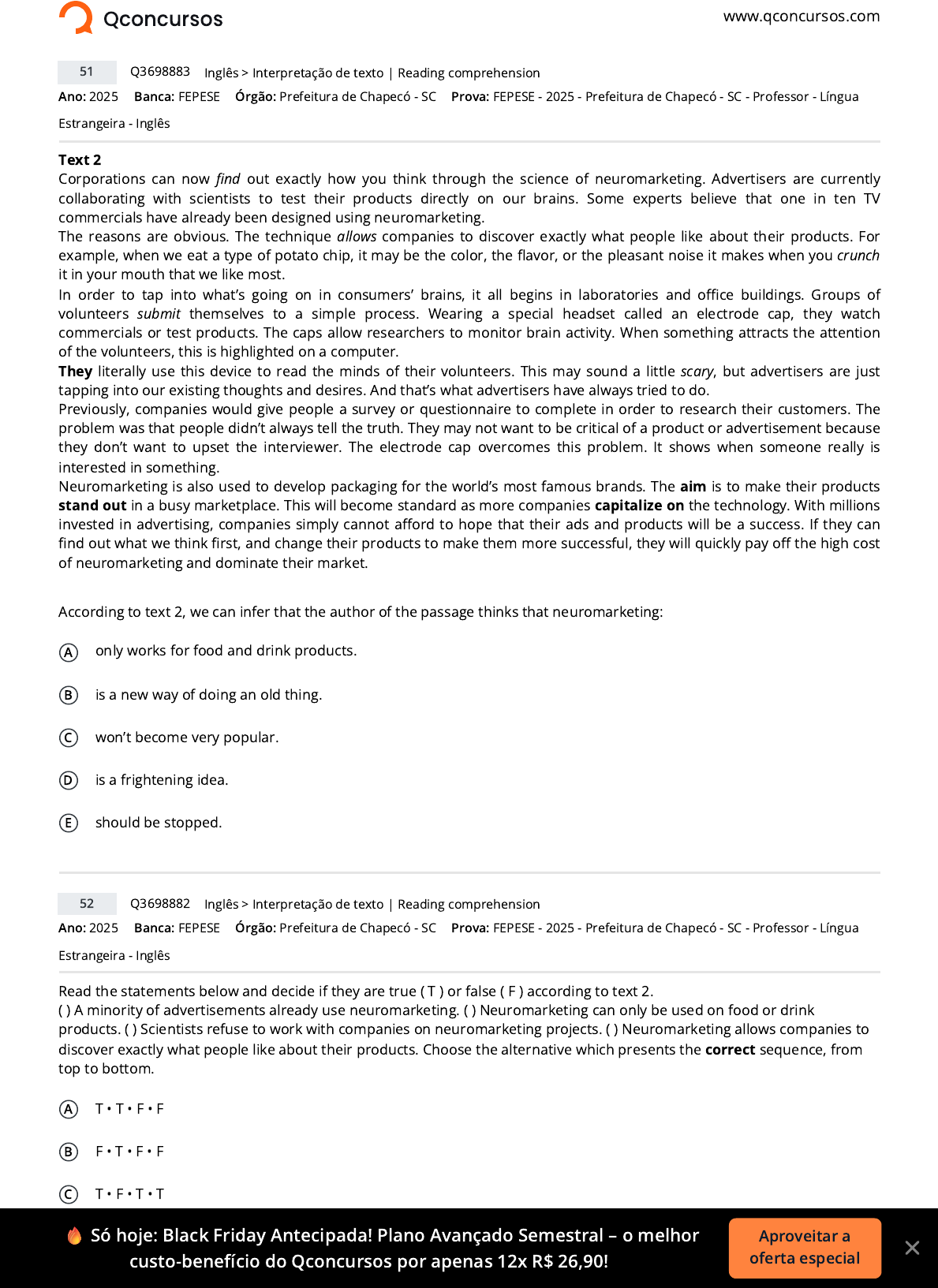www.qconcursos.com Ano: 2025 Banca: FEPESE Órgão: Prefeitura de Chapecó - SC Text 2 Corporations can now find out exactly how you think through the science of neuromarketing. Advertisers are currently collaborating with scientists to test their products directly on our brains. Some experts believe that one in ten TV commercials have already been designed using neuromarketing. The reasons are obvious. The technique allows companies to discover exactly what people like about their products. For example, when we eat a type of potato chip, it may be the color, the flavor, or the pleasant noise it makes when you crunch it in your mouth that we like most. In order to tap into what’s going on in consumers’ brains, it all begins in laboratories and office buildings. Groups of volunteers submit themselves to a simple process. Wearing a special headset called an electrode cap, they watch commercials or test products. The caps allow researchers to monitor brain activity. When something attracts the attention of the volunteers, this is highlighted on a computer. They literally use this device to read the minds of their volunteers. This may sound a little scary, but advertisers are just tapping into our existing thoughts and desires. And that’s what advertisers have always tried to do. Previously, companies would give people a survey or questionnaire to complete in order to research their customers. The problem was that people didn’t always tell the truth. They may not want to be critical of a product or advertisement because they don’t want to upset the interviewer. The electrode cap overcomes this problem. It shows when someone really is interested in something. Neuromarketing is also used to develop packaging for the world’s most famous brands. The aim is to make their products stand out in a busy marketplace. This will become standard as more companies capitalize on the technology. With millions invested in advertising, companies simply cannot afford to hope that their ads and products will be a success. If they can find out what we think first, and change their products to make them more successful, they will quickly pay off the high cost of neuromarketing and dominate their market. According to text 2, we can infer that the author of the passage thinks that neuromarketing: A only works for food and drink products. B is a new way of doing an old thing. C won’t become very popular. D is a frightening idea. E should be stopped. Ano: 2025 Banca: FEPESE Órgão: Prefeitura de Chapecó - SC Read the statements below and decide if they are true ( T ) or false ( F ) according to text 2. ( ) A minority of advertisements already use neuromarketing. ( ) Neuromarketing can only be used on food or drink products. ( ) Scientists refuse to work with companies on neuromarketing projects. ( ) Neuromarketing allows companies to discover exactly what people like about their products. Choose the alternative which presents the correct sequence, from top to bottom. A T • T • F • F B F • T • F • F C T • F • T • T D F • F • F • T 51 Q3698883 >Inglês Interpretação de texto | Reading comprehension Prova: FEPESE - 2025 - Prefeitura de Chapecó - SC - Professor - Língua Estrangeira - Inglês 52 Q3698882 >Inglês Interpretação de texto | Reading comprehension Prova: FEPESE - 2025 - Prefeitura de Chapecó - SC - Professor - Língua Estrangeira - Inglês 🔥 Só hoje: Black Friday Antecipada! Plano Avançado Semestral – o melhor custo-benefício do Qconcursos por apenas 12x R$ 26,90! Aproveitar a oferta especial https://www.qconcursos.com/ https://www.qconcursos.com/questoes-de-concursos/bancas/fepese https://www.qconcursos.com/questoes-de-concursos/institutos/prefeitura-de-chapeco-sc https://www.qconcursos.com/questoes-de-concursos/bancas/fepese https://www.qconcursos.com/questoes-de-concursos/institutos/prefeitura-de-chapeco-sc https://www.qconcursos.com/questoes-de-concursos/questoes/da10c716-b6 https://www.qconcursos.com/questoes-de-concursos/disciplinas/letras-ingles https://www.qconcursos.com/questoes-de-concursos/disciplinas/letras-ingles/interpretacao-de-texto-reading-comprehension https://www.qconcursos.com/questoes-de-concursos/provas/fepese-2025-prefeitura-de-chapeco-sc-professor-lingua-estrangeira-ingles https://www.qconcursos.com/questoes-de-concursos/provas/fepese-2025-prefeitura-de-chapeco-sc-professor-lingua-estrangeira-ingles https://www.qconcursos.com/questoes-de-concursos/questoes/da0e4735-b6 https://www.qconcursos.com/questoes-de-concursos/disciplinas/letras-ingles https://www.qconcursos.com/questoes-de-concursos/disciplinas/letras-ingles/interpretacao-de-texto-reading-comprehension https://www.qconcursos.com/questoes-de-concursos/provas/fepese-2025-prefeitura-de-chapeco-sc-professor-lingua-estrangeira-ingles https://www.qconcursos.com/questoes-de-concursos/provas/fepese-2025-prefeitura-de-chapeco-sc-professor-lingua-estrangeira-ingles E T • F • F • T Ano: 2025 Banca: FEPESE Órgão: Prefeitura de Chapecó - SC Text 1 Chapecó is a municipality in the state of Santa Catarina, in the Southern Region of Brazil. Being a major industrial, financial and educational center, it is a major producer of industrialized food products. Considered a medium city, with a population estimated at 224,013 inhabitants, it is among the four most important cities in the state. It belongs to the Meso-region of Western Santa Catarina and to the Microregion of Chapecó. Distant 550 km.......................the state capital, Florianópolis, it is Headquarters of the Metropolitan Region.......................Chapecó, and exerts significant influence not....................... in the Catarinense West but.......................in the Northwest Rio Grande do Sul and Southwest of Paraná, from an economic, cultural, or political point of view. Chapecó became known worldwide through its association football club Chapecoense and the aftermath of LaMia Flight 2933 which killed 71,