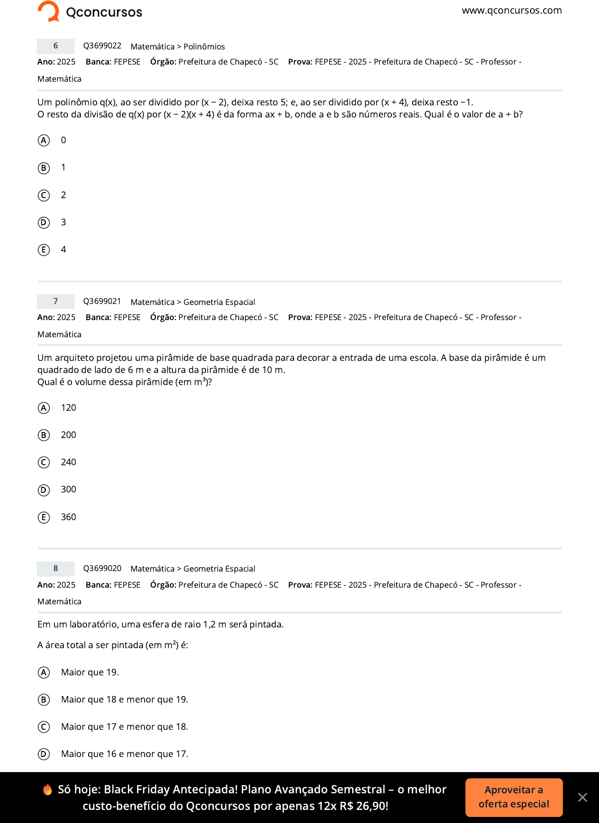 www.qconcursos.com Ano: 2025 Banca: FEPESE Órgão: Prefeitura de Chapecó - SC Um polinômio q(x), ao ser dividido por (x − 2), deixa resto 5; e, ao ser dividido por (x + 4), deixa resto −1. O resto da divisão de q(x) por (x − 2)(x + 4) é da forma ax + b, onde a e b são números reais. Qual é o valor de a + b? A 0 B 1 C 2 D 3 E 4 Ano: 2025 Banca: FEPESE Órgão: Prefeitura de Chapecó - SC Um arquiteto projetou uma pirâmide de base quadrada para decorar a entrada de uma escola. A base da pirâmide é um quadrado de lado de 6 m e a altura da pirâmide é de 10 m. Qual é o volume dessa pirâmide (em m³)? A 120 B 200 C 240 D 300 E 360 Ano: 2025 Banca: FEPESE Órgão: Prefeitura de Chapecó - SC Em um laboratório, uma esfera de raio 1,2 m será pintada. A área total a ser pintada (em m²) é: A Maior que 19. B Maior que 18 e menor que 19. C Maior que 17 e menor que 18. D Maior que 16 e menor que 17. E Menor que 16. 6 Q3699022 >Matemática Polinômios Prova: FEPESE - 2025 - Prefeitura de Chapecó - SC - Professor - Matemática 7 Q3699021 >Matemática Geometria Espacial Prova: FEPESE - 2025 - Prefeitura de Chapecó - SC - Professor - Matemática 8 Q3699020 >Matemática Geometria Espacial Prova: FEPESE - 2025 - Prefeitura de Chapecó - SC - Professor - Matemática 🔥 Só hoje: Black Friday Antecipada! Plano Avançado Semestral – o melhor custo-benefício do Qconcursos por apenas 12x R$ 26,90! Aproveitar a oferta especial https://www.qconcursos.com/ https://www.qconcursos.com/questoes-de-concursos/bancas/fepese https://www.qconcursos.com/questoes-de-concursos/institutos/prefeitura-de-chapeco-sc https://www.qconcursos.com/questoes-de-concursos/bancas/fepese https://www.qconcursos.com/questoes-de-concursos/institutos/prefeitura-de-chapeco-sc https://www.qconcursos.com/questoes-de-concursos/bancas/fepese https://www.qconcursos.com/questoes-de-concursos/institutos/prefeitura-de-chapeco-sc https://www.qconcursos.com/questoes-de-concursos/questoes/670e291a-b6 https://www.qconcursos.com/questoes-de-concursos/disciplinas/matematica-matematica https://www.qconcursos.com/questoes-de-concursos/disciplinas/matematica-matematica/polinomios https://www.qconcursos.com/questoes-de-concursos/provas/fepese-2025-prefeitura-de-chapeco-sc-professor-matematica https://www.qconcursos.com/questoes-de-concursos/provas/fepese-2025-prefeitura-de-chapeco-sc-professor-matematica https://www.qconcursos.com/questoes-de-concursos/questoes/670b682a-b6 https://www.qconcursos.com/questoes-de-concursos/disciplinas/matematica-matematica https://www.qconcursos.com/questoes-de-concursos/disciplinas/matematica-matematica/geometria-espacial https://www.qconcursos.com/questoes-de-concursos/provas/fepese-2025-prefeitura-de-chapeco-sc-professor-matematica https://www.qconcursos.com/questoes-de-concursos/provas/fepese-2025-prefeitura-de-chapeco-sc-professor-matematica https://www.qconcursos.com/questoes-de-concursos/questoes/6708b2c9-b6 https://www.qconcursos.com/questoes-de-concursos/disciplinas/matematica-matematica https://www.qconcursos.com/questoes-de-concursos/disciplinas/matematica-matematica/geometria-espacial https://www.qconcursos.com/questoes-de-concursos/provas/fepese-2025-prefeitura-de-chapeco-sc-professor-matematica https://www.qconcursos.com/questoes-de-concursos/provas/fepese-2025-prefeitura-de-chapeco-sc-professor-matematica Ano: 2025 Banca: FEPESE Órgão: Prefeitura de Chapecó - SC Para armazenar água da chuva em uma escola, será instalado um reservatório cilíndrico com raio de 2,5 m e altura de 3 m. O volume do reservatório (em m³) é: A Maior que 61. B Maior que 60 e menor que 61. C Maior que 59 e menor que 60. D Maior que 58 e menor que 59. E Menor que 58. Ano: 2025 Banca: FEPESE Órgão: Prefeitura de Chapecó - SC O pátio retangular da escola mede 20 m por 12 m. Será construída, na parte interna, uma faixa pavimentada de 1,5 m de largura ao redor de todo o pátio. A área dessa faixa (em m²) é: A Maior que 92. B Maior que 89 e menor que 92. C Maior que 86 e menor que 89. D Maior que 83 e menor que 86. E Menor que 83. Respostas 6: E 7: A 8: B 9: D 10: C www.qconcursos.com 9 Q3699019 >Matemática Geometria Espacial Prova: FEPESE - 2025 - Prefeitura de Chapecó - SC - Professor - Matemática 10 Q3699018 >Matemática Geometria Plana Prova: FEPESE - 2025 - Prefeitura de Chapecó - SC - Professor - Matemática 🔥 Só hoje: Black Friday Antecipada! Plano Avançado Semestral – o melhor custo-benefício do Qconcursos por apenas 12x R$ 26,90! https://www.qconcursos.com/questoes-de-concursos/bancas/fepese https://www.qconcursos.com/questoes-de-concursos/institutos/prefeitura-de-chapeco-sc https://www.qconcursos.com/questoes-de-concursos/bancas/fepese https://www.qconcursos.com/questoes-de-concursos/institutos/prefeitura-de-chapeco-sc https://www.qconcursos.com/ https://www.qconcursos.com/questoes-de-concursos/questoes/670617ec-b6 https://www.qconcursos.com/questoes-de-concursos/disciplinas/matematica-matematica https://www.qconcursos.com/questoes-de-concursos/disciplinas/matematica-matematica/geometria-espacial https://www.qconcursos.com/questoes-de-concursos/provas/fepese-2025-prefeitura-de-chapeco-sc-professor-matematica https://www.qconcursos.com/questoes-de-concursos/provas/fepese-2025-prefeitura-de-chapeco-sc-professor-matematica https://www.qconcursos.com/questoes-de-concursos/questoes/67037c27-b6 https://www.qconcursos.com/questoes-de-concursos/disciplinas/matematica-matematica https://www.qconcursos.com/questoes-de-concursos/disciplinas/matematica-matematica/geometria-plana https://www.qconcursos.com/questoes-de-concursos/provas/fepese-2025-prefeitura-de-chapeco-sc-professor-matematica https://www.qconcursos.com/questoes-de-concursos/provas/fepese-2025-prefeitura-de-chapeco-sc-professor-matematica