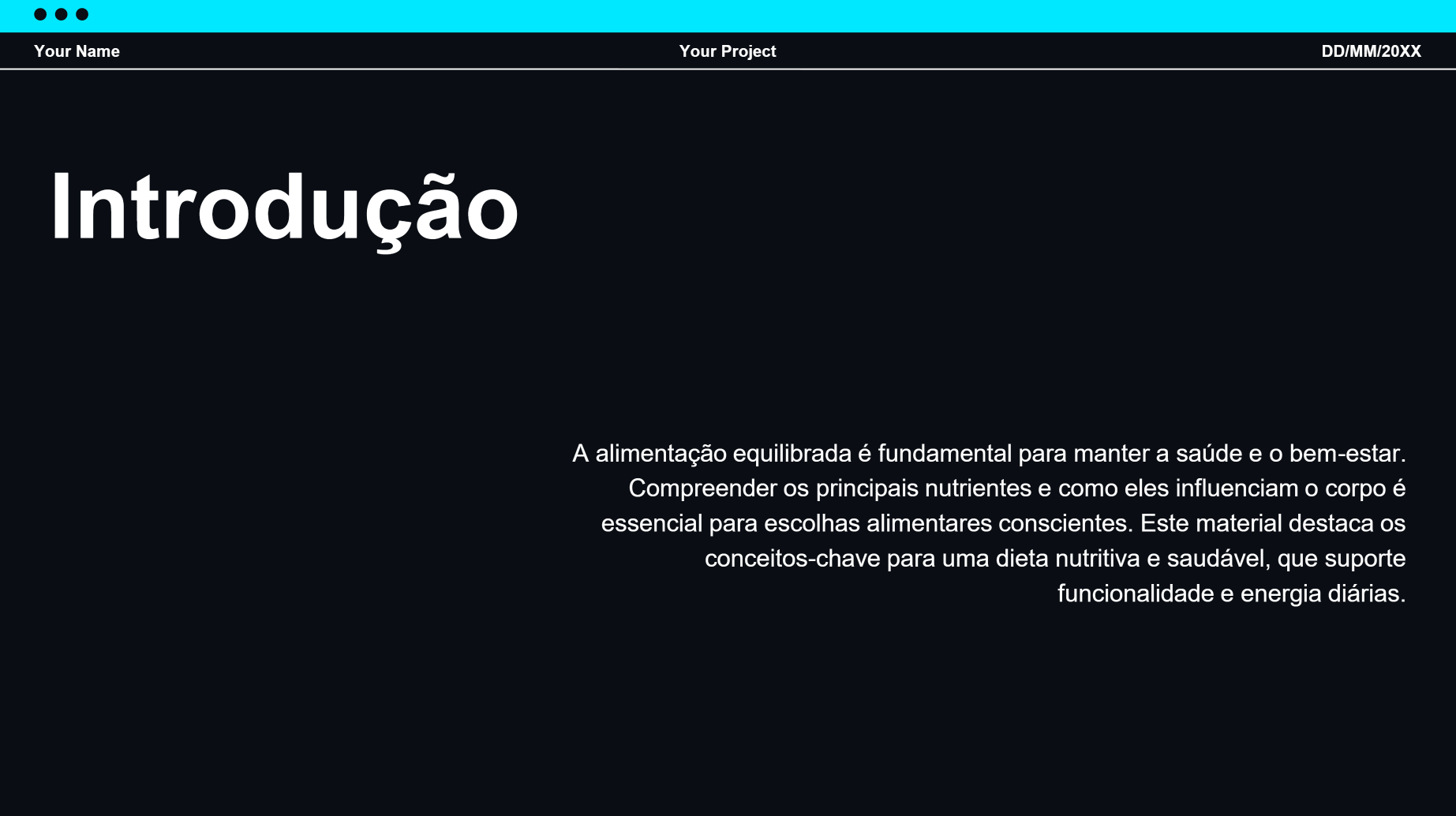 Your Name Your Project DD/MM/20XX Introdução A alimentação equilibrada é fundamental para manter a saúde e bem-estar. Compreender os principais nutrientes e como eles influenciam corpo é essencial para escolhas alimentares conscientes. Este material destaca os conceitos-chave para uma dieta nutritiva e saudável, que suporte funcionalidade e energia diárias.