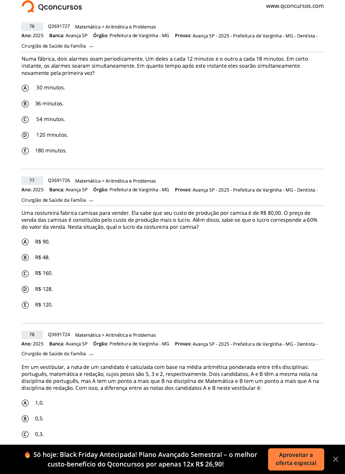 www.qconcursos.com Ano: 2025 Banca: Avança SP Órgão: Prefeitura de Varginha - MG Numa fábrica, dois alarmes soam periodicamente. Um deles a cada 12 minutos e o outro a cada 18 minutos. Em certo instante, os alarmes soaram simultaneamente. Em quanto tempo após este instante eles soarão simultaneamente novamente pela primeira vez? A 30 minutos. B 36 minutos. C 54 minutos. D 120 minutos. E 180 minutos. Ano: 2025 Banca: Avança SP Órgão: Prefeitura de Varginha - MG Uma costureira fabrica camisas para vender. Ela sabe que seu custo de produção por camisa é de R$ 80,00. O preço de venda das camisas é constituído pelo custo de produção mais o lucro. Além disso, sabe-se que o lucro corresponde a 60% do valor da venda. Nesta situação, qual o lucro da costureira por camisa? A R$ 90. B R$ 48. C R$ 160. D R$ 128. E R$ 120. Ano: 2025 Banca: Avança SP Órgão: Prefeitura de Varginha - MG Em um vestibular, a nota de um candidato é calculada com base na média aritmética ponderada entre três disciplinas: português, matemática e redação, cujos pesos são 5, 3 e 2, respectivamente. Dois candidatos, A e B têm a mesma nota na disciplina de português, mas A tem um ponto a mais que B na disciplina de Matemática e B tem um ponto a mais que A na disciplina de redação. Com isso, a diferença entre as notas dos candidatos A e B neste vestibular é: A 1,0. B 0,5. C 0,3. D 0,2. 76 Q3691727 >Matemática Aritmética e Problemas Provas: Avança SP - 2025 - Prefeitura de Varginha - MG - Dentista - Cirurgião de Saúde da Família ... 77 Q3691726 >Matemática Aritmética e Problemas Provas: Avança SP - 2025 - Prefeitura de Varginha - MG - Dentista - Cirurgião de Saúde da Família ... 78 Q3691724 >Matemática Aritmética e Problemas Provas: Avança SP - 2025 - Prefeitura de Varginha - MG - Dentista - Cirurgião de Saúde da Família ... 🔥 Só hoje: Black Friday Antecipada! Plano Avançado Semestral – o melhor custo-benefício do Qconcursos por apenas 12x R$ 26,90! Aproveitar a oferta especial https://www.qconcursos.com/ https://www.qconcursos.com/questoes-de-concursos/bancas/avanca-sp https://www.qconcursos.com/questoes-de-concursos/institutos/prefeitura-de-varginha-mg https://www.qconcursos.com/questoes-de-concursos/bancas/avanca-sp https://www.qconcursos.com/questoes-de-concursos/institutos/prefeitura-de-varginha-mg https://www.qconcursos.com/questoes-de-concursos/bancas/avanca-sp https://www.qconcursos.com/questoes-de-concursos/institutos/prefeitura-de-varginha-mg https://www.qconcursos.com/questoes-de-concursos/questoes/567ea2d2-b4 https://www.qconcursos.com/questoes-de-concursos/disciplinas/matematica-matematica https://www.qconcursos.com/questoes-de-concursos/disciplinas/matematica-matematica/aritmetica-e-problemas https://www.qconcursos.com/questoes-de-concursos/provas/avanca-sp-2025-prefeitura-de-varginha-mg-dentista-cirurgiao-de-saude-da-familia https://www.qconcursos.com/questoes-de-concursos/provas/avanca-sp-2025-prefeitura-de-varginha-mg-dentista-cirurgiao-de-saude-da-familia https://www.qconcursos.com/questoes-de-concursos/questoes/567bdbfd-b4 https://www.qconcursos.com/questoes-de-concursos/disciplinas/matematica-matematica https://www.qconcursos.com/questoes-de-concursos/disciplinas/matematica-matematica/aritmetica-e-problemas https://www.qconcursos.com/questoes-de-concursos/provas/avanca-sp-2025-prefeitura-de-varginha-mg-dentista-cirurgiao-de-saude-da-familia https://www.qconcursos.com/questoes-de-concursos/provas/avanca-sp-2025-prefeitura-de-varginha-mg-dentista-cirurgiao-de-saude-da-familia https://www.qconcursos.com/questoes-de-concursos/questoes/5676552e-b4 https://www.qconcursos.com/questoes-de-concursos/disciplinas/matematica-matematica https://www.qconcursos.com/questoes-de-concursos/disciplinas/matematica-matematica/aritmetica-e-problemas https://www.qconcursos.com/questoes-de-concursos/provas/avanca-sp-2025-prefeitura-de-varginha-mg-dentista-cirurgiao-de-saude-da-familia https://www.qconcursos.com/questoes-de-concursos/provas/avanca-sp-2025-prefeitura-de-varginha-mg-dentista-cirurgiao-de-saude-da-familia E 0,1. Ano: 2025 Banca: Avança SP Órgão: Prefeitura de Varginha - MG A figura abaixo mostra um quadrado ABCD de lado L e dois triângulos ABE e CDF, onde E e F são os pontos médios dos segmentos CD e AB, respectivamente. A área de interseção entre os dois triângulos (área sombreada da figura) é dada por: A L /2. B L /4. C L /6. D L /8. E L /16. Ano: 2025 Banca: Avança SP Órgão: Prefeitura de Varginha - MG Em uma empresa, 40% dos funcionários utilizam carro para ir ao trabalho, 50% utilizam transporte público e 20% utilizam ambos. Se o total de funcionários é de 600 pessoas, quantos não utilizam nem carro nem transporte público para ir ao trabalho? A 140 B 120 C 160 D 100 E 180 Respostas 76: B 77: E 78: E 79: B 80: E 79 Q3691723 >Matemática Geometria Plana Provas: Avança SP - 2025 - Prefeitura de Varginha - MG - Dentista - Cirurgião de Saúde da Família ... 2 2 2 2 2 80 Q3691722 >Matemática Aritmética e Problemas Provas: Avança SP - 2025 - Prefeitura de Varginha - MG - Dentista - Cirurgião de Saúde da Família ... 🔥 Só hoje: Black Friday Antecipada! Plano Avançado Semestral – o melhor custo-benefício do Qconcursos por apenas 12x R$ 26,90! https://www.qconcursos.com/questoes-de-concursos/bancas/avanca-sp https://www.qconcursos.com/questoes-de-concursos/institutos/prefeitura-de-varginha-mg https://www.qconcursos.com/questoes-de-concursos/bancas/avanca-sp https://www.qconcursos.com/questoes-de-concursos/institutos/prefeitura-de-varginha-mg https://www.qconcursos.com/questoes-de-concursos/questoes/5673e8ba-b4 https://www.qconcursos.com/questoes-de-concursos/disciplinas/matematica-matematica https://www.qconcursos.com/questoes-de-concursos/disciplinas/matematica-matematica/geometria-plana https://www.qconcursos.com/questoes-de-concursos/provas/avanca-sp-2025-prefeitura-de-varginha-mg-dentista-cirurgiao-de-saude-da-familia http