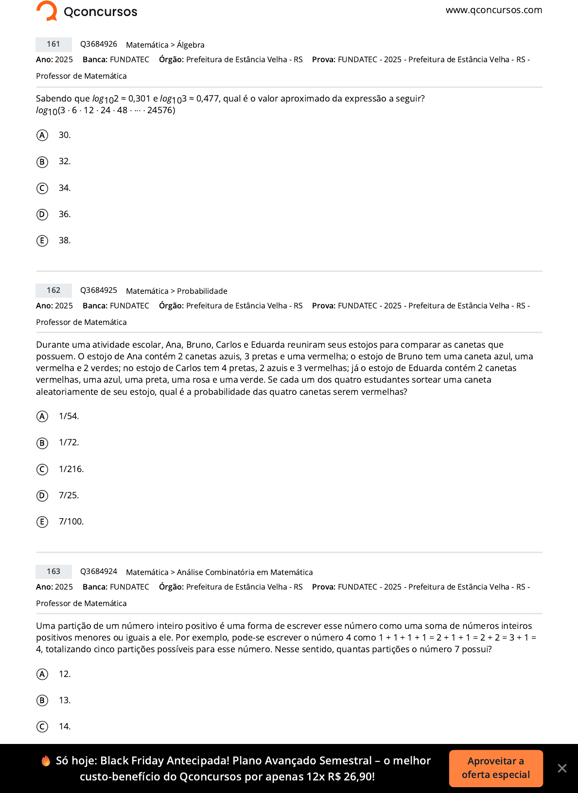 www.qconcursos.com Ano: 2025 Banca: FUNDATEC Órgão: Prefeitura de Estância Velha - RS Sabendo que log 2 ≈ 0,301 e log 3 ≈ 0,477, qual é o valor aproximado da expressão a seguir? log (3 ⋅ 6 ⋅ 12 ⋅ 24 ⋅ 48 ⋅ ⋅⋅⋅ ⋅ 24576) A 30. B 32. C 34. D 36. E 38. Ano: 2025 Banca: FUNDATEC Órgão: Prefeitura de Estância Velha - RS Durante uma atividade escolar, Ana, Bruno, Carlos e Eduarda reuniram seus estojos para comparar as canetas que possuem. O estojo de Ana contém 2 canetas azuis, 3 pretas e uma vermelha; o estojo de Bruno tem uma caneta azul, uma vermelha e 2 verdes; no estojo de Carlos tem 4 pretas, 2 azuis e 3 vermelhas; já o estojo de Eduarda contém 2 canetas vermelhas, uma azul, uma preta, uma rosa e uma verde. Se cada um dos quatro estudantes sortear uma caneta aleatoriamente de seu estojo, qual é a probabilidade das quatro canetas serem vermelhas? A 1/54. B 1/72. C 1/216. D 7/25. E 7/100. Ano: 2025 Banca: FUNDATEC Órgão: Prefeitura de Estância Velha - RS Uma partição de um número inteiro positivo é uma forma de escrever esse número como uma soma de números inteiros positivos menores ou iguais a ele. Por exemplo, pode-se escrever o número 4 como 1 + 1 + 1 + 1 = 2 + 1 + 1 = 2 + 2 = 3 + 1 = 4, totalizando cinco partições possíveis para esse número. Nesse sentido, quantas partições o número 7 possui? A 12. B 13. C 14. D 15. 161 Q3684926 >Matemática Álgebra Prova: FUNDATEC - 2025 - Prefeitura de Estância Velha - RS - Professor de Matemática 10 10 10 162 Q3684925 >Matemática Probabilidade Prova: FUNDATEC - 2025 - Prefeitura de Estância Velha - RS - Professor de Matemática 163 Q3684924 >Matemática Análise Combinatória em Matemática Prova: FUNDATEC - 2025 - Prefeitura de Estância Velha - RS - Professor de Matemática 🔥 Só hoje: Black Friday Antecipada! Plano Avançado Semestral – o melhor custo-benefício do Qconcursos por apenas 12x R$ 26,90! Aproveitar a oferta especial https://www.qconcursos.com/ https://www.qconcursos.com/questoes-de-concursos/bancas/fundatec https://www.qconcursos.com/questoes-de-concursos/institutos/prefeitura-de-estancia-velha-rs https://www.qconcursos.com/questoes-de-concursos/bancas/fundatec https://www.qconcursos.com/questoes-de-concursos/institutos/prefeitura-de-estancia-velha-rs https://www.qconcursos.com/questoes-de-concursos/bancas/fundatec https://www.qconcursos.com/questoes-de-concursos/institutos/prefeitura-de-estancia-velha-rs https://www.qconcursos.com/questoes-de-concursos/questoes/34f6471a-b2 https://www.qconcursos.com/questoes-de-concursos/disciplinas/matematica-matematica https://www.qconcursos.com/questoes-de-concursos/disciplinas/matematica-matematica/algebra https://www.qconcursos.com/questoes-de-concursos/provas/fundatec-2025-prefeitura-de-estancia-velha-rs-professor-de-matematica https://www.qconcursos.com/questoes-de-concursos/provas/fundatec-2025-prefeitura-de-estancia-velha-rs-professor-de-matematica https://www.qconcursos.com/questoes-de-concursos/questoes/34f330f3-b2 https://www.qconcursos.com/questoes-de-concursos/disciplinas/matematica-matematica https://www.qconcursos.com/questoes-de-concursos/disciplinas/matematica-matematica/probabilidade https://www.qconcursos.com/questoes-de-concursos/provas/fundatec-2025-prefeitura-de-estancia-velha-rs-professor-de-matematica https://www.qconcursos.com/questoes-de-concursos/provas/fundatec-2025-prefeitura-de-estancia-velha-rs-professor-de-matematica https://www.qconcursos.com/questoes-de-concursos/questoes/34f03f48-b2 https://www.qconcursos.com/questoes-de-concursos/disciplinas/matematica-matematica https://www.qconcursos.com/questoes-de-concursos/disciplinas/matematica-matematica/analise-combinatoria-em-matematica https://www.qconcursos.com/questoes-de-concursos/provas/fundatec-2025-prefeitura-de-estancia-velha-rs-professor-de-matematica https://www.qconcursos.com/questoes-de-concursos/provas/fundatec-2025-prefeitura-de-estancia-velha-rs-professor-de-matematica E 16. Ano: 2025 Banca: FUNDATEC Órgão: Prefeitura de Estância Velha - RS No intervalo (0, π] da função abaixo, há uma raiz e dois valores do domínio em que ela está indeterminada. São eles, respectivamente: A π /4, π/2, e π. B π /3, π/4, e π/2. C π/2, π/4, e 3π/4. D π, π/2, e 3π/4. E 3π/4, π/2, e π. Ano: 2025 Banca: FUNDATEC Órgão: Prefeitura de Estância Velha - RS Qual é a equação da circunferência de diâmetro 6 e centro (-4, -1)? A x + y − 8x − 2y + 8 = 0 B x + y − 4x − y − 8 = 0 C x + y − 4x − y + 8 = 0 D x + y + 8x + 2y − 8 = 0 E x + y + 8x + 2y + 8 = 0 Respostas 161: C 162: C 163: D 164: A 165: E www.qconcursos.com 164 Q3684923 >Matemática Trigonometria Prova: FUNDATEC - 2025 - Prefeitura de Estância Velha - RS - Professor de Matemática 165 Q3684922 >Matemática Geometria Plana , Geometria Analítica Prova: FUNDATEC - 2025 - Prefeitura de Estância Velha - RS - Professor de Matemática 2 2 2 2 2 2 2 2 2 2 🔥 Só hoje: Black Friday Antecipada! Plano Avançado Semestral – o melhor custo-benefício do Qconcursos por apenas 12x R$ 26,90! https://www.qconcursos.com/questoes-de-concursos/bancas/fundatec https://www.qconcursos.com/questoes-de-concursos/institutos/prefeitura-de-estancia-velha-rs https://www.qconcursos.com/questoes-de-concursos/bancas/fundatec https://www.qconcursos.com/questoes-de-concursos/institutos/prefeitura-de-estancia-velha-rs https://www.qconcursos.com/ https://www.qconcursos.com/questoes-de-concursos/questoes/34ecd87b-b2 https://www.qconcursos.com/questoes-de-concursos/disciplinas/matematica-matematica https://www.qconcursos.com/questoes-de-concursos/disciplinas/matematica-matematica/trigonometria https://www.qconcursos.com/questoes-de-concursos/provas/fundatec-2025-prefeitura-de-estancia-velha-rs-professor-de-matematica https://www.qconcursos.com/questoes-de-concursos/provas/fundatec-2025-prefeitura-de-estancia-velha-rs-professor-de-matematica https://www.qconcursos.com/questoes-de-concursos/questoes/34e9