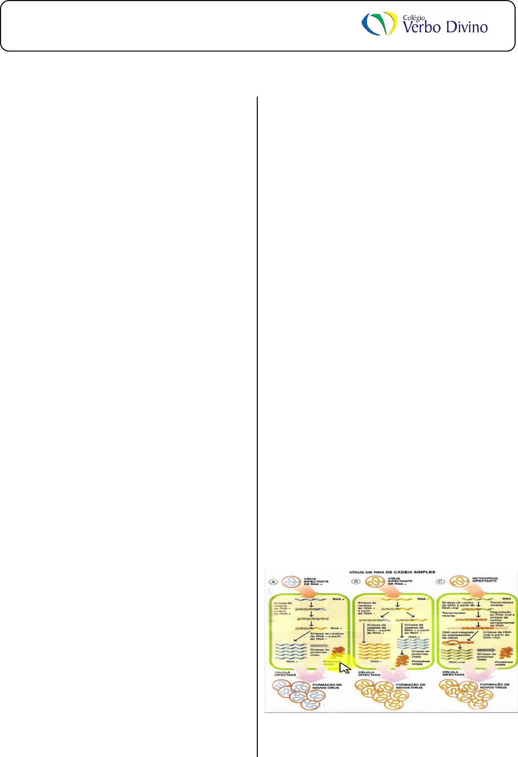 MATERIAL DE ESTUDO BIOLOGIA I 1º ANO EM I Prof. Cristiano Ruela 1 Fazer leitura do capitulo 2 frente B (Vírus) e exercícios das páginas 191 a 195. Resumo de Biologia Virus Os vírus são seres muito simples e pequenos (medem menos de 0,2 µm), formados basicamente por uma cápsula proteica envolvendo o material genético, que, dependendo do tipo de vírus, pode ser o DNA, RNA ou os dois juntos (citomegalovírus). A palavra vírus vem do Latim vírus que significa fluído venenoso ou toxina. Atualmente é utilizada para descrever os vírus biológicos, além de designar, metaforicamente, qualquer coisa que se reproduza de forma parasitária, como ideias. O termo vírus de computador nasceu por analogia. A palavra vírion ou víron é usada para se referir a uma única partícula viral que estiver fora da célula hospedeira. Das 1.739.600 espécies de seres vivos conhecidos, os vírus representam 3.600 espécies. Vírus é uma partícula basicamente proteica que pode infectar organismos vivos. Vírus são parasitas obrigatórios do interior celular e isso significa que eles somente se reproduzem pela invasão e possessão do controle da maquinaria de auto-reprodução celular. O termo vírus geralmente refere-se às partículas que infectam eucariontes (organismos cujas células têm carioteca), enquanto o termo bacteriófago ou fago é utilizado para descrever aqueles que infectam procariontes (domínios bacteria e archaea). Tipicamente, estas partículas carregam uma pequena quantidade de ácido nucleico (seja DNA ou RNA, ou os dois) sempre envolto por uma cápsula proteica denominada capsídeo. As proteínas que compõe o capsídeo são específicas para cada tipo de vírus. O capsídeo mais o ácido nucleico que ele envolve são denominados nucleocapsídeo. Alguns vírus são formados apenas pelo núcleo capsídeo, outros no entanto, possuem um envoltório ou envelope externo ao nucleocapsídeo. Esses vírus são denominados vírus encapsulados ou envelopados. O envelope consiste principalmente em duas camadas de lipídios derivadas da membrana plasmática da célula hospedeira e em moléculas de proteínas virais, específicas para cada tipo de vírus, imersas nas camadas de lipídios. São as moléculas de proteínas virais que determinam qual tipo de célula o vírus irá infectar. Geralmente, o grupo de células que um tipo de vírus infecta é bastante restrito. Existem vírus que infectam apenas bactérias, denominadas bacteriófagos, os que infectam apenas fungos, denominados micófagos; os que infectam as plantas e os que infectam os animais, denominados, respectivamente, vírus de plantas e vírus de animais. Os vírus não são constituídos por células, embora dependam delas para a sua multiplicação. Alguns vírus possuem enzimas. Por exemplo o HIV tem a enzima Transcriptase reversa que faz com que o processo de Transcrição reversa seja realizado (formação de DNA a partir do RNA viral). Esse processo de se formar DNA a partir de RNA viral é denominado retrotranscrição, o que deu o nome retrovírus aos vírus que realizam esse processo. Os outros vírus que possuem DNA fazem o processo de transcrição (passagem da linguagem de DNA para RNA) e só depois a tradução. Estes últimos vírus são designados de adenovírus. Vírus são parasitas intracelulares obrigatórios: a falta de hialoplasma e ribossomos impede que eles tenham metabolismo próprio. Assim, para executar o seu ciclo de vida, o vírus precisa de um ambiente que tenha esses componentes. Esse ambiente precisa ser o interior de uma célula que, contendo ribossomos e outras substâncias, efetuará a síntese das proteínas dos vírus e, simultaneamente, permitirá que ocorra a multiplicação do material genético viral. Em muitos casos os vírus modificam o metabolismo da célula que parasitam, podendo provocar a sua degeneração e morte. Para isso, é preciso que o vírus inicialmente entre na célula: muitas vezes ele adere à parede da célula e "injeta" o seu material genético ou então entra na célula por englobamento - por um processo que lembra a fagocitose, a célula "engole" o vírus e o introduz no seu interior. Vírus, seres vivos ou não? http://www.sobiologia.com.br/conteudos/Seresvivos/Ciencias/biovirus2.php MATERIAL DE ESTUDO BIOLOGIA I 1º ANO EM I Prof. Cristiano Ruela 2 Vírus não têm qualquer atividade metabólica quando fora da célula hospedeira: eles não podem captar nutrientes, utilizar energia ou realizar qualquer atividade biossintética. Eles obviamente se reproduzem, mas diferentemente de células, que crescem, duplicam seu conteúdo para então dividir-se em duas células filhas, os vírus replicam-se através de uma estratégia completamente diferente: eles invadem células, o que causa a dissociação dos componentes da partícula viral; esses componentes então interagem com o aparato metabólico da célula hospedeira, subvertendo o metabolismo celular para a produção de mais vírus. Há grande debate na comunidade científica sobre se os vírus devem ser considerados seres vivos ou não, e esse debate e primariamente um resultado de diferentes percepções sobre o que vem a ser vida, em outras palavras, a definição de vida. Aqueles que defendem a ideia que os vírus não são vivos argumentam que organismos vivos devem possuir características como a habilidade de importar nutrientes e energia do ambiente, devem ter metabolismo (um conjunto de reações químicas altamente inter-relacionadas através das quais os seres vivos constroem e mantêm seus corpos, crescem e performam inúmeras outras tarefas, como locomoção, reprodução, etc.); organismos vivos também fazem parte de uma linhagem contínua, sendo necessariamente originados de seres semelhantes e, através da reprodução, gerar outros seres semelhantes (descendência ou prole), etc. Os vírus preenchem alguns desses critérios: são parte de linhagens contínuas, reproduzem-se e evoluem em resp
