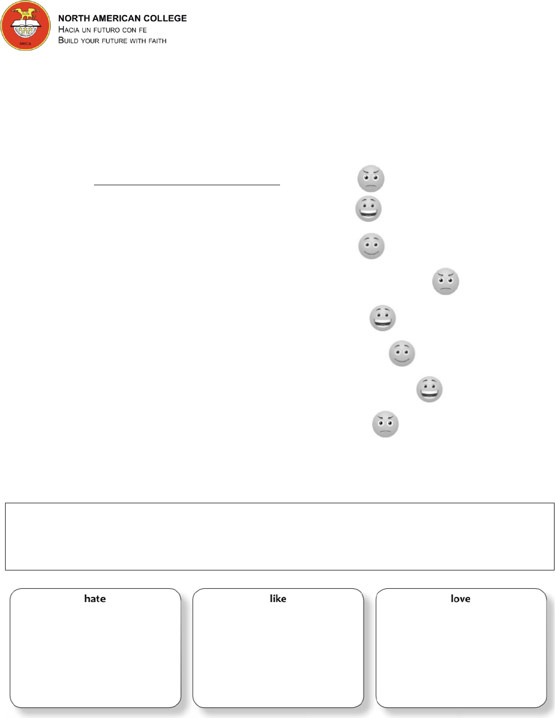 GUÍA 4 INGLÉS 6TOS I. Realizar ejercicios 1 y 2 de la página 155 del libro Stopwatch (2019) II. Mira y completa en el cuaderno usando la forma correcta de like, love o hate. 1. My sister hates swimming. 2. Paola ____________________________ waterskiing. 3. I ____________________________ practicing sports. 4. My sister ____________________________ watching horror movies. 5. My mom ____________________________ getting a tan. 6. Omar ____________________________ mountain climbing. 7. My sister ____________________________ shopping at the mall. 8. Kevin ____________________________ bathing the dog. III. En tu cuaderno, clasifica cómo te sientes sobre las actividades escribiendo cada actividad en la caja correspondiente. dancing - cleaning your room - texting - playing soccer - watching tennis on TV cooking - going to the gym - doing homework - feeding your pet eating broccoli - going shopping - riding the bus - playing video games CORPORACIÓN EDUCACIONAL PATRICIA ESPINOZA CAVIERES 2