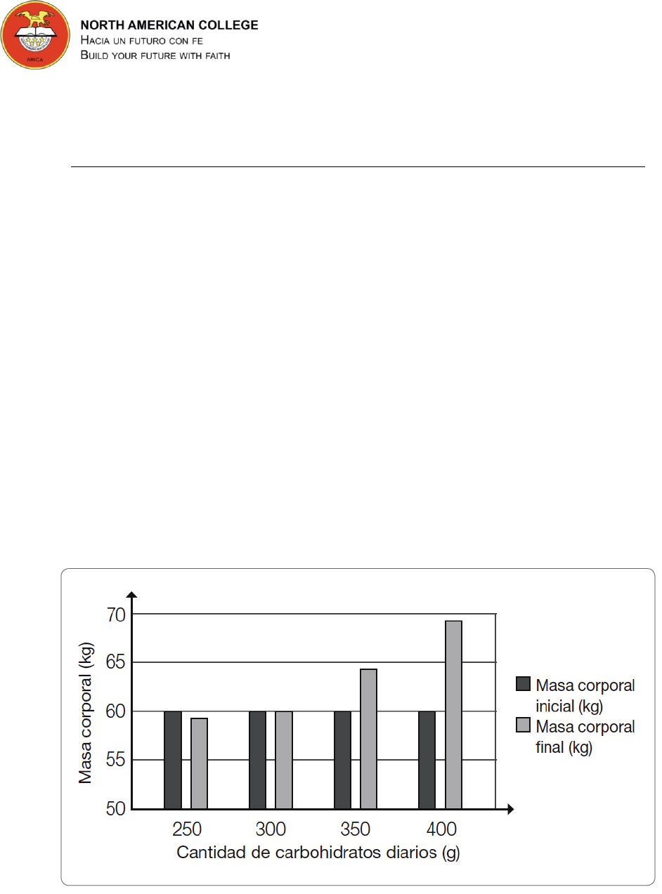 GUIA 02 CIENCIAS NATURALES SEXTO BÁSICO TRABAJO DE APLICACIÓN DE CIENCIAS NATURALES SEXTO BÁSICO OBJETIVOS: Identificar y señalar la diferencia entre nutrición y alimentación. Identificar y señalar la función biológica de algunos nutrientes. Identificar y señalar los efectos de algunas sustancias ajenas al organismo en el desarrollo de enfermedades. Identificar y señalar los efectos que provocan algunos agentes patógenos y microorganismos en el ser humano. Identificar y señalar un concepto integral de salud, y valorar sus proyecciones personales y sociales. ENCIERRA LA ALTERNATIVA CORRECTA. 1) Un nutricionista recopiló información sobre el efecto del consumo de carbohidratos en la masa corporal de diferentes personas. Sus resultados se muestran a continuación: A partir de los resultados, ¿qué pudo concluir el nutricionista sobre el efecto de los carbohidratos en la masa corporal de las personas? A) Una dieta con 350 g de carbohidratos es la ideal para mantener la masa corporal. B) Una dieta que contiene más de 300 g de carbohidratos diarios favorece el aumento de masa corporal. C) Una dieta con 300 g o menos de carbohidratos promueven la pérdida de masa corporal. D) Una dieta que contiene carbohidratos promueve el aumento de masa corporal. CORPORACIÓN EDUCACIONAL PATRICIA ESPINOZA CAVIERES 2 2) ¿Cuál de las siguientes opciones, en relación con los microorganismos utilizados para elaborar alimentos, es incorrecta? A) Bacteria – Yogur. B) Hongo – Pan. C) Hongo – Mantequilla. D) Bacteria – Queso. 3) El tabaquismo, constituye hoy en día uno de los principales problemas de salud pública de nuestro país, responsable de alrededor de 14.000 muertes anuales, según datos del Ministerio de Salud. Esto significa que mueren 25 personas diarias, o 1 persona cada hora, a consecuencia de las enfermedades producidas por el consumo de tabaco, entre las cuales se encuentra(n): I. cáncer del pulmón. II. infarto al miocardio. III. disfonía y coloración amarillenta de los dientes. Es correcta: A) I y II. B) I y III. C) II y III. D) I, II y III. 4) ¿Qué significa el término fumador pasivo? A) Persona que consume cigarrillos excesivamente. B) Persona que ha dejado de consumir cigarrillos. C) Persona que no fuma, pero que aspira el humo del cigarrillo del aire. D) Persona que habita con fumadores en una misma casa. 5) La siguiente tabla muestra los resultados de un estudio sobre el tabaco en Chile. En ella se observa la prevalencia de fumadores, es decir, el porcentaje de la población chilena que presenta la característica de ser “fumadores” y, además, el promedio de cigarros fumados diariamente. Personas mayores de 15 años Año Varones Mujeres Prevalencia de fumadores 2003 48,3 % 36,8 % 2010 44,2 % 37,1 % Promedio cigarrillos fumados diarios 2003 8,8 7,3 2010 11,7 8,9 NORTH AMERICAN COLLEGE 3 De acuerdo a los datos de la tabla anterior, ¿cómo crees que será el consumo promedio de cigarrillos fumados diarios en los próximos diez años? A) Aumentará sólo en el grupo de varones. B) Aumentará en hombres y mujeres. C) Aumentará sólo en el grupo de mujeres. D) Disminuirá en hombres y mujeres. 6) Sebastián sabe que existen nutrientes cuya función principal es aportar energía a nuestro organismo. Sin embargo, no conoce cuál de ellos permite (principalmente) almacenar energía para usarla a largo plazo. ¿Cuál es dicho nutriente? A) Lípidos. B) Proteínas. C) Carbohidratos. D) Sales minerales. 7) ¿Cuál es la sustancia tóxica del cigarrillo, que afecta principalmente al sistema circulatorio y que bloquea el transporte de oxígeno? A) Dióxido de carbono. B) Nicotina. C) Alquitrán. D) Monóxido de carbono. 8) ¿En cuál de las siguientes alternativas se presenta de manera correcta a los distintos tipos de nutrientes con sus respectivas funciones? nutrientes energéticos nutrientes constructores nutrientes reguladores A) Permiten la construcción y reparación de tejidos y órganos corporales. Contribuyen al buen funcionamiento orgánico. Proporcionan la energía necesaria para la actividad del cuerpo. B) Proporcionan la energía necesaria para la actividad del cuerpo. Permiten la construcción y reparación de tejidos y órganos corporales. Contribuyen al buen funcionamiento orgánico. C) Permiten la construcción y reparación de tejidos y órganos corporales. Proporcionan la energía necesaria para la actividad del cuerpo. Contribuyen al buen funcionamiento orgánico. D) Proporcionan la energía necesaria para la actividad del cuerpo. Contribuyen al buen funcionamiento orgánico. Permiten la construcción y reparación de tejidos y órganos corporales. CORPORACIÓN EDUCACIONAL PATRICIA ESPINOZA CAVIERES 4 9) Los siguientes efectos: bronquitis crónica, dientes amarillos, baja capacidad respiratoria y mayor posibilidad de cáncer pulmonar, son causados por: A) la obesidad. B) la desnutrición. C) el tabaquismo. D) el alcoholismo. 10) Imagina que eres un(a) especialista en nutrición y debes recomendarle a una persona, una dieta que le permita reconstruir músculos y tejidos corporales. ¿Cuál de los siguientes nutrientes debe predominar en la dieta? A) Los lípidos. B) Las proteínas. C) Los carbohidratos. D) Las vitaminas y sales minerales. 11) Un médico recomendó a Germán el consumo de leche, pues su cuerpo necesitaba lactobacilos. Como a Germán sólo le gusta tomar leche chocolatada, decidió investigar si esa leche era igual que la recomendada por el médico. ¿Qué debería investigar Germán? A) ¿La leche chocolatada contiene lactobacilos? B) ¿Para qué sirve el consumo de lactobacilos? C) ¿Todos los tipos de leche aportan los mismos nutrientes? D) ¿Qué son los lactobacilos? 12) Lee el siguiente texto. Como es comúnmente sabido, los pulmones son los órganos más afectados por el consumo de tabaco. Este provoca diferentes daños en el aparato respiratorio: – Incremento de las secreciones en la tráquea y los bronquios, lo que produc