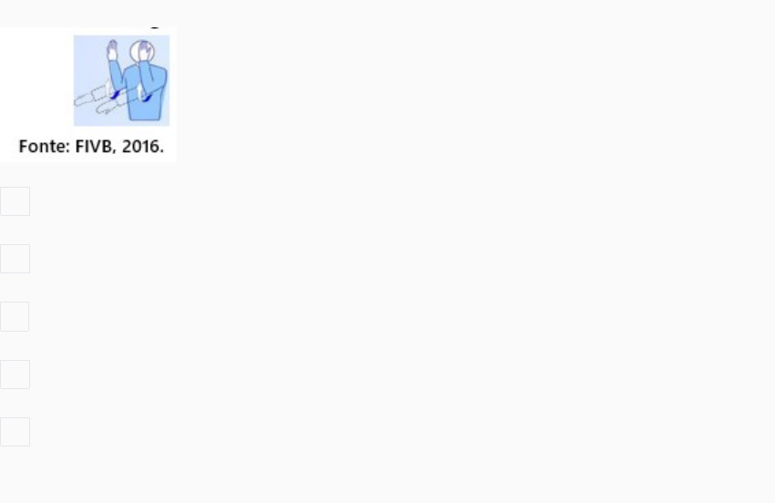 Observe a imagem abaixo. O que significa esta sinalização? a ) Toque na rede. b ) Bola fora. c ) Condução. d ) Invasão por cima. e ) Falta de posição da equipe receptora. Voltar image1.png