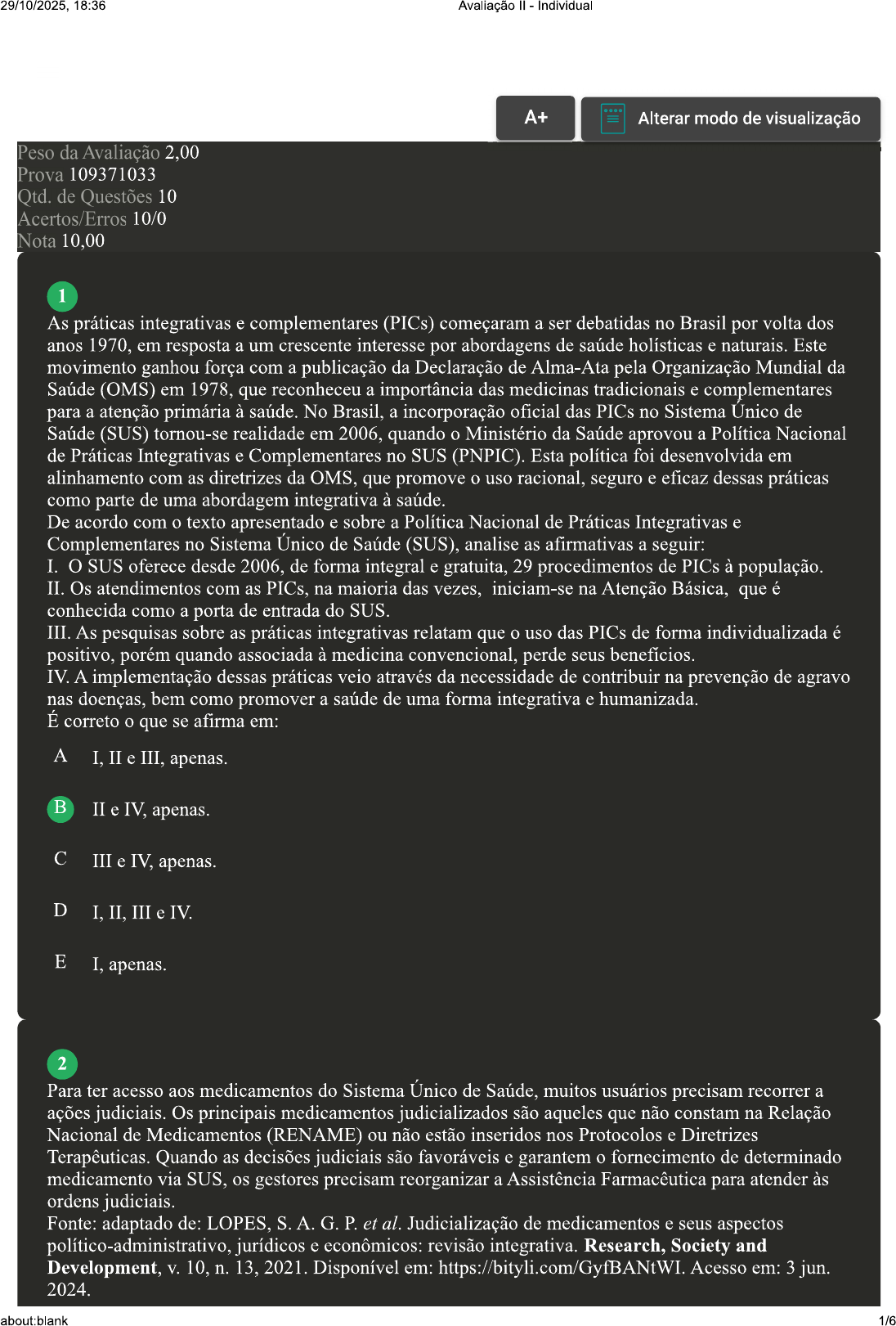 29/10/2025, 18:36 Avaliação Individual A+ Alterar modo de visualização Peso da Avaliação 2,00 Prova 109371033 Qtd. de Questões 10 Acertos/Erros 10/0 Nota 10,00 1 As práticas integrativas e complementares (PICs) começaram a ser debatidas no Brasil por volta dos anos 1970, em resposta a um crescente interesse por abordagens de saúde holísticas e naturais. Este movimento ganhou força com a publicação da Declaração de Alma-Ata pela Organização Mundial da Saúde (OMS) em 1978, que reconheceu a importância das medicinas tradicionais e complementares para a atenção primária à saúde. No Brasil, a incorporação oficial das PICs no Sistema Unico de Saúde (SUS) tornou-se realidade em 2006, quando o Ministério da Saúde aprovou a Política Nacional de Práticas Integrativas e Complementares no SUS (PNPIC). Esta política foi desenvolvida em alinhamento com as diretrizes da OMS, que promove o uso racional, seguro e eficaz dessas práticas como parte de uma abordagem integrativa à saúde. De acordo com o texto apresentado e sobre a Política Nacional de Práticas Integrativas e Complementares no Sistema Único de Saúde (SUS), analise as afirmativas a seguir: I. SUS oferece desde 2006, de forma integral e gratuita, 29 procedimentos de PICs à população. II. Os atendimentos com as PICs, na maioria das vezes, iniciam-se na Atenção Básica, que é conhecida como a porta de entrada do SUS. III. As pesquisas sobre as práticas integrativas relatam que o uso das PICs de forma individualizada é positivo, porém quando associada à medicina convencional, perde seus benefícios. IV. A implementação dessas práticas veio através da necessidade de contribuir na prevenção de agravo nas doenças, bem como promover a saúde de uma forma integrativa e humanizada. É correto o que se afirma em: A I, II e III, apenas. B II e IV, apenas. III e IV, apenas. D I, II, III e IV. E I, apenas. 2 Para ter acesso aos medicamentos do Sistema Único de Saúde, muitos usuários precisam recorrer a ações judiciais. Os principais medicamentos judicializados são aqueles que não constam na Relação Nacional de Medicamentos (RENAME) ou não estão inseridos nos Protocolos e Diretrizes Terapêuticas. Quando as decisões judiciais são favoráveis e garantem o fornecimento de determinado medicamento via SUS, os gestores precisam reorganizar a Assistência Farmacêutica para atender às ordens judiciais. Fonte: adaptado de: LOPES, S. G. P. et al. Judicialização de medicamentos e seus aspectos político-administrativo, jurídicos e econômicos: revisão integrativa. Research, Society and Development, V. 10, n. 13, 2021. Disponível em: Acesso em: 3 jun. 2024. about:blank 1/629/10/2025, 18:36 Avaliação Individual Sobre o exposto, avalie as asserções a seguir e a relação proposta entre elas: I. A judicialização pode gerar grandes impactos orçamentários e organizacionais para as políticas públicas de saúde, apesar de legítima. PORQUE II. Os medicamentos demandados judicialmente exigem que os gestores adquiram a medicação em um prazo reduzido, o que pode resultar em um custo maior de mercado do medicamento do que via normal de aquisição. A respeito dessas asserções, assinale a opção correta: A As asserções I e II são verdadeiras, mas a II não é uma justificativa correta da I. B As asserções I e II são falsas. A asserção I é uma proposição verdadeira e a II é uma proposição falsa. D A asserção I é uma proposição falsa e a II é uma proposição verdadeira. E As asserções I e II são verdadeiras, e a II é uma justificativa correta da I. 3 Quando dois ou mais medicamentos são administrados ao mesmo tempo a um paciente, eles podem atuar de forma independente ou interagir, resultando em um aumento ou diminuição dos efeitos terapêuticos ou tóxicos. A classificação e o conhecimento das interações farmacológicas, baseados no modo e local em que ocorrem, ajudam a prever, identificar e evitar essas interações. Elas podem ser classificadas como interações farmacodinâmicas ou farmacocinéticas quando ocorrem in vivo, e como incompatibilidade (ou interação farmacêutica) quando ocorrem in vitro. Sobre interações farmacológicas, assinale a alternativa correta: A antagonismo ocorre quando dois ou mais fármacos administrados conjuntamente apresentam o mesmo efeito farmacológico. B As interações entre nutrientes e fármacos nunca alteram a disponibilidade, a ação ou a toxicidade de uma dessas substâncias ou de ambas. Sinergismo é uma alteração farmacodinâmica em que a administração conjunta de fármacos pode levar à diminuição do efeito de um deles, por exemplo, devido à competição ou bloqueio do receptor. As interações farmacêuticas ocorrem quando os efeitos de um medicamento são modificados pela D presença de outro, seja no mesmo sítio de ação ou no mesmo sistema fisiológico, resultando em uma alteração na resposta do paciente ao outro medicamento. E As interações fármaco-alimento, devido alterarem a relação risco/beneficio do uso do medicamento, são vistas como um problema de grande proeminência na prática clínica. about:blank 2/629/10/2025, 18:36 Avaliação Individual 4 SUS foi criado com o objetivo de prestar assistência aos brasileiros através de ações de promoção, prevenção e recuperação da saúde. Entretanto, esse sistema não é perfeito. Muitas vezes, o atendimento acaba agravando o estado de saúde do paciente. Outro ponto agravante, segundo Do Carmo e Leme (2019, 6) ocorre: "Quando um cidadão enfermo precisa do uso de medicamentos de alto custo, nesse caso o paciente depende unicamente desse medicamento para vida ou morte, sob diversas alegações, que vão desde a possível reserva de medicamentos até a ausência da lista oficial elaborada pelo Ministério da Saúde, fazendo com que o SUS deixe de fornecer fármacos essenciais e necessários para o devido tratamento de forma saudável ao
