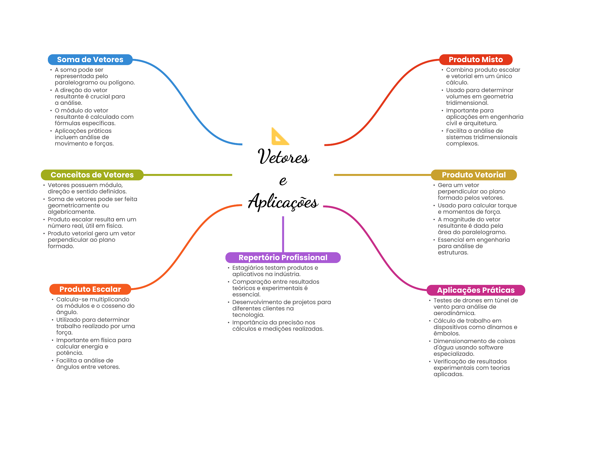 Soma de Vetores Produto Misto A soma pode ser Combina produto escalar representada pelo vetorial em um único paralelogramo ou poligono. A direção do vetor Usado para determinar resultante crucial para volumes em a módulo do vetor para resultante calculado com aplicações em engenharia específicas. civil arquitetura. Aplicações a de de sistemas movimento forças. complexes. Conceitos de Vetores Produto Vetorial Vetores médulo, um direção sentido definidos. perpendicular Soma de vetores pode ser feita formado vetores. ou Usado para calcular torque momentos de força. Produto resulta em um A magnitude do vetor número real, útil em resultante dada pela Produto gera um vetor do paralelogramo. perpendicular Essencial em engenharia formado. para de Repertório Profissional testam produtos . aplicativos na Comparação entre resultados Produto Escalar teóricos experimentale essencial. Aplicações Práticas multiplicando cosseno do Desenvolvimento de projetos para Testee de drones em túnel de diferentes clientes na vento para de tecnologia. Utilizado para determinar Importância da de trabalho em trabalho por uma cálculos medições dispositivos como dinamos força. em física para Dimensionamento de calcular energia usando software potência. especializado. Facilita a análise de Verificação de resultados ânguios entre vetores. experimentale com aplicadas.