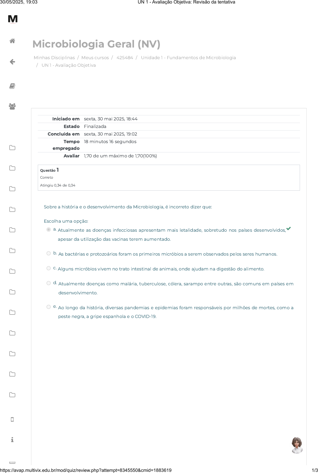 Minhas Disciplinas / Meus cursos / 425484 / Unidade 1 - Fundamentos de Microbiologia / UN 1 - Avaliação Objetiva Microbiologia Geral (NV) Iniciado em sexta, 30 mai 2025, 18:44 Estado Finalizada Concluída em sexta, 30 mai 2025, 19:02 Tempo empregado 18 minutos 16 segundos Avaliar 1,70 de um máximo de 1,70(100%) Questão 1 Correto Atingiu 0,34 de 0,34 Sobre a história e o desenvolvimento da Microbiologia, é incorreto dizer que: Escolha uma opção: a. Atualmente as doenças infecciosas apresentam mais letalidade, sobretudo nos países desenvolvidos, apesar da utilização das vacinas terem aumentado. b. As bactérias e protozoários foram os primeiros micróbios a serem observados pelos seres humanos. c. Alguns micróbios vivem no trato intestinal de animais, onde ajudam na digestão do alimento. d. Atualmente doenças como malária, tuberculose, cólera, sarampo entre outras, são comuns em países em desenvolvimento. e. Ao longo da história, diversas pandemias e epidemias foram responsáveis por milhões de mortes, como a peste negra, a gripe espanhola e o COVID-19. 30/05/2025, 19:03 UN 1 - Avaliação Objetiva: Revisão da tentativa https://avap.multivix.edu.br/mod/quiz/review.php?attempt=8345550&cmid=1883619 1/3 https://avap.multivix.edu.br/my/ https://avap.multivix.edu.br/course/view.php?id=33382 https://avap.multivix.edu.br/course/view.php?id=33382§ion=2 https://avap.multivix.edu.br/mod/quiz/view.php?id=1883619 https://avap.multivix.edu.br/my/ https://avap.multivix.edu.br/course/view.php?id=33382 https://avap.multivix.edu.br/user/index.php?id=33382 https://avap.multivix.edu.br/course/view.php?id=33382§ion=1 https://avap.multivix.edu.br/course/view.php?id=33382§ion=2 https://avap.multivix.edu.br/course/view.php?id=33382§ion=3 https://avap.multivix.edu.br/course/view.php?id=33382§ion=4 https://avap.multivix.edu.br/course/view.php?id=33382§ion=5 https://avap.multivix.edu.br/course/view.php?id=33382§ion=6 https://avap.multivix.edu.br/course/view.php?id=33382§ion=7 https://avap.multivix.edu.br/course/view.php?id=33382§ion=8 https://avap.multivix.edu.br/course/view.php?id=33382§ion=9 https://avap.multivix.edu.br/course/view.php?id=33382§ion=10 https://avap.multivix.edu.br/course/view.php?id=33382§ion=11 https://avap.multivix.edu.br/course/view.php?id=33382§ion=12 https://avap.multivix.edu.br/course/view.php?id=33382§ion=13 https://avap.multivix.edu.br/hooks/portal/ https://avap.multivix.edu.br/mod/page/view.php?id=1252%2F%22%20target%3D%22_blank https://avap.multivix.edu.br/calendar/view.php/ https://avap.multivix.edu.br/ https://avap.multivix.edu.br/ https://avap.multivix.edu.br/ https://avap.multivix.edu.br/ Questão 2 Correto Atingiu 0,34 de 0,34 Questão 3 Correto Atingiu 0,34 de 0,34 Químico importante para o campo da Microbiologia onde, por meio dos seus experimentos, derrubou a teoria da geração espontânea, descobriu que formas de vida poderiam existir na ausência de oxigênio, introduzindo os termos "aeróbio" e "anaeróbio". Estamos falando de: Escolha uma opção: a. Antoine Lavoisier b. Nicole Moreau c. Robert Koch d. Robert Boyle e. Louis Pasteur Na célula eucariótica tem-se uma matriz nutritiva semifluida e gelatinosa, onde no seu interior, são encontrados grânulos de armazenamento insolúveis e diversas organelas, incluindo o retículo endoplasmático, ribossomos, mitocôndrias, dentre outras. Estamos falando do(a): Escolha uma opção: a. Membrana Plasmática b. Núcleo c. Parede Celular d. Carioteca e. Citoplasma 30/05/2025, 19:03 UN 1 - Avaliação Objetiva: Revisão da tentativa https://avap.multivix.edu.br/mod/quiz/review.php?attempt=8345550&cmid=1883619 2/3 https://avap.multivix.edu.br/my/ https://avap.multivix.edu.br/course/view.php?id=33382 https://avap.multivix.edu.br/user/index.php?id=33382 https://avap.multivix.edu.br/course/view.php?id=33382§ion=1 https://avap.multivix.edu.br/course/view.php?id=33382§ion=2 https://avap.multivix.edu.br/course/view.php?id=33382§ion=3 https://avap.multivix.edu.br/course/view.php?id=33382§ion=4 https://avap.multivix.edu.br/course/view.php?id=33382§ion=5 https://avap.multivix.edu.br/course/view.php?id=33382§ion=6 https://avap.multivix.edu.br/course/view.php?id=33382§ion=7 https://avap.multivix.edu.br/course/view.php?id=33382§ion=8 https://avap.multivix.edu.br/course/view.php?id=33382§ion=9 https://avap.multivix.edu.br/course/view.php?id=33382§ion=10 https://avap.multivix.edu.br/course/view.php?id=33382§ion=11 https://avap.multivix.edu.br/course/view.php?id=33382§ion=12 https://avap.multivix.edu.br/course/view.php?id=33382§ion=13 https://avap.multivix.edu.br/hooks/portal/ https://avap.multivix.edu.br/mod/page/view.php?id=1252%2F%22%20target%3D%22_blank https://avap.multivix.edu.br/calendar/view.php/ https://avap.multivix.edu.br/ https://avap.multivix.edu.br/ https://avap.multivix.edu.br/ https://avap.multivix.edu.br/ Questão 4 Correto Atingiu 0,34 de 0,34 Questão 5 Correto Atingiu 0,34 de 0,34 A microbiologia é uma ciência inteiramente voltada ao estudo dos microrganismos e ao modo como eles funcionam. A respeito da Microbiologia, o único item incorreto é: Escolha uma opção: a. Ela não tem relação nenhuma com a Ecologia, pois não estuda onde os microrganismos vivem ou interagem entre si e com o meio. b. Com apenas raras exceções, os micróbios individualizados só podem ser observados com o uso de vários tipos de microscópios. c. Ela utiliza o estudo das células microbianas para compreender os processos fundamentais da vida. d. Ela busca compreender a diversidade dos microrganismos, buscando entender como e por que surgiram. e. Ela busca estudar áreas interconectadas: a natureza e o funcionamento dos microrganismos e a aplicabilidade desse conhecimento para beneficiar a humanidade e o meio ambiente. Médico alemão que fez valiosas contribuições para a Microbiologia, dentre elas a descoberta da bactéria que causa a tuberculose e a que provoca a cólera. Estamos falando de: 