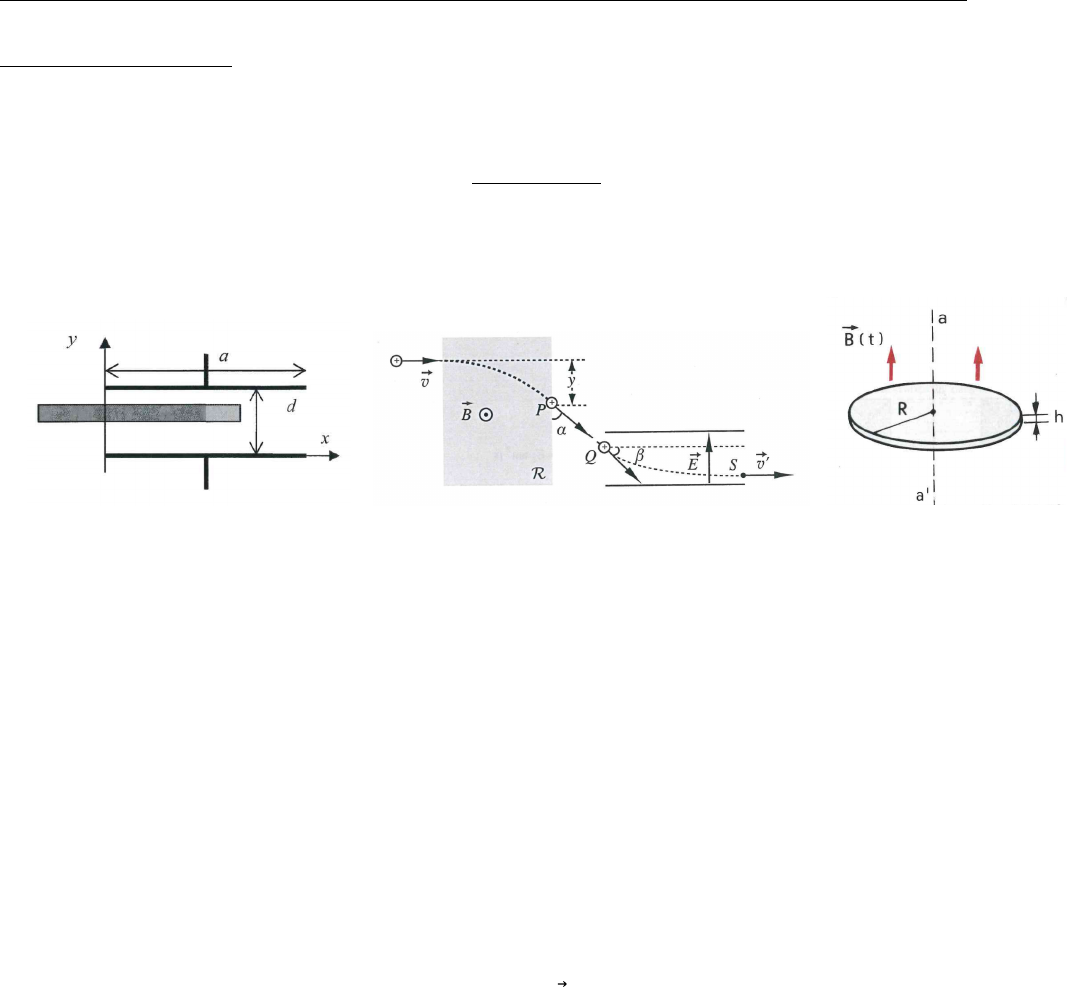 Università di Trieste, A.A. 2022/2023 – Laurea Triennale in Fisica Elettromagnetismo, Prova Scritta Secondo Appello Sessione Estiva (18.07.2023) Cognome ............................................. Nome ........................................ Accetto la valutazione ottenuta nella [ ] prima o nella [ ] seconda prova intermedia. Istruzioni per gli esercizi: Per ciascuna domanda rispondere fornendo solo il risultato finale: i principali passaggi logici per la soluzione del problema, la grandezza incognita espressa simbolicamente in funzione delle grandezze date o di quelle ottenute in altre risposte, e poi il corrispondente risultato numerico con le unità di misura appropriate. Verranno valutati sia il procedimento logico (argomentato) che il risultato numerico, ove richiesto. Ogni esercizio comporta una o più domande per un totale di 8 punti a disposizione per esercizio. Verrà valutata anche l’argomentazione fornita a supporto dell’esercizio e la presentazione dello stesso. Fig. 1 Fig. 2 Fig. 3 1. In un punto distante rP = 2.0 cm dal centro di una sfera isolante, uniformemente carica e di raggio R = 5.0 cm, il potenziale elettrostatico vale V(rP) = 30 V. Determinare la densità volumica di carica presente nella sfera isolante e il potenziale V(O) all’origine della sfera stessa. 2. Una piastra di rame di spessore b = 2.0 mm viene inserita (come in Figura 1) all’interno di un condensatore a piani paralleli, distanti d = 3.0 mm. Le armature e la piastra sono di forma quadrata, di lato a = 5.0 cm. Calcolare la capacità del sistema in funzione del tratto (di lunghezza x) del lato della piastra inserito nel condensatore. Determinare infine l’energia elettrostatica del sistema in funzione di x nei casi in cui a) sia mantenuta costante la carica q = 10 nC deposta sui piani del condensatore e b) sia mantenuta costante la differenza di potenziale ΔV al valore assunto dal condensatore quando si posiziona la medesima carica q senza aver inserito ancora la lastra metallica. 3. Un protone (mP = 1,67 ·∙ 10–27 kg ) entra con velocità 𝑣 orizzontale in una regione R piana in cui agisce un campo magnetico uniforme di modulo B = 10 mT perpendicolare al piano e uscente da esso (Figura 2). Il protone esce dalla regione R in un punto P dopo essere stato deflesso di un angolo α = 30°, a distanza y = 50 cm dall’orizzontale. Esso entra quindi nel punto Q, con inclinazione β = 60°, in un’altra regione dove agisce un campo elettrostatico di modulo E = 100 kV/m diretto verso l’altro uscendone nel punto S con velocità v’ diretta come l’asse x. Calcolare la velocità iniziale v, la velocità finale v’ e il tempo impiegato a percorrere la traiettoria da Q a S (Figura 2). 4. All’interno di un campo magnetico uniforme diretto verso l’alto è posto un disco di rame di raggio R = 20 cm ed altezza h = 1 cm, il cui asse coincide con la direzione del campo magnetico (Figura 3). Il modulo del campo magnetico varia nel tempo secondo la legge B = kt, con k costante di valore k = 0.1 T/s. Sapendo che la resistività del rame è ρ = 1.7 ·∙ 10–8 Ωm, calcolare la potenza dissipata nel disco per mezzo delle correnti che vi si generano.