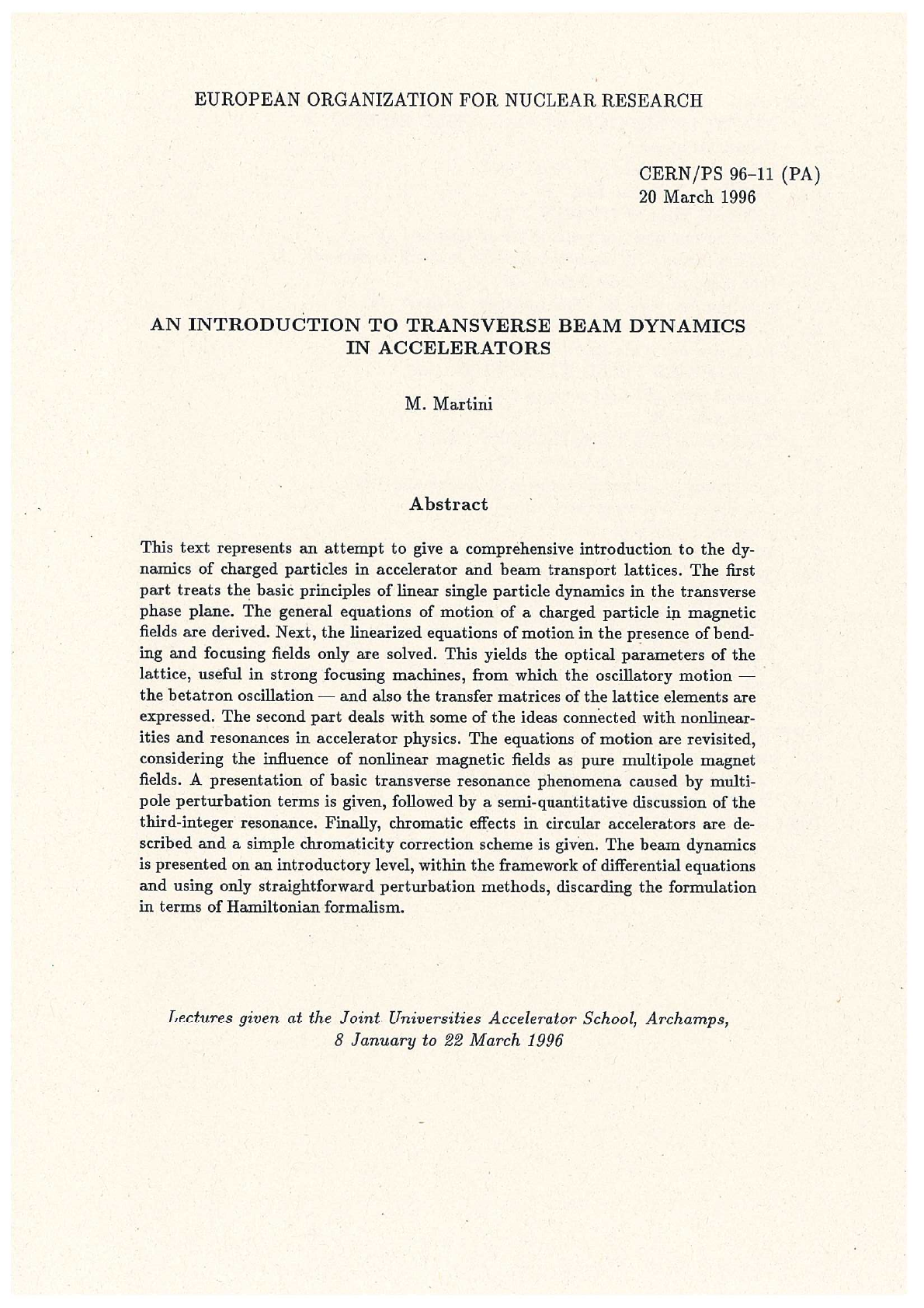 EUROPEAN ORGANIZATION FOR NUCLEAR RESEARCH CERN/PS 96-11 (PA) 20 March 1996 AN INTRODUCTION TO TRANSVERSE BEAM DYNAMICS IN ACCELERATORS M. Martini Abstract This text represents an attempt to give a comprehensive introduction to the dy- namics of charged particles in accelerator and beam transport lattices. The first part treats the basic principles of linear single particle dynamics in the transverse phase plane. The general equations of motion of a charged particle in magnetic fields are derived. Next, the linearized equations of motion in the presence of bend- ing and focusing fields only are solved. This yields the optical parameters of the lattice, useful in strong focusing machines, from which the oscillatory motion the betatron oscillation and also the transfer matrices of the lattice elements are expressed. The second part deals with some of the ideas connected with nonlinear- ities and resonances in accelerator physics. The equations of motion are revisited, considering the influence of nonlinear magnetic fields as pure multipole magnet fields. A presentation of basic transverse resonance phenomena caused by multi- pole perturbation terms is given, followed by a semi-quantitative discussion of the third-integer resonance. Finally, chromatic effects in circular accelerators are de- scribed and a simple chromaticity correction scheme is given. The beam dynamics is presented on an introductory level, within the framework of differential equations and using only straightforward perturbation methods, discarding the formulation in terms of Hamiltonian formalism. Lectures given at the Joint Universities Accelerator School, Archamps, 8 January to 22 March 1996Contents 1 PARTICLE MOTION IN MAGNETIC FIELDS 1 1.1 Coordinate system 1 1.2 Linearized equations of motion 6 1.3 Weak and strong focusing 8 2 LINEAR BEAM OPTICS 13 2.1 Betatron functions for periodic closed lattices 13 2.2 Hill's equation with piecewise periodic constant coefficients 19 2.3 Emittance and beam envelope 21 2.4 Betatron functions for beam transport lattices 24 2.5 Dispersive periodic closed lattices 27 2.6 Dispersive beam transport lattices 31 3 MULTIPOLE FIELD EXPANSION 35 3.1 General multipole field components 35 3.2 Pole profile 40 4 TRANSVERSE RESONANCES 43 4.1 Nonlinear equations of motion 43 4.2 Description of motion in normalized coordinates 46 4.3 One-dimensional resonances 51 4.4 Coupling resonances 53 5 THE THIRD-INTEGER RESONANCE 57 5.1 The averaging method 57 5.2 The nonlinear sextupole resonance 60 5.3 Numerical experiment: sextupolar kick 68 6 CHROMATICITY 73 6.1 Chromaticity effect in a closed lattice 73 6.2 The natural chromaticity of a FODO cell 79 6.3 Chromaticity correction 82 APPENDIX A: HILL'S EQUATION 84 A.1 Linear equations 84 A.2 Equations with periodic coefficients (Floquet theory) 86 A.3 Stability of solutions 89 BIBLIOGRAPHY 92 iii1 PARTICLE MOTION IN MAGNETIC FIELDS 1.1 Coordinate system The motion of a charged particle in a beam transport channel or in a circular accelerator is governed by the Lorentz force equation (1.1) where E and are the electric and magnetic fields, v is the particle velocity, and e is the electric charge of the particle. The Lorentz forces are applied as bending forces to guide the particles along a predefined ideal path, the design orbit, on which-ideally-all particles should move, and as focusing forces to confine the particles in the vicinity of the ideal path, from which most particles will unavoidably deviate. The motion of particle beams under the influence of these Lorentz forces is called beam optics. The design orbit can be described using a fixed, right-handed Cartesian reference system. However, using such a reference system it is difficult to express deviations of individual particle trajectories from the design orbit. Instead, we will use a right-handed orthogonal system (n, b, t) that follows an ideal particle traveling along the design orbit. The variables S and σ describe the ideal beam path and an individual particle trajectory. We have chosen the convention that n is directed outward if the motion lies in the horizontal plane, and upwards if it lies in the vertical plane. Let δr(s) be the deviation of the particle trajectory r(s) from the design orbit ro(s). Assume that the design orbit is made of piecewise flat curves, which can be either in the horizontal or vertical plane so that it has no torsion. Hence, from the Frenet-Serret formulae we find dro = = 0 = ds k(s)t (1.2) where k(s) is the curvature, t is the target unit vector, n the normal unit vector and b the binomial vector: b individual particle trajectory n δr t design orbit σ r (s) ro (s) motion in horizontal plane S Figure 1: Coordinate system (n, b, t). 1Unfortunately, n charges discontinuously if the design orbit jumps from the horizontal to the vertical plane, and vice versa. Therefore, we instead introduce the new right-handed coordinate system ey, t): if the orbit lies in the horizontal plane -b if the orbit lies in the vertical plane ey if the orbit lies in the horizontal plane if the orbit lies in the vertical plane. Thus: = (1.3) The last equation stands, provided we assume (1.4) where ky are the curvatures in the and the y-direction. Hence the individual particle trajectory reads: (1.5) where (x, y, s) are the particle coordinates in the new reference system. ey ex y t X design orbit a r (s) (s) S Figure 2: Coordinate system Consider the length S of the ideal beam path as the independent variable, instead of the time variable t, to express the Lorentz equation (1.1). Now, from dt d = do dt do d = do ds ds d = v ds d , 2where v = is the particle velocity and a prime denotes the derivative with respect to s, it follows that σ' d²r dt² = dt d = σ' ds d = v² - v² σ¹² σ" = v² (r" 2 1 σ¹² r' ds d = σ¹² v² (r" σ" Now, from (1.3) and (1.5), r'(s) = (s) + + + x + e'y = t + + + x + kyt = (1 + kxx + kyy)t + x'ex + Similarly, we compute the second derivative: r"(s) = + 