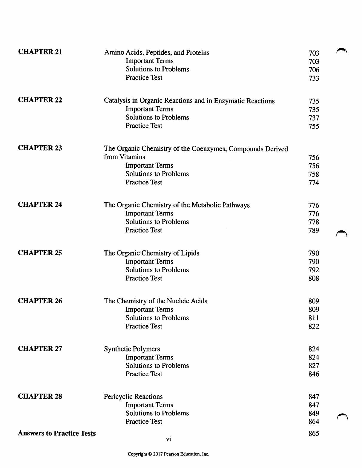 CHAPTER 21 Amino Acids, Peptides, and Proteins 703 Important Terms 703 Solutions to Problems 706 Practice Test 733 CHAPTER 22 Catalysis in Organic Reactions and in Enzymatic Reactions 735 Important Terms 735 Solutions to Problems 737 Practice Test 755 CHAPTER 23 The Organic Chemistry of the Coenzymes, Compounds Derived from Vitamins 756 Important Terms 756 Solutions to Problems 758 Practice Test 774 CHAPTER 24 The Organic Chemistry of the Metabolic Pathways 776 Important Terms 776 Solutions to Problems 778 Practice Test 789 CHAPTER 25 The Organic Chemistry of Lipids 790 Important Terms 790 Solutions to Problems 792 Practice Test 808 CHAPTER 26 The Chemistry of the Nucleic Acids 809 Important Terms 809 Solutions to Problems 811 Practice Test 822 CHAPTER 27 Synthetic Polymers 824 Important Terms 824 Solutions to Problems 827 Practice Test 846 CHAPTER 28 Pericyclic Reactions 847 Important Terms 847 Solutions to Problems 849 Practice Test 864 Answers to Practice Tests 865 vi Copyright © 2017 Pearson Education, Inc.