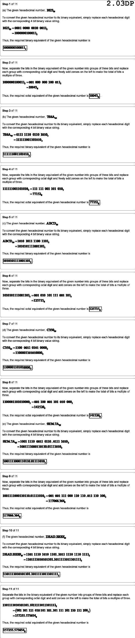 Step 11 2.03DP (a) The given hexadecimal number, To convert the given hexadecimal number to its binary equivalent, simply replace each hexadecimal digit with the corresponding 4 bit binary value string. 0001 0000 0010 0011, =1000000100011, Thus, the required binary equivalent of the given hexadecimal number is 1000000100011 Step of 11 Now, separate the bits in the binary equivalent of the given number into groups of three bits and replace each group with corresponding octal digit and freely add zeroes on the left to make the total of bits a multiple of three. 1000000100011, =001 000 000 100 011, =10043, Thus, the required octal equivalent of the given hexadecimal number is 10043, Step 11 (b) The given hexadecimal number, To convert the given hexadecimal number to its binary equivalent, simply replace each hexadecimal digit with the corresponding bit binary value =0111 1110 0110 1010, =111111001101010, Thus, the required binary equivalent of the given hexadecimal number is Step 11 Now, separate the bits in the binary equivalent of the given number into groups of three bits and replace each group with corresponding octal digit and freely add zeroes on the left to make the total of bits a multiple of three. 111111001101010, 111 111 001 101 010, Thus, the required octal equivalent of the given hexadecimal number is Step 11 (c) The given hexadecimal number, To convert the given hexadecimal number to its binary equivalent, simply replace each hexadecimal digit with the corresponding 4 bit binary value string. =1010 1011 1100 =1010101111001101, Thus, the required binary equivalent of the given hexadecimal number is Step 11 Now, separate the bits in the binary equivalent of the given number into groups of three bits and replace each group with corresponding octal digit and add zeroes on the left to make the total of bits multiple of three. 1010101111001101, =001 010 101 111 001 101, =125715, Thus, the required octal equivalent of the given hexadecimal number is 125715, Step 11 (d) The given hexadecimal number, To convert the given hexadecimal number to its binary equivalent, simply replace each hexadecimal digit with the corresponding 4 bit binary value =1100 0011 0101 =1100001101010000, Thus, the required binary equivalent of the given hexadecimal number is 1100001101010000, Step 11 Now, separate the bits in the binary equivalent of the given number into groups of three bits and replace each group with corresponding octal digit and add zeroes on the left to make the total of bits multiple of three. 1100001101010000, =001 100 001 101 010 000, Thus, the required octal equivalent of the given hexadecimal number is 141520, (e) The given hexadecimal number, 9E36.7A To convert the given hexadecimal number to its binary equivalent, simply replace each hexadecimal digit with the corresponding bit binary value string. 1001 1110 0011 0110.0111 1010, Thus, the required binary equivalent of the given hexadecimal number is 1001111000110110.01111010, Step 11 Now, separate the bits in the binary equivalent of the given number into groups of three bits and replace each group with corresponding octal digit and add zeroes on the left to make the total of bits multiple of three. 001 111 000 110 110.011 110 100, =117066.364 Thus, the required octal equivalent of the given hexadecimal number is Step 11 (f) The given hexadecimal number, To convert the given hexadecimal number to its binary equivalent, simply replace each hexadecimal digit with the corresponding 4 bit binary value string. 1101 1110 1010 1101.1011 1110 1110 1111, Thus, the required binary equivalent of the given hexadecimal number is Step 11 Separate the bits in the binary equivalent of the given number into groups of three bits and replace each group with corresponding octal digit and add zeroes on the left to make the total of bits multiple of three (001 101 111 010101 101.101 111 101 110 111 Thus, the required octal equivalent of the given hexadecimal number is