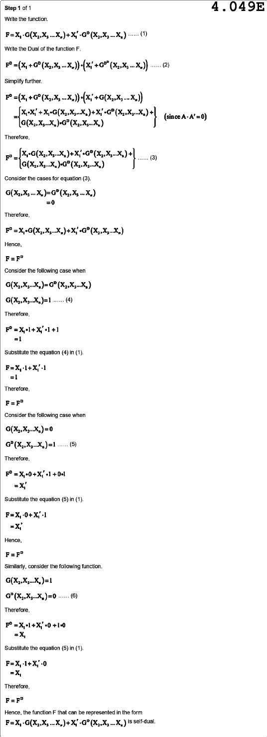 Step of 1 4.049E Write the function. (1) Write the Dual of the function F. (2) Simplify further. Therefore, FD = (3) Consider the cases for equation (3). =0 Therefore, Hence, Consider the following case when (4) Therefore, =1 Substitute the equation (4) in (1). =1 Therefore, Consider the following case when (5) Therefore, = Substitute the equation (5) in (1). Hence, Similarly, consider the following function. (6) Therefore, Substitute the equation (5) in (1). Therefore, Hence, the function F that can be represented in the form self-dual.