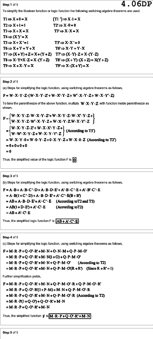 Step 1 of 5 4.06DP To simplify the Boolean function or logic function the following switching algebra theorems are used: T1=X+0=X T2=X+1=1 T3=X+X=X T4=(X)'=X T5=X+X'=1 T7 Step 2 of 5 (a) Steps for simplifying the logic function, using switching algebra theorems as follows, To take the parenthesize of the above function, multiply with function inside parenthesize as shown, = (According to T5') (According to T2') =0+0+0+0 =0 Thus, the simplified value of the logic function F is 0 Step 3 of 5 (b) Steps for simplifying the logic function, using switching algebra theorems as follows, (According toT2 and T5) (According toT2) Thus, the simplified logic function F is Step 4 of 5 (c) Steps for simplifying the logic function, using switching algebra theorems as follows, (According to T2) = Further simplification yields, (According to T2) Thus, the simplified function F is Step 5 of 5