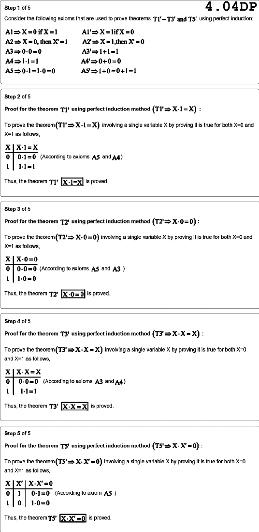 Step 1 of 5 4.04DP Consider the following axioms that are used to prove theorems and T5' using perfect induction: A2=X=0, then X'=1 A4'=0+0=0 Step 2 of 5 Proof for the theorem T1' using perfect induction method : To prove the theorem involving a single variable X by proving it is true for both X=0 and X=1 as follows, X 0 0.1=0 (According to axioms A5 and A4) 1 1.1=1 Thus, the theorem T1' is proved. Step 3 of 5 Proof for the theorem T2' using perfect induction method To prove the theorem (T2' involving a single variable X by proving it is true for both X=0 and X=1 as follows, X 0 0.0=0 (According to axioms A5 and 1 Thus, the theorem T2' is proved. Step 4 of 5 Proof for the theorem T3' using perfect induction method To prove the theorem involving a single variable X by proving it is true for both X=0 and X=1 as follows, 0 0.0=0 (According to axioms A3 and A4) 1 1.1=1 Thus, the theorem T3' is proved. Step 5 of 5 Proof for the theorem T5' using perfect induction method To prove the theorem involving a single variable X by proving it is true for both X=0 and X=1 as follows, 01 0.1=0 (According to axiom 1 0 Thus, the is proved.