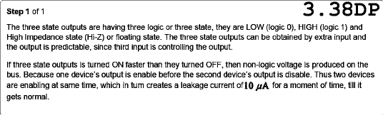 Step 1 of 1 3.38DP The three state outputs are having three logic or three state, they are LOW (logic 0), HIGH (logic 1) and High Impedance state (Hi-Z) or floating state. The three state outputs can be obtained by extra input and the output is predictable, since third input is controlling the output. If three state outputs is turned ON faster than they turned OFF, then non-logic voltage is produced on the bus. Because one device's output is enable before the second device's output is disable. Thus two devices are enabling at same time, which in tum creates a leakage current of 10 µA for a moment of time, till it gets normal.