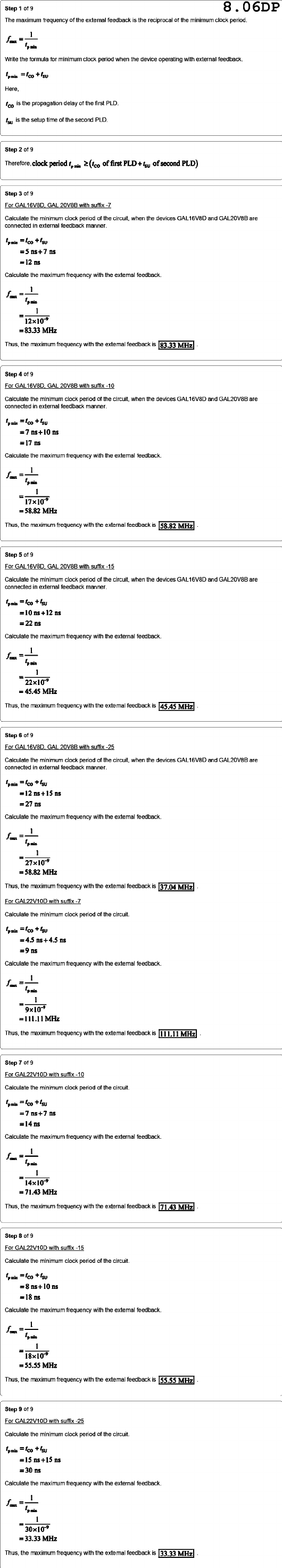 Step of 9 8.06DP The maximum frequency of the external feedback is the reciprocal of the minimum clock period. Write the formula for minimum clock period when the device operating with external feedback Here, co is the propagation delay of the first PLD is the setup time of the second Step 9 Therefore clock period (co of first PLD of second PLD) Step For GAL GAL 20V8B with suffix 7 Calculate the minimum clock period of the circuit, when the devices GAL 16V8D and L20V8B are connected in external feedback =5 ns+7 ns ns Calculate the maximum frequency with the feedback = =83.33 MHz Thus, the maximum frequency with the external feedback 83.33 MHz Step 4 of 9 For GAL GAL 20V8B with suffix -10 Calculate the minimum clock period of the when the devices GAL 16V8D and 20V8B are connected in external feedback ns ns Calculate the maximum frequency with the external feedback 1 =58.82 MHz Thus, the maximum frequency with the external feedback 58.82 MHz Step 5 of 9 For GAL GAL 20V8B with suffix Calculate the minimum clock period of the when the devices GAL 16V8D and 20V8B are connected in external feedback = ns ns Calculate the maximum frequency with the external feedback 1 - 45.45 MHz Thus, the maximum frequency with the external feedback Step 6 of 9 For GAL GAL 20V8B with suffix Calculate the minimum clock period of the circuit, when the devices GAL 16V8D and 20V8B are connected in external feedback ns ns Calculate the maximum frequency with the external feedback 1 = =58.82 MHz Thus, the maximum frequency with the external feedback 37.04 MHz GAL22V10D with Calculate the minimum clock period of the circuit =9 ns Calculate the maximum frequency with the external feedback Thus, the maximum frequency with the external feedback Step 7 of 9 Calculate the minimum clock period of the circuit ns ns Calculate the maximum frequency with the external feedback = =71.43 MHz Thus, the maximum frequency with the external feedback 71.43 MHz Step Calculate the minimum clock period the circuit ns - ns Calculate the maximum frequency with the external = =55.55 MHz Thus, the maximum frequency with the external feedback Step 9 of 9 Calculate the minimum clock period of the circuit = ns Calculate the maximum frequency with the external feedback = 30x10 33.33 MHz Thus, the maximum frequency with the feedback