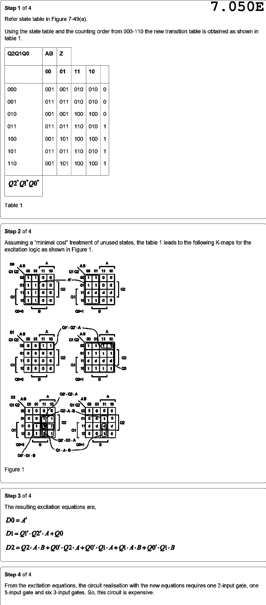 Step 1 of 4 7.050E Refer state table in Figure 7-49(a). Using the state table and the counting order from 000-110 the new transition table is obtained as shown in table 1. Q2Q1Q0 AB Z 00 01 11 10 000 001 001 010 010 0 001 011 011 010 010 0 010 001 001 100 100 0 011 011 011 110 010 1 100 001 101 100 100 1 101 011 011 110 010 1 110 001 101 100 100 1 Table 1 Step 2 of 4 Assuming a "minimal cost" treatment of unused states, the table 1 leads to the following K-maps for the excitation logic as shown in Figure 1. A A AB AB 00 01 11 10 00 01 11 10 00 1100 00 1100 K 01 1100 01100 02 02 11 1100 10 1100 10 1100 8 A A AB 00 01 11 10 00 01 11 10 00 0011 00 1 1 01 0 0 0 0 01 1111 02 11 11 dddd 10 0000 10 1111 8 A A AB AB 00 01 11 10 Q102 00 01 11 10 00 0 0 0 0 00 0 0 0 0 01 0 1 01 0 0 1 0 11 0 1 L 1 11 d d d Q1 10 0 1 1 10 0 0 0 B Figure 1 Step 3 of 4 The resulting excitation equations are, Step 4 of 4 From the excitation equations, the circuit realisation with the new equations requires one 2-input gate, one 5-input gate and six 3-input gates. So, this circuit is expensive.
