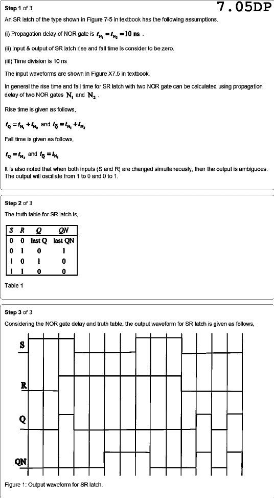 Step 1 of 3 7.05DP An SR latch of the type shown in Figure 7-5 in textbook has the following assumptions. (i) Propagation delay of NOR gate is (ii) Input & output of SR latch rise and fall time is consider to be zero. (iii) Time division is 10 ns The input waveforms are shown in Figure X7.5 in textbook. In general the rise time and fall time for SR latch with two NOR gate can be calculated using propagation delay of two NOR gates and Rise time is given as follows, Fall time is given as follows, It is also noted that when both inputs (S and R) are changed simultaneously, then the output is ambiguous. The output will oscillate from 1 to 0 and 0 to 1. Step 2 of 3 The truth table for SR latch is, S R QN 00 last Q last QN 01 0 101 0 11 0 0 Table 1 Step 3 of 3 Considering the NOR gate delay and truth table, the output waveform for SR latch is given as follows, S R Q QN Figure 1: Output waveform for SR latch.