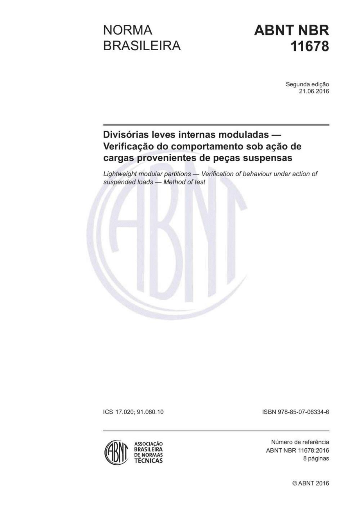 NORMA ABNT NBR BRASILEIRA 11678 Segunda edição 21.06.2016 Divisórias leves internas moduladas Verificação do comportamento sob ação de cargas provenientes de peças suspensas Lightweight modular partitions Verification of behaviour under action of suspended loads - Method of test ICS 17.020; 91.060.10 ISBN 978-85-07-06334-6 ASSOCIAÇÃO Número de referência BRASILEIRA ABNT NBR 11678:2016 DE NORMAS TÉCNICAS 8 páginas © ABNT 2016ABNT NBR 11678:2016 © ABNT 2016 Todos direitos reservados. A menos que especificado de outro modo, nenhuma parte desta publicação pode ser reproduzida ou utilizada por qualquer meio, eletrônico ou mecânico, incluindo fotocópia e microfilme, sem permissão por escrito da ABNT. ABNT Av.Treze de Maio, 13 28° andar 20031-901 Rio de Janeiro RJ Tel.: + 55 21 3974-2300 Fax: + 55 21 3974-2346 abnt@abnt.org.br www.abnt.org.br ii © ABNT 2016 Todos os direitos reservadosABNT NBR 11678:2016 Sumário Página Prefácio iv 1 Escopo 1 2 Termos e definições 1 3 Aparelhagem 5 4 Execução do ensaio 6 4.1 Corpo de prova 6 4.2 Procedimento de ensaio 7 5 Relatório de ensaio 8 Figuras Figura 1 Suporte para aplicação das cargas 6 Figura 2 - Locais de aplicação das cargas 7 © ABNT 2016 Todos os direitos reservados iiiABNT NBR 11678:2016 Prefácio A Associação Brasileira de Normas Técnicas (ABNT) é Foro Nacional de Normalização. As Normas Brasileiras, cujo conteúdo é de responsabilidade dos Comitês Brasileiros (ABNT/CB), dos Organismos de Normalização Setorial (ABNT/ONS) e das Comissões de Estudo Especiais (ABNT/CEE), são elaboradas por Comissões de Estudo (CE), formadas pelas partes interessadas no tema objeto da normalização. Os Documentos Técnicos ABNT são elaborados conforme as regras da Diretiva ABNT, Parte 2. AABNT chama a atenção para que, apesar de ter sido solicitada manifestação sobre eventuais direitos de patentes durante a Consulta Nacional, estes podem ocorrer e devem ser comunicados à ABNT a qualquer momento (Lei 9.279, de 14 de maio de 1996). Ressalta-se que Normas Brasileiras podem ser objeto de citação em Regulamentos Técnicos. Nestes casos, os Órgãos responsáveis pelos Regulamentos Técnicos podem determinar outras datas para exigência dos requisitos desta Norma. A ABNT NBR 11678 foi elaborada no Comitê Brasileiro de Construção Civil (ABNT/CB-002), pela Comissão de Estudo de Divisórias Leves (CE-002:002.033). Esta Norma teve seu conteúdo técnico confirmado e adequado à Diretiva ABNT, Parte 2:2011 pela Secretaria do Comitê Brasileiro de Mobiliário (ABNT/CB-015). seu Projeto de adequação circulou em Consulta Nacional conforme Edital n° 05, de 17.05.2016 a 15.06.2016. Esta segunda edição cancela e substitui a edição anterior (ABNT NBR 11678:1990), sem mudanças técnicas. Escopo em inglês desta Norma Brasileira é seguinte: Scope This Standard specifies the method for checking the behavior of internal partitions light modulated (DLIM), under the action of loads from suspended parts, such as sinks, tanks, sinks, shelves etc. iv © ABNT 2016 Todos direitos reservadosNORMA BRASILEIRA ABNT NBR 11678:2016 Divisórias leves internas moduladas Verificação do comportamento sob ação de cargas provenientes de peças suspensas 1 Escopo Esta Norma especifica método para a verificação do comportamento de divisórias leves internas moduladas (DLIM), sob ação de cargas provenientes de peças suspensas, como lavatórios, tanques, pias, prateleiras etc. 2 Termos e definições Para os efeitos deste documento, aplicam-se seguintes termos e definições. 2.1 Definições gerais 2.1.1 divisórias leves internas moduladas DLIM sistema construtivo que separa os espaços internos de uma edificação, compartimentado e/ou definindo ambientes, estendendo-se do piso ao forro ou teto, sendo constituído por painéis modulares e seus componentes, com massa não superior a 60 2.1.2 componente produto manufaturado, que faz parte da DLIM, com função específica 2.1.3 módulo conjunto homogêneo de componentes que formam uma unidade básica da DLIM 2.1.4 modulação unidade de medida do módulo da DLIM 2.1.5 perfil componente de metal, madeira ou outros materiais, com função de sustentação e/ou acabamento da DLIM, como: montantes, travessas, colunas, rodapés, marcos, guias, porta-baguete, tapa-canal e outros 2.1.6 junta união ou intervalo existente entre componentes da DLIM ou entre estes e elementos da edificação 2.1.7 encunhamento travamento da DLIM a qualquer elemento da edificação, por meio de cunhas ©ABNT 2016 Todos os direitos reservados 1ABNT NBR 11678:2016 2.2 Componentes das DLIM 2.2.1 painel componentes de fechamento como formato retangular e espessura compatível para encaixe nos montantes e travessas da DLIM 2.2.2 porta componente constituído de uma ou mais folhas de porta, marco, ferragens, com ou sem alizar, cuja função é regular a abertura e fechamento de um vão transitável 2.2.3 boneca componente que se usa como prolongamento lateral da porta 2.2.4 bandeira componente que se usa como prolongamento superior da porta ou painel 2.2.5 montante coluna perfil vertical para estruturação da DLIM 2.2.6 arremate componente que é aplicado visando à finalização da DLIM com objetivos funcionais e estéticos 2.2.7 travessa perfil horizontal que se presta à união entre componentes da DLIM 2.2.8 rodapé perfil de arremate das partes inferiores da DLIM junto ao piso 2.2.9 marco batente elemento constituído por montantes e travessa, destinado a guarnecer vão e a sustentar as folhas de porta, bonecas e bandeiras 2.2.10 baguete perfil que é utilizado para a fixação de vidros e outros materiais 2.2.11 porta-baguete perfil que se encaixa nos montantes e nas travessas, com objetivo de alojar baguetes 2 © ABNT 2016 - Todos direitos reservadosABNT NBR 11678:2016 2.2.12 guia perfil que finaliza ou direciona a DLIM. NOTA Quando aplicada na parte superior da DLIM, também denomina-se cimalha. 2.2.13 co