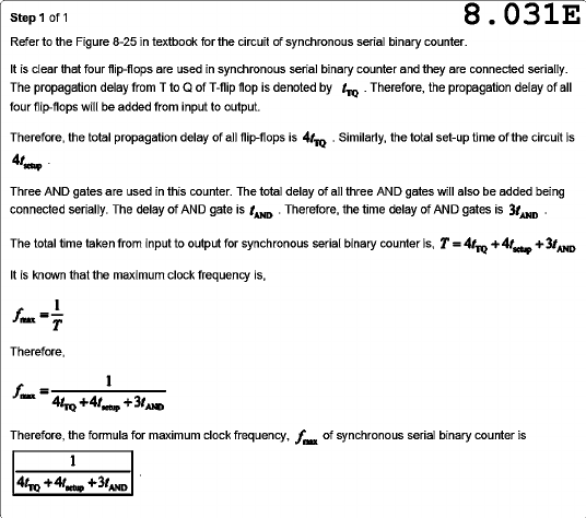 Step 1 of 1 8.031E Refer to the Figure 8-25 in textbook for the circuit of synchronous serial binary counter. It is clear that four flip-flops are used in synchronous serial binary counter and they are connected serially. The propagation delay from T to Q of T-flip flop is denoted by Therefore, the propagation delay of all four flip-flops will be added from input to output. Therefore, the total propagation delay of all flip-flops is Similarly, the total set-up time of the circuit is Three AND gates are used in this counter. The total delay of all three AND gates will also be added being connected serially. The delay of AND gate is - Therefore, the time delay of AND gates is The total time taken from input to output for synchronous serial binary counter is, It is known that the maximum clock frequency is, Therefore, Therefore, the formula for maximum clock frequency, of synchronous serial binary counter is