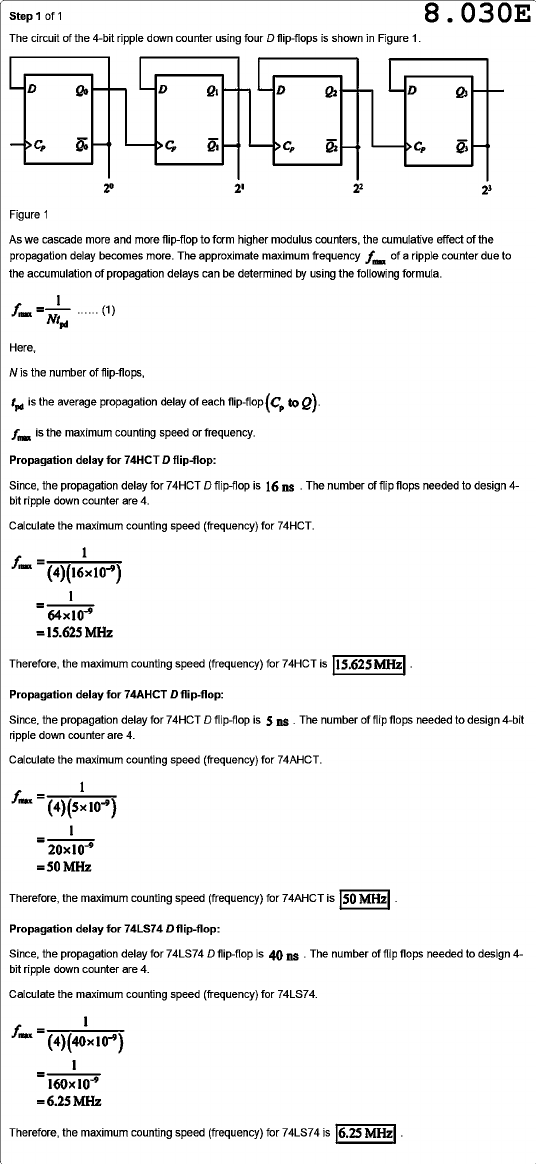 Step 1 of 1 8.030E The circuit of the 4-bit ripple down counter using four D flip-flops is shown in Figure 1. D D D D Figure 1 As we cascade more and more flip-flop to form higher modulus counters, the cumulative effect of the propagation delay becomes more. The approximate maximum frequency of a ripple counter due to the accumulation of propagation delays can be determined by using the following formula. Here, N is the number of flip-flops, is the average propagation delay of each flip-flop fmax is the maximum counting speed or frequency. Propagation delay for 74HCT D flip-flop: Since, the propagation delay for 74HCT D flip-flop is 16 The number of flip flops needed to design 4- bit ripple down counter are 4. Calculate the maximum counting speed (frequency) for 74HCT. = Therefore, the maximum counting speed (frequency) for 74HCT is 15.625 MHz Propagation delay for 74AHCT D flip-flop: Since, the propagation delay for 74HCT D flip-flop is 5 The number of flip flops needed to design 4-bit ripple down counter are 4. Calculate the maximum counting speed (frequency) for 74AHCT. Therefore, the maximum counting speed (frequency) for 74AHCT is 50 MHz Propagation delay for 74LS74 D flip-flop: Since, the propagation delay for 74LS74 D flip-flop is 40 ns The number of flip flops needed to design 4- bit ripple down counter are 4. Calculate the maximum counting speed (frequency) for 74LS74. Therefore, the maximum counting speed (frequency) for 74LS74 is 6.25 MHz