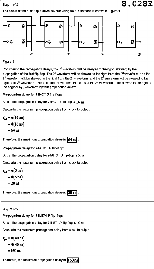 Step 1 of 2 8.028E The circuit of the 4-bit ripple down counter using four D flip-flops is shown in Figure 1. D & D D D 2² Figure 1 Considering the propagation delays, the waveform will be delayed to the right (skewed) by the propagation of the first flip-flop. The 2¹ waveform will be skewed to the right from the waveform, and the waveform will be skewed to the right from the 2¹ waveform, and the 2³ waveform will be skewed to the right from waveform. This is a cumulative effect that causes the 2³ waveform to be skewed to the right of the original waveform by four propagation delays. Propagation delay for 74HCT D flip-flop: Since, the propagation delay for 74HCT D flip-flop is 16 Calculate the maximum propagation delay from clock to output. =4(16ns) Therefore, the maximum propagation delay is - Propagation delay for 74AHCT D flip-flop: Since, the propagation delay for 74AHCT D flip-flop is 5 ns. Calculate the maximum propagation delay from clock to output. =4(5ns) Therefore, the maximum propagation delay is - Step 2 of 2 Propagation delay for 74LS74 D flip-flop: Since, the propagation delay for 74LS74 D flip-flop is 40 ns. Calculate the maximum propagation delay from clock to output. Therefore, the maximum propagation delay is 160 ns -