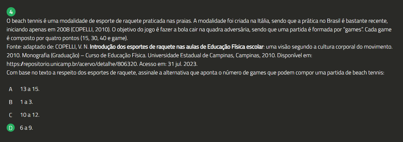 4 0 beach tennis é uma modalidade de esporte de raquete praticada nas praias. A modalidade foi criada na Itália, sendo que a prática no Brasil é bastante recente, iniciando apenas em 2008 (COPELLI, 2010). 0 objetivo do jogo é fazer a bola cair na quadra adversária, sendo que uma partida é formada por "games". Cada game é composto por quatro pontos (15, 30, 40 e game). Fonte: adaptado de: COPELLI, V.N. Introdução dos esportes de raquete nas aulas de Educação Física escolar: uma visão segundo a cultura corporal do movimento. 2010. Monografia (Graduação) - Curso de Educação Física. Universidade Estadual de Campinas, Campinas, 2010. Disponível em: https:/repositorio.unicamp.br/acervo/detalhe/806320. Acesso em: 31 jul. 2023. Com base no texto a respeito dos esportes de raquete, assinale a alternativa que aponta 0 número de games que podem compor uma partida de beach tennis: A 13 a 15. B 1a3. 10 a 12. D 6a9.