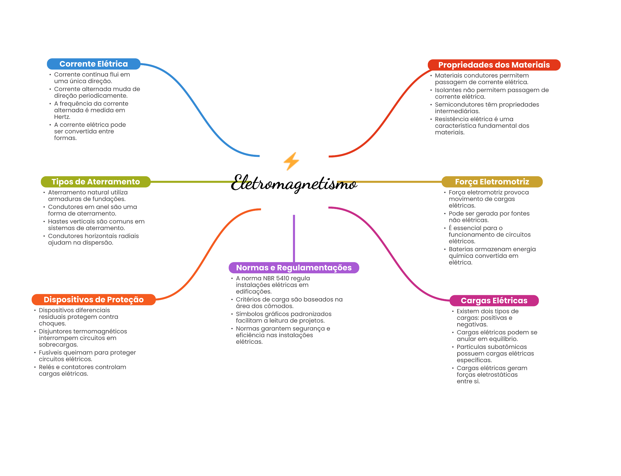 Corrente Elétrica Propriedades dos Materiais Corrents continua flui em Materials condutores permitem uma única direção. passagem de corrente elétrica. Corrente muda de não permitem passagem de direção corrente elétrica. A frequência da corrente propriedades medida em Hertz. elétrica uma A corrente elétrica pode fundamental dos convertida entre formas. Tipos de Aterramento Força Eletromotriz Aterramento natural utiliza Força eletromotriz de fundações. movimento de cargas Condutores em anel são uma elétricas. forma de aterramento. Pode ser gerada por fontes Hastes verticals são comune em não elétricas. de aterramento. É para Condutores funcionamento de circuitos ajudam na dispersão. elétricos. Baterias energia convertida em elétrica. Normas e Regulamentações A norma NBR 5410 regula elétricas em edificações. Dispositivos de Proteção Critérios de carga são baseados na Cargas Elétricas área dos cômodos. Dispositivos protegem contra gráficos padronizados Existem dois tipos de choques. facilitam a leitura de projetos. cargas: positivas . Disjuntores Normas garantem segurança eficiência Cargas elétricas podem circuitos em elétricas. em equilibrio. sobrecargas. Partículas para proteger possuem cargas elétricas elétricos. contatores controlam elétricas geram cargas forças entre