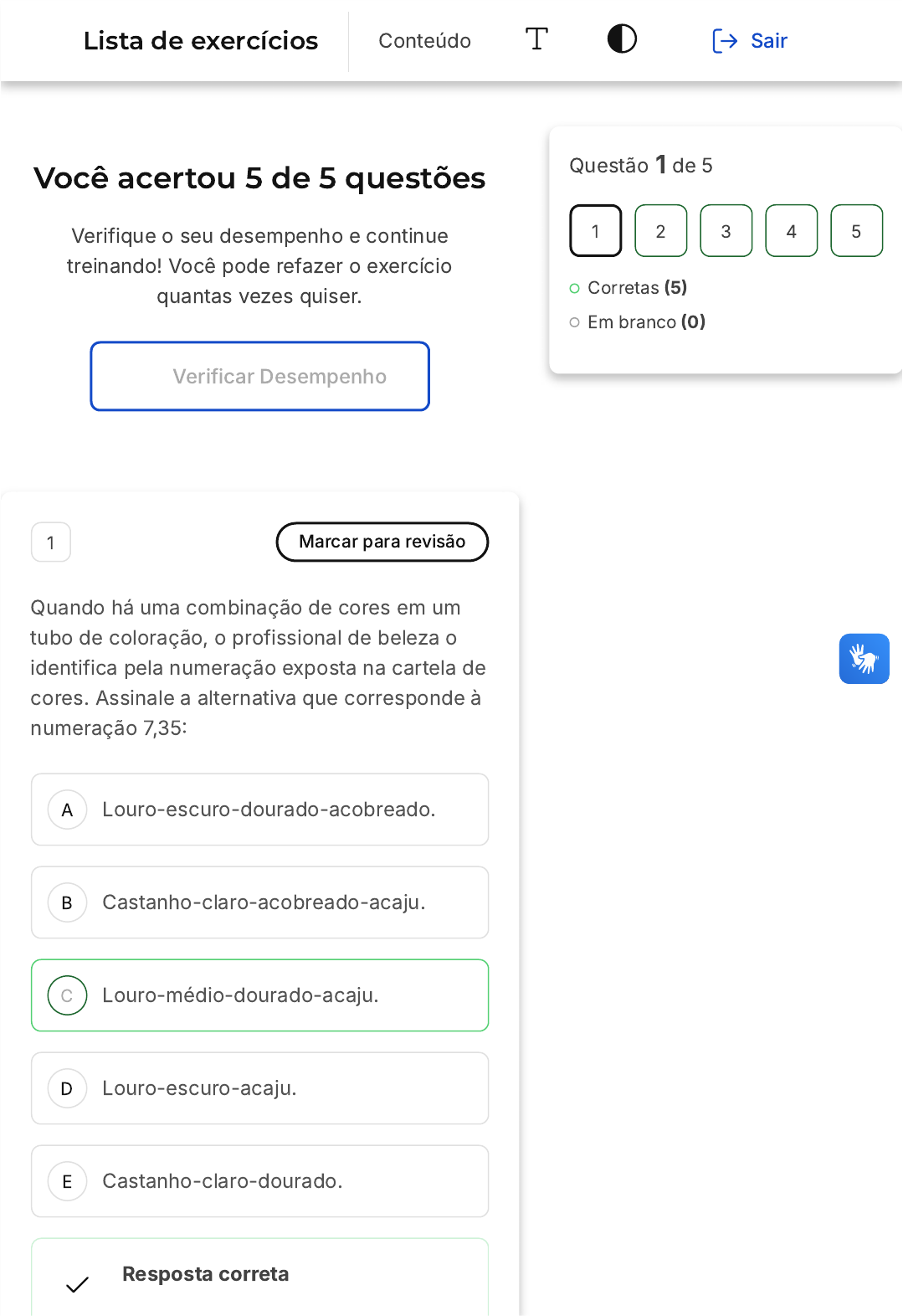 Você acertou 5 de 5 questões Verifique o seu desempenho e continue treinando! Você pode refazer o exercício quantas vezes quiser. Verificar Desempenho A B C D E 1 Marcar para revisão Quando há uma combinação de cores em um tubo de coloração, o profissional de beleza o identifica pela numeração exposta na cartela de cores. Assinale a alternativa que corresponde à numeração 7,35: Louro-escuro-dourado-acobreado. Castanho-claro-acobreado-acaju. Louro-médio-dourado-acaju. Louro-escuro-acaju. Castanho-claro-dourado. Resposta correta Questão 1 de 5 Corretas (5) Em branco (0) 1 2 3 4 5 Lista de exercícios Conteúdo Sair A B Parabéns, você selecionou a alternativa correta. Confira o gabarito comentado! Gabarito Comentado A numeração 7,35 em um tubo de coloração corresponde à cor "Louro- médio-dourado-acaju". Na nomenclatura de cores para cabelos, o primeiro número geralmente indica o nível de cor base (neste caso, 7 para "Louro médio"), enquanto os números após a vírgula representam os tons secundários (neste caso, 3 para "dourado" e 5 para "acaju"). Portanto, a alternativa correta é a "C". 2 Marcar para revisão Ao consultar a estrela de colorimetria, nós nos deparamos com diversas cores, reflexos e números. Correlacione as colunas seguindo o padrão da estrela apresentado. ( 1 ) azul ( ) irisado ( 6 ) vermelho ( ) cinza ( 3 ) amarelo ( ) vermelho ( 7 ) verde ( ) cobre ( 5 ) acaju ( ) dourado ( 2 ) roxo ( ) acaju ( 4 ) alaranjado ( ) mate 2, 1, 6, 4, 3, 5, 7 7,5, 3, 1, 2, 4, 6 C D E 6, 7, 3, 3, 1, 5, 2 6, 7, 3, 4, 1, 5, 2 7, 6, 1, 3, 2, 4, 5 Resposta correta Parabéns, você selecionou a alternativa correta. Confira o gabarito comentado! Gabarito Comentado A sequência correta para correlacionar as colunas, seguindo o padrão da estrela de colorimetria, é: 2, 1, 6, 4, 3, 5, 7. Isso significa que o roxo corresponde ao acaju, o azul ao irisado, o vermelho ao cinza, o alaranjado ao mate, o amarelo ao vermelho, o acaju ao dourado e o verde ao cobre. 3 Marcar para revisão O fundo de clareamento é de grande relevância na análise técnica, que antecede o serviço de coloração. Por quê? A B C D E Porque o fundo de clareamento é obtido a partir da degradação dos pigmentos de melanina presentes no córtex do cabelo e indica a cor natural dos cabelos. Porque a resultante do processo de coloração deve considerar a sobreposição entre a cor aplicada e o fundo de clareamento obtido durante a oxidação. Porque o fundo de clareamento se dá a partir da agressão natural provocada pela ação do oxigênio, intensificada pelo sol, mar, pela piscina e umidade, provocando uma oxidação que deixará os cabelos escuros mais amarelos, devido à exposição a esses fatores. Porque, na atualidade, usamos um padrão universal que classifica para a análise técnica das cores naturais e seus respectivos fundos de clareamentos. Porque o fundo de clareamento deve ser compatível com a cor aplicada. Resposta correta Parabéns, você selecionou a alternativa correta. Confira o gabarito comentado! Gabarito Comentado A alternativa correta é a B, que afirma que a resultante do processo de coloração A B C deve considerar a sobreposição entre a cor aplicada e o fundo de clareamento obtido durante a oxidação. Isso significa que, para obter o resultado desejado na coloração, é necessário levar em conta a cor que o cabelo adquiriu após o processo de clareamento. Se essa sobreposição não for considerada, o resultado final pode ser diferente do esperado, pois a cor aplicada interage com a cor do fundo de clareamento. 4 Marcar para revisão Na atualidade, as formulações cosméticas das colorações integram diversas substâncias a fim de promover as ações desejadas para o resultado esperado. Marque a alternativa que melhor descreve os cuidados dos profissionais para com os clientes. Solicita ao cliente um detalhamento da sua vida profissional e social. Aplica a coloração sem análise prévia, levando em conta apenas o relato do cliente. Faz a análise técnica dos fios, preparação do material e do cliente, o preparo do produto, a aplicação da cor e respeita o tempo de pausa indicado pelo fabricante. D E Aplica a coloração sem verificar as informações do fabricante. Aplica a coloração levando em conta apenas o relato do cliente e não leva em consideração o tempo de pausa indicado pelo fabricante. Resposta correta Parabéns, você selecionou a alternativa correta. Confira o gabarito comentado! Gabarito Comentado A alternativa correta é a C, que descreve um procedimento completo e cuidadoso para a aplicação de coloração capilar. O profissional realiza uma análise técnica dos fios, prepara o material e o cliente, prepara o produto, aplica a cor e respeita o tempo de pausa indicado pelo fabricante. Este procedimento garante que a coloração seja aplicada de forma segura e eficaz, levando em consideração as especificidades do cabelo do cliente e as instruções do fabricante do produto. 5 Marcar para revisão Há diversos tipos de colorações utilizadas no mercado cosmético atual. Marque a alternativa que se refere à coloração permanente. A B C D E Permitem menor poder de clareamento devido ao baixo teor de alcalinidade e menor poder de oxidação. São colorações de fácil aplicabilidade e apresentam-se, geralmente, em forma de xampus. São elaboradas a partir de corantes extraídos das diversas partes dos vegetais; folhas, frutos, casca e sementes. São as mais utilizadas no mercado, cerca de 80%, por sua capacidade de penetração na fibra capilar, conferindo maior durabilidade na fixação da cor e cobertura completa dos fios brancos. Possuem em sua composição sais metálicos como agentes descolorantes. Entre eles, estão: composto de prata, cobre, ferro, níquel, cobalto e acetato de chumbo, com concentração máxima regulada por legislação específica na maioria dos países. Apesar da complexidade das substâncias envolvidas, não