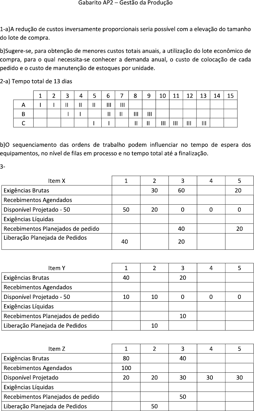 Gabarito AP2 Gestão da Produção 1-a)A redução de custos inversamente proporcionais seria possível com a elevação do tamanho do lote de compra. b)Sugere-se, para obtenção de menores custos totais anuais, a utilização do lote econômico de compra, para o qual necessita-se conhecer a demanda anual, o custo de colocação de cada pedido e o custo de manutenção de estoques por unidade. Tempo total de 13 dias 1 2 3 4 5 6 7 8 9 10 11 12 13 14 15 A I I III III I III III I III III III III b)O sequenciamento das ordens de trabalho podem influenciar no tempo de espera dos equipamentos, no nível de filas em processo e no tempo total até a finalização. 3- Item X 1 2 3 4 5 Exigências Brutas 30 60 20 Recebimentos Agendados Disponível Projetado 50 50 20 0 0 0 Exigências Líquidas Recebimentos Planejados de pedido 40 20 Liberação Planejada de Pedidos 40 20 Item Y 1 2 3 4 5 Exigências Brutas 40 20 Recebimentos Agendados Disponível Projetado 50 10 10 0 0 0 Exigências Líquidas Recebimentos Planejados de pedido 10 Liberação Planejada de Pedidos 10 Item Z 1 2 3 4 5 Exigências Brutas 80 40 Recebimentos Agendados 100 Disponível Projetado 20 20 30 30 30 Exigências Líquidas Recebimentos Planejados de pedido 50 Liberação Planejada de Pedidos 50Item W 1 2 3 4 5 Exigências Brutas 50 Recebimentos Agendados Disponível Projetado 0 0 0 0 0 Exigências Líquidas Recebimentos Planejados de pedido 50 Liberação Planejada de Pedidos 50 4- Alternativa correta: a)( X ) Na abordagem tradicional a organização mantém o nível da água alto (estoque) para navegar com mais segurança. 5- (F) jus: objetivo das empresas consiste em minimizar a ociosidade de recursos e a espera de tarefas a serem processadas pela programação e sequenciamento.. (V) (F) jus: A antecipação da produção reduz a necessidade de horas-extras no pico da demanda. o tempo de espera dos clientes, como o nível de ociosidade dos centros de trabalho, podem ser amenizados pelo esforço em sequenciar as ordens de produção corretamente.