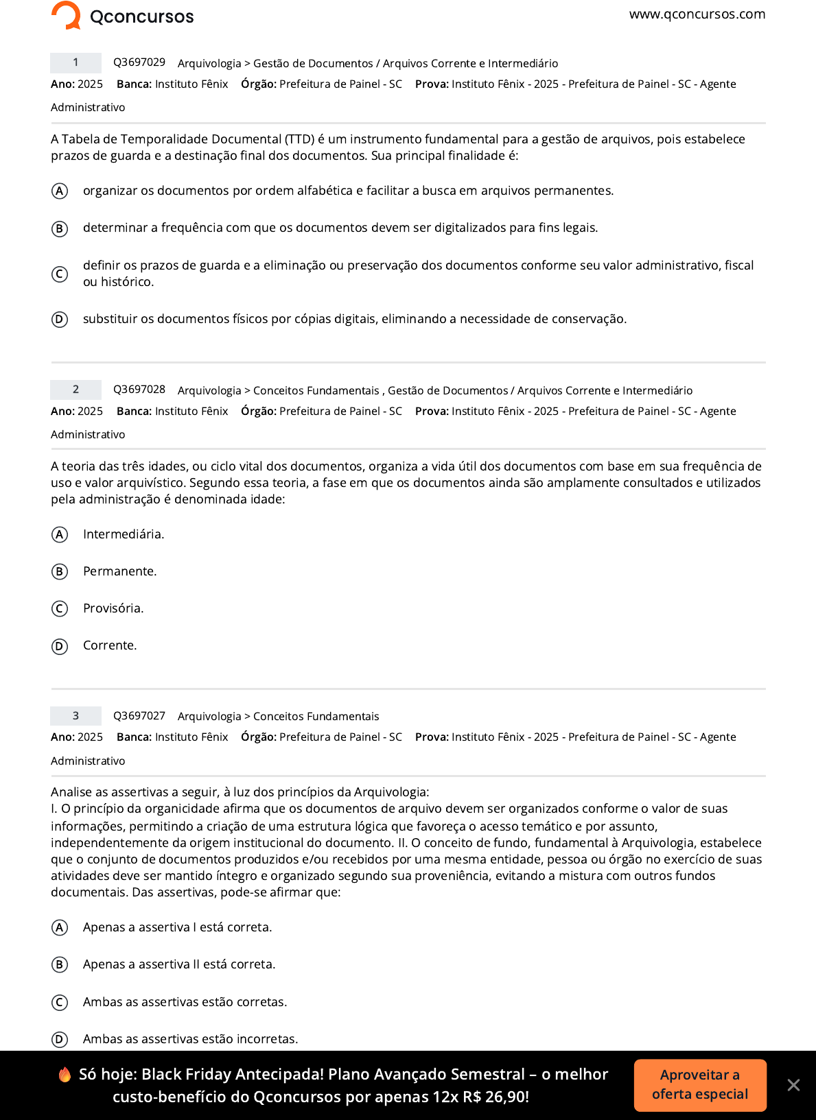 www.qconcursos.com Ano: 2025 Banca: Instituto Fênix Órgão: Prefeitura de Painel - SC A Tabela de Temporalidade Documental (TTD) é um instrumento fundamental para a gestão de arquivos, pois estabelece prazos de guarda e a destinação final dos documentos. Sua principal finalidade é: A organizar os documentos por ordem alfabética e facilitar a busca em arquivos permanentes. B determinar a frequência com que os documentos devem ser digitalizados para fins legais. C definir os prazos de guarda e a eliminação ou preservação dos documentos conforme seu valor administrativo, fiscal ou histórico. D substituir os documentos físicos por cópias digitais, eliminando a necessidade de conservação. Ano: 2025 Banca: Instituto Fênix Órgão: Prefeitura de Painel - SC A teoria das três idades, ou ciclo vital dos documentos, organiza a vida útil dos documentos com base em sua frequência de uso e valor arquivístico. Segundo essa teoria, a fase em que os documentos ainda são amplamente consultados e utilizados pela administração é denominada idade: A Intermediária. B Permanente. C Provisória. D Corrente. Ano: 2025 Banca: Instituto Fênix Órgão: Prefeitura de Painel - SC Analise as assertivas a seguir, à luz dos princípios da Arquivologia: I. O princípio da organicidade afirma que os documentos de arquivo devem ser organizados conforme o valor de suas informações, permitindo a criação de uma estrutura lógica que favoreça o acesso temático e por assunto, independentemente da origem institucional do documento. II. O conceito de fundo, fundamental à Arquivologia, estabelece que o conjunto de documentos produzidos e/ou recebidos por uma mesma entidade, pessoa ou órgão no exercício de suas atividades deve ser mantido íntegro e organizado segundo sua proveniência, evitando a mistura com outros fundos documentais. Das assertivas, pode-se afirmar que: A Apenas a assertiva I está correta. B Apenas a assertiva II está correta. C Ambas as assertivas estão corretas. D Ambas as assertivas estão incorretas. 1 Q3697029 >Arquivologia Gestão de Documentos / Arquivos Corrente e Intermediário Prova: Instituto Fênix - 2025 - Prefeitura de Painel - SC - Agente Administrativo 2 Q3697028 >Arquivologia Conceitos Fundamentais , Gestão de Documentos / Arquivos Corrente e Intermediário Prova: Instituto Fênix - 2025 - Prefeitura de Painel - SC - Agente Administrativo 3 Q3697027 >Arquivologia Conceitos Fundamentais Prova: Instituto Fênix - 2025 - Prefeitura de Painel - SC - Agente Administrativo 🔥 Só hoje: Black Friday Antecipada! Plano Avançado Semestral – o melhor custo-benefício do Qconcursos por apenas 12x R$ 26,90! Aproveitar a oferta especial https://www.qconcursos.com/ https://www.qconcursos.com/questoes-de-concursos/bancas/instituto-fenix https://www.qconcursos.com/questoes-de-concursos/institutos/prefeitura-de-painel-sc https://www.qconcursos.com/questoes-de-concursos/bancas/instituto-fenix https://www.qconcursos.com/questoes-de-concursos/institutos/prefeitura-de-painel-sc https://www.qconcursos.com/questoes-de-concursos/bancas/instituto-fenix https://www.qconcursos.com/questoes-de-concursos/institutos/prefeitura-de-painel-sc https://www.qconcursos.com/questoes-de-concursos/questoes/67a24662-b5 https://www.qconcursos.com/questoes-de-concursos/disciplinas/arquivologia-arquivologia https://www.qconcursos.com/questoes-de-concursos/disciplinas/arquivologia-arquivologia/gestao-de-documentos-arquivos-corrente-e-intermediario https://www.qconcursos.com/questoes-de-concursos/provas/instituto-fenix-2025-prefeitura-de-painel-sc-agente-administrativo https://www.qconcursos.com/questoes-de-concursos/provas/instituto-fenix-2025-prefeitura-de-painel-sc-agente-administrativo https://www.qconcursos.com/questoes-de-concursos/questoes/679f7778-b5 https://www.qconcursos.com/questoes-de-concursos/disciplinas/arquivologia-arquivologia https://www.qconcursos.com/questoes-de-concursos/disciplinas/arquivologia-arquivologia/conceitos-fundamentais https://www.qconcursos.com/questoes-de-concursos/disciplinas/arquivologia-arquivologia/gestao-de-documentos-arquivos-corrente-e-intermediario https://www.qconcursos.com/questoes-de-concursos/provas/instituto-fenix-2025-prefeitura-de-painel-sc-agente-administrativo https://www.qconcursos.com/questoes-de-concursos/provas/instituto-fenix-2025-prefeitura-de-painel-sc-agente-administrativo https://www.qconcursos.com/questoes-de-concursos/questoes/679cbf80-b5 https://www.qconcursos.com/questoes-de-concursos/disciplinas/arquivologia-arquivologia https://www.qconcursos.com/questoes-de-concursos/disciplinas/arquivologia-arquivologia/conceitos-fundamentais https://www.qconcursos.com/questoes-de-concursos/provas/instituto-fenix-2025-prefeitura-de-painel-sc-agente-administrativo https://www.qconcursos.com/questoes-de-concursos/provas/instituto-fenix-2025-prefeitura-de-painel-sc-agente-administrativo Ano: 2025 Banca: Avança SP Órgão: Prefeitura de Varginha - MG Assinale a alternativa INCORRETA em relação à gestão, manutenção e preservação dos documentos digitalizados: A Os representantes digitais decorrentes dos procedimentos de digitalização serão utilizados em substituição aos documentos arquivísticos originais, para todas as finalidades legais. B Os representantes digitais estão submetidos às regras de gestão e preservação de documentos arquivísticos semelhantes ao que estariam expostos os originais. C A perda, inconsistência, corrupção, indisponibilidade ou falta de confidencialidade dos representantes digitais podem causar grandes problemas administrativos na instituição, considerando que os documentos originais já foram eliminados. D Os documentos arquivísticos digitais devem ser preservados e acessíveis por todo ciclo de vida desde sua produção, independentemente de ser ou não permanentes. E O servidor responsável pela preservação dos documentos arquivísticos digitais deve criar seu próprio método de preservaçã