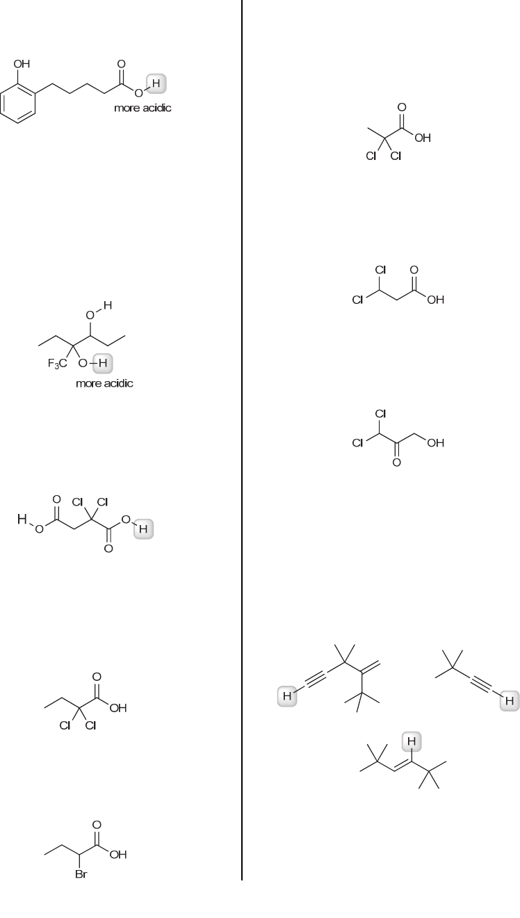 CHAPTER 3 79 we saw in Problem 3.15e. By comparing pKa values from Table 3.1, we conclude that the following proton is more acidic (lower pKa value). This suggests that a negative charge will be more stabilized when spread over two oxygen atoms, rather than being spread over one oxygen atom and three carbon atoms (oxygen is more electronegative than carbon). 3.18. (a) The highlighted proton is the most acidic. When this location is deprotonated, the resulting conjugate base is stabilized by the electron-withdrawing effects of the electronegative fluorine atoms: (b) The highlighted proton is more acidic. When this location is deprotonated, the resulting conjugate base is stabilized by the electron-withdrawing effects of the electronegative chlorine atoms, which are closer to this proton than the other acidic proton (left): 3.19. (a) The compound with two chlorine atoms is more acidic, because of the electron-withdrawing effects of the additional chlorine atom, which helps stabilize the conjugate base that is formed when the proton is removed. (b) The more acidic compound is the one in which the bromine atom is closer to the acidic proton. The electron-withdrawing effects of the bromine atom stabilize the conjugate base that is formed when the proton is removed. 3.20. (a) In the following compound, one of the chlorine atoms has been moved closer to the acidic proton of the carboxylic acid group, which further stabilizes the conjugate base that is formed when the proton is removed. (b) In the following compound, one of the chlorine atoms has been moved farther away from the acidic proton of the carboxylic acid group, and the distant chlorine atom is less capable of stabilizing the conjugate base that is formed when the proton is removed. (c) There are many acceptable answers to this question, since there are many constitutional isomers that lack the carboxylic acid functional group. One example is shown below. This compound is not a carboxylic acid, so its conjugate base is not resonance-stabilized: 3.21. The most acidic proton is highlighted in each of the following compounds. For each of the first two compounds, deprotonation leads to a conjugate base in which the negative charge is associated with an sp hybridized orbital (which is more stable than being associated with an sp2 or sp3 hybridized orbital). In the final compound, deprotonation leads to a conjugate base in which the negative charge is associated with an sp2 hybridized orbital (which is more stable than being associated with an sp3 hybridized orbital). www.MyEbookNiche.eCrater.com