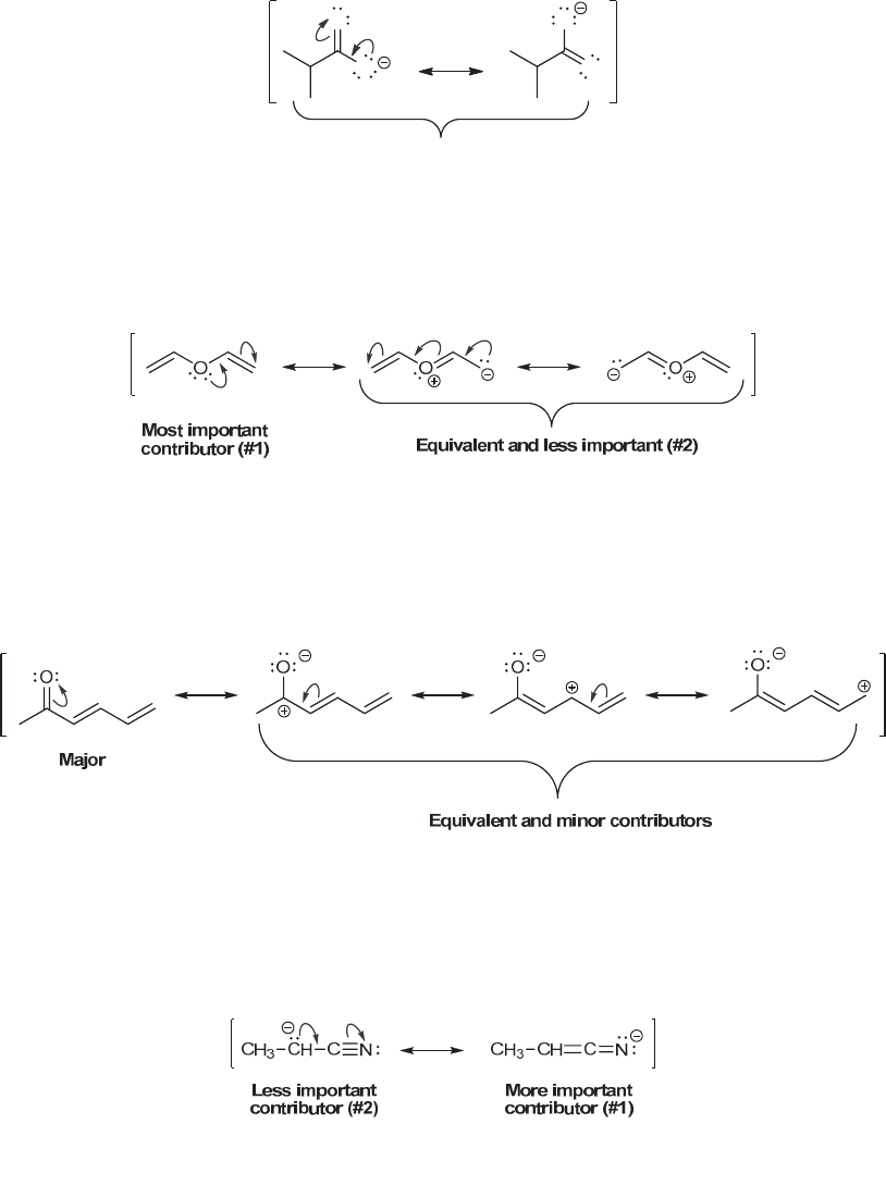 42 CHAPTER 2 (b) Using the skills developed in the previous SkillBuilders, we begin by drawing all significant resonance structures, shown below. Both resonance structures have filled octets and a negative charge on an oxygen atom. Both resonance structures are equivalent and equally significant. O O O O Equivalent and major (c) Using the skills developed in the previous SkillBuilders, we begin by drawing all significant resonance structures, shown below. None of the three structures has an atom with an incomplete octet. The first resonance structure is the largest contributor because it has filled octets and no formal charges. The other two resonance structures are equivalent and less significant contributors because they contain formal charges. (d) Using the skills developed in the previous SkillBuilders, we begin by drawing all significant resonance structures, shown below. The first resonance structure is the only major contributor because it is the only one with filled octets. Recall that a structure with filled octets and no formal charges is an ideal Lewis structure. The other three resonance structures are approximately equivalent and minor contributors because each one is missing an octet (they also have formal charges, but that is a less significant feature to consider when ranking resonance forms). (e) Using the skills developed in the previous SkillBuilders, we begin by drawing all significant resonance structures, shown below. Neither resonance structure has an incomplete octet so they are both expected to be major contributors to the hybrid. The second resonance structure is the more significant contributor because it has the negative charge on the more electronegative nitrogen atom. The first resonance structure is less significant because the negative charge is on the less electronegative carbon atom. (f) This cation has two different resonance patterns that can be employed, using the lone pair or the bond to fill the vacancy on carbon, giving a total of three resonance structures. The middle resonance structure is the only major contributor because it is the only one with filled octets. The other two structures are equivalent (missing one octet and www.MyEbookNiche.eCrater.com