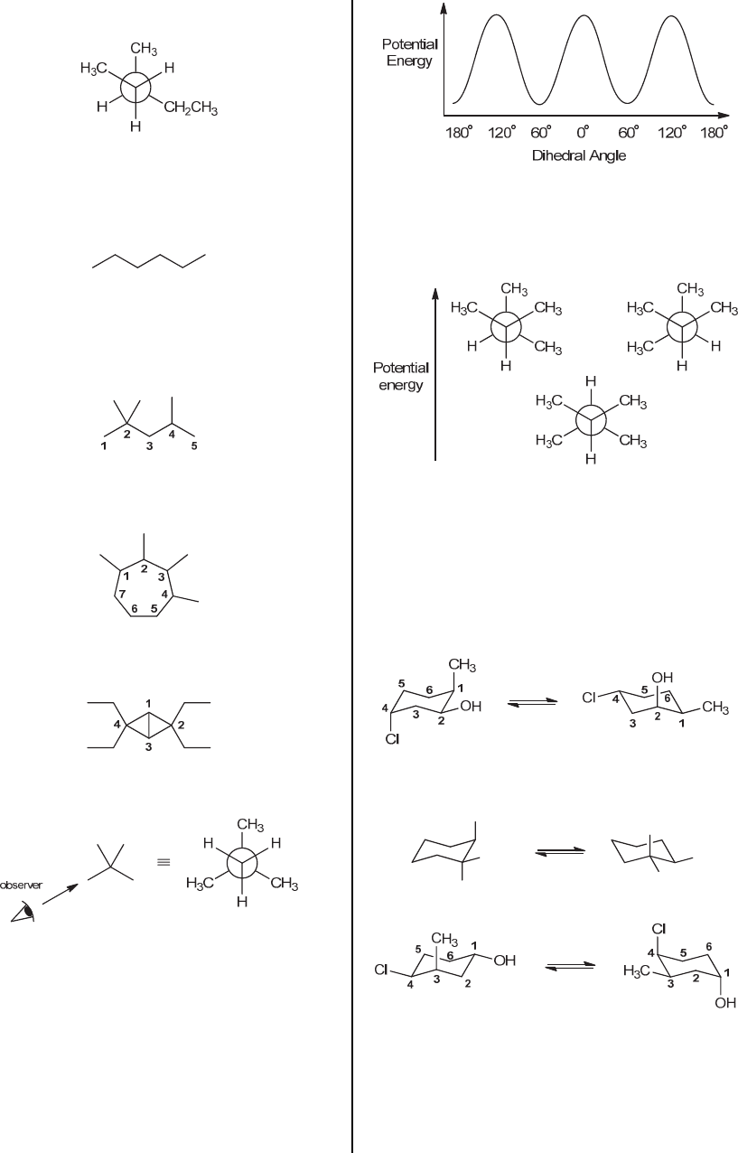 CHAPTER 4 119 conformation, there is only one Me-Me gauche interaction. 4.39. Both compounds share the same molecular formula (C6H14). That is, they are constitutional isomers, and the unbranched isomer is expected to have the larger heat of combustion: 4.40. (a) The name indicates that the parent is a five-carbon chain and there are three substituents (two methyl groups at C2, and one methyl group at C4): (b) The name indicates that the parent is a seven- membered ring and there are four substituents (all methyl groups), as shown: (c) The name indicates a bicyclic parent with two ethyl groups at C2 and two ethyl groups at C4, as shown: 4.41. We begin by drawing a Newman projection of 2,2- dimethylpropane: Notice that the front carbon has three identical groups (all H’s), and the back carbon atom also has three identical groups (all methyl groups). As such, we expect all staggered conformations to be degenerate, and we expect all eclipsed conformations to be degenerate as well. Therefore, the energy diagram will more closely resemble the shape of the energy diagram for the conformational analysis of ethane. 4.42. Two of the staggered conformations are degenerate. The remaining staggered conformation is lower in energy than the other two, as shown: 4.43. For each of the following cases, we draw the second chair conformation using a numbering system to ensure the substituents are placed correctly. The numbering system does NOT need to adhere to IUPAC rules, as it is just a tool that we are using to draw both chair conformations correctly. Notice that a ring flip causes all equatorial groups to become axial groups, and vice versa. (a) (b) Cl ClOH OH CH3 CH3 1 2 3 4 5 6 3 4 5 6 1 2 (c) 4.44. (a) The second compound is expected to have a higher heat of combustion because it has more carbon atoms. (b) The first compound is expected to have a higher heat of combustion because it cannot adopt a chair conformation in which both methyl groups occupy equatorial positions. www.MyEbookNiche.eCrater.com