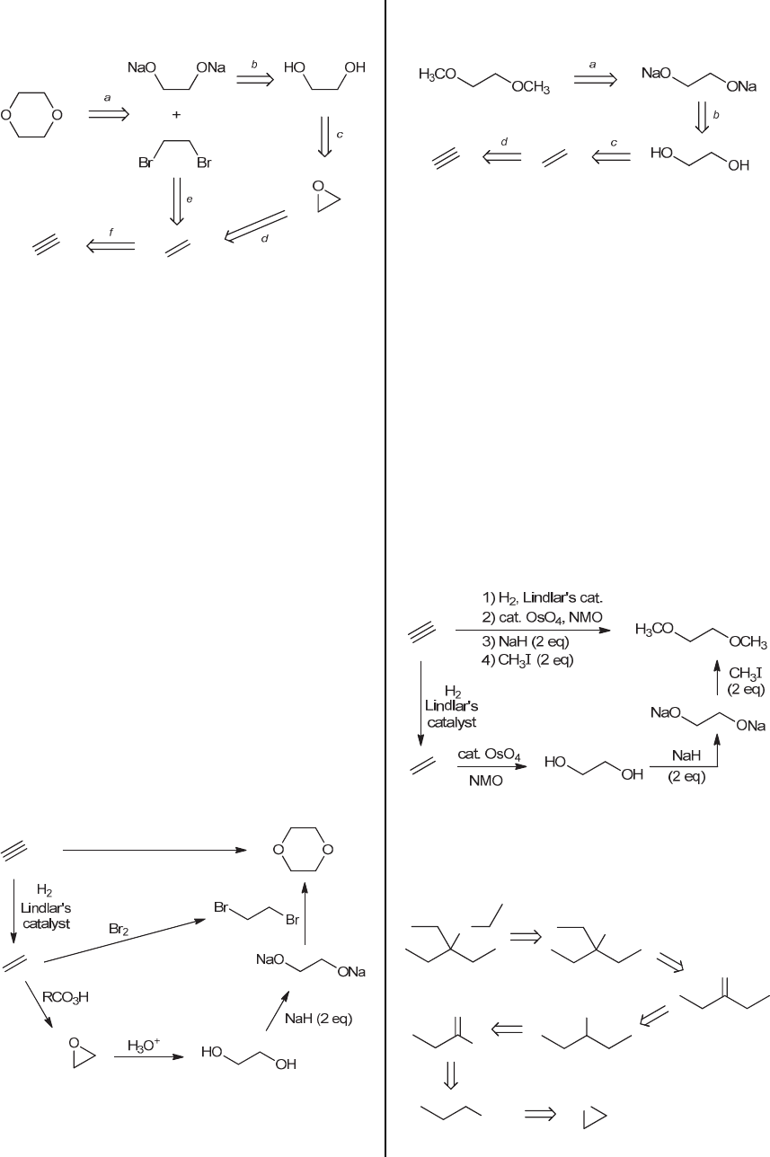 472 CHAPTER 13 retrosynthetic analysis represents one such method. An explanation of each of the steps (a-f) follows. a. The cyclic product can be made by treating a dianion with a dihalide (via two successive SN2 reactions). b. The dianion can be made by treating the corresponding diol with two equivalents of a strong base (such as NaH). c. The diol can be made from an epoxide, via a ring- opening reaction (either under acidic conditions or under basic conditions). d. The epoxide can be made by treating the corresponding alkene with a peroxy acid. e. The dibromide can be made via bromination of the corresponding alkene. f. The alkene can be made via hydrogenation of the corresponding alkyne, in the presence of Lindlar’s catalyst. Now let’s draw the forward scheme. Acetylene undergoes hydrogenation in the presence of Lindlar’s catalyst to afford ethylene, which can be converted to an epoxide upon treatment with a peroxy acid. Acid- catalyzed ring-opening of the epoxide gives a diol (base- catalyzed conditions can also be used). Treatment of the diol with two equivalents of a strong base, such as NaH, gives a dianion. The dianion will react with 1,2- dibromoethane (formed from bromination of ethylene) to give the desired cyclic product via two successive SN2 reactions. 13.49. There are certainly many acceptable methods for achieving the desired transformation. The following retrosynthetic analysis represents one such method. An explanation of each of the steps (a-d) follows. a. The product has two ether groups, each of which can be formed via a Williamson ether synthesis, from the dianion shown. b. The dianion can be made by treating the corresponding diol with two equivalents of a strong base (such as NaH). c. The diol can be made from an alkene, via a dihydroxylation process. d. The alkene can be made via hydrogenation of the corresponding alkyne, in the presence of Lindlar’s catalyst. Now let’s draw the forward scheme. Acetylene undergoes hydrogenation in the presence of Lindlar’s catalyst to afford ethylene, which can be converted to a diol via a dihydroxylation process. Treatment of the diol with two equivalents of a strong base, such as NaH, gives a dianion. The dianion will react with two equivalents of methyl iodide giving the product (via a Williamson ether synthesis, twice). 13.50. There are certainly many acceptable methods for achieving the desired transformation. The following retrosynthetic analysis represents one such method. An explanation of each of the steps (a-f) follows. O OH O H O OHO OH a b c d e f www.MyEbookNiche.eCrater.com