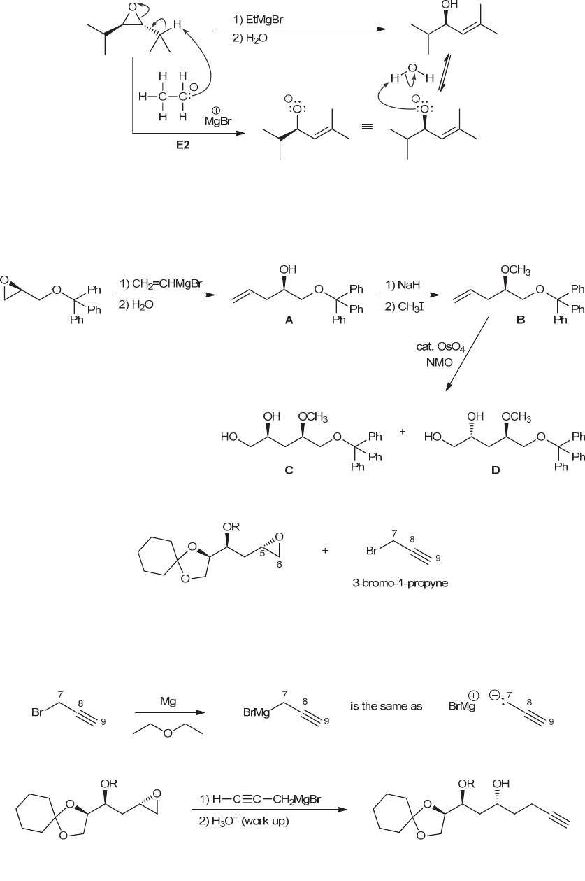 CHAPTER 13 479 13.62. Since the Grignard reagent is both a strong base and a strong nucleophile, substitution and elimination can both occur. Indeed, they compete with each other. As we discussed in Chapter 7, elimination will be favored when the substrate is secondary. Both electrophilic positions in this epoxide are secondary, and so, elimination predominates: 13.63. In the first step, vinylmagnesium bromide is a powerful nucleophile and can attack the epoxide in a ring- opening reaction (attacking the less substituted carbon) to afford an alcohol. This alcohol is subsequently converted to an ether via a Williamson ether synthesis. Dihydroxylation of the terminal alkene with catalytic OsO4 in the presence of NMO gives a mixture of diastereomeric diols. 13.64. A new carbon-carbon bond must be made between C6 and C7: Epoxides are electrophilic functional groups and are subject to attack by a nucleophile. In order for the OH group to be ultimately positioned at C5, the nucleophile must attack the less substituted side of the epoxide (C6), which requires basic conditions (rather than acidic conditions, which often favors attack at the more substituted carbon). The nucleophile for this reaction must be made from 3-bromo-1-propyne, which can be achieved by treatment with magnesium, thereby forming the Grignard reagent: The desired transformation can therefore be achieved in the following way: www.MyEbookNiche.eCrater.com