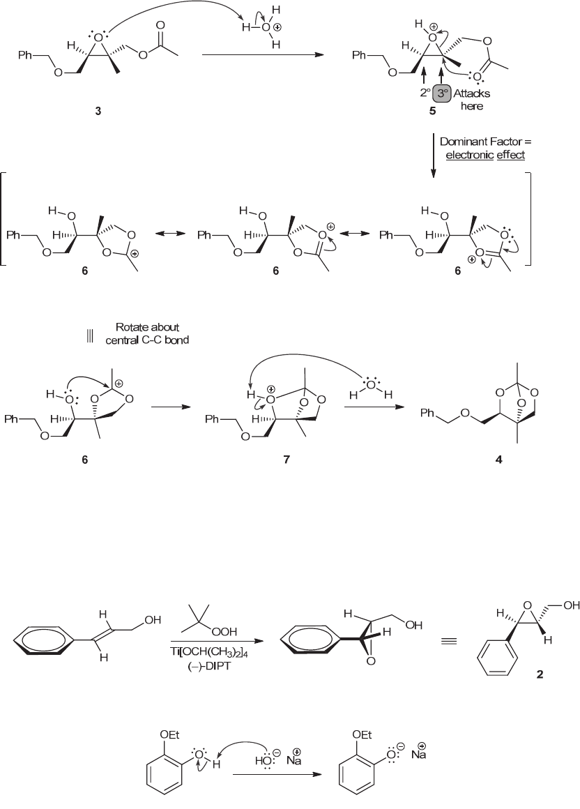 482 CHAPTER 13 13.67. (a) The conversion of 1 to 2 utilizes a Sharpless asymmetric epoxidation, so the product is expected to be an epoxide. The stereochemical outcome can be deduced by applying the paradigm provided in Figure 13.3. Since the chiral catalyst was formed using (–)-DIPT, which affords the same stereochemical outcome as (–)-DET, we can conclude that the epoxide forms “below the plane” of the alkene: (b) First consider the reagents. Sodium hydroxide will deprotonate 2-ethoxyphenol to give a phenolate ion. The phenolate ion can serve as a nucleophile and attack epoxide 2 in a ring-opening reaction. Nucleophilic attack occurs at the benzylic position (the carbon atom attached to the benzene ring) to form an alkoxide intermediate, that is protonated to give diol 3. www.MyEbookNiche.eCrater.com