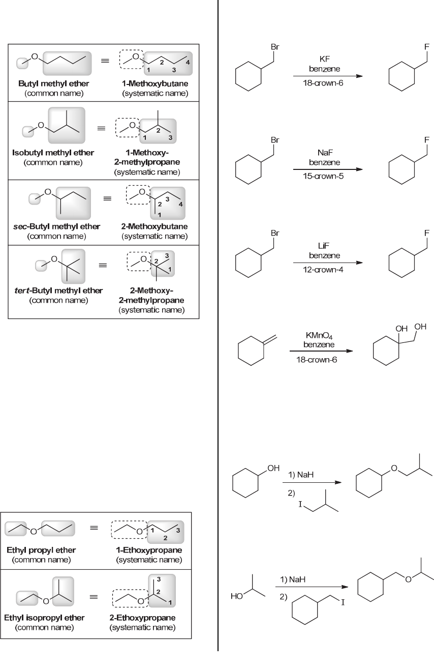 448 CHAPTER 13 four ways to assemble a four-carbon substituent. These options result in four possible ethers, shown below, along with their common and systematic names. The common names of the four butyl groups were discussed in Section 4.2. The systematic name of each compound uses the longest continuous carbon chain as the parent and treats the methoxy group as a substituent in all four cases. Now let’s consider the possibilities when R has two carbon atoms and Ŕ has three carbon atoms. There is only one way to have a two-carbon substituent, but there are two ways to assemble a three-carbon substituent (propyl or isopropyl). These options result in two possible ethers, shown below, along with their common and systematic names. The common names of the two propyl groups were discussed in Section 4.2. Each systematic name uses the longest continuous carbon chain as the parent (propane) and treats the ethoxy group as a substituent. 13.4. (a) The cation is potassium, so we must use 18-crown-6, which solvates potassium ions. (b) The cation is sodium, so we must use 15-crown-5, which solvates sodium ions. (c) The cation is lithium, so we must use 12-crown-4, which solvates lithium ions. (d) The cation is potassium, so we must use 18-crown-6, which solvates potassium ions. 13.5. (a) A Williamson ether synthesis will be more efficient with a less sterically hindered substrate, since the process involves an SN2 reaction. Therefore, in this case, it is better to start with a secondary alcohol and a primary alkyl halide, rather than a primary alcohol and a secondary alkyl halide: (b) In this case, it is better to start with a secondary alcohol and a primary alkyl halide, rather than a primary alcohol and a secondary alkyl halide: www.MyEbookNiche.eCrater.com