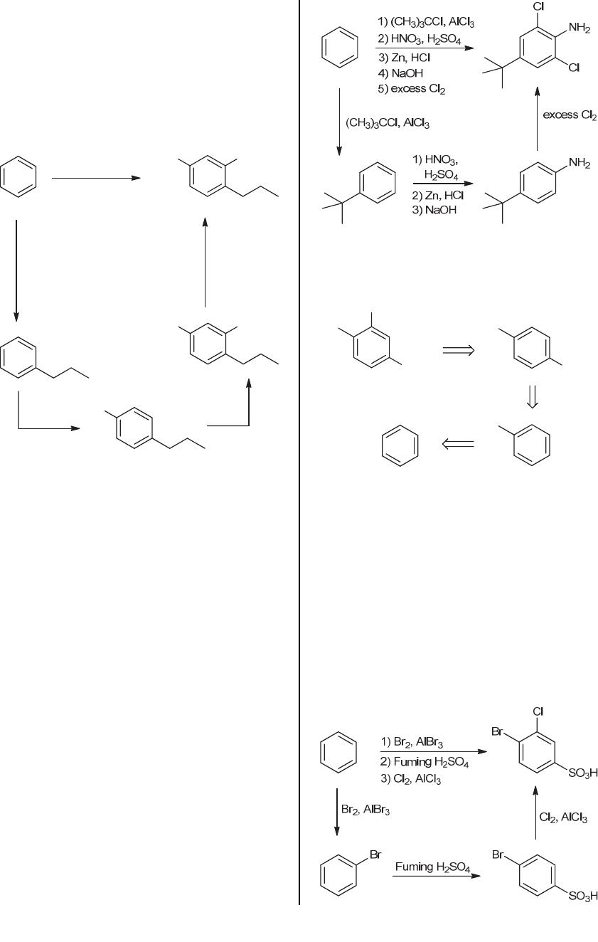 658 CHAPTER 18 not have been achieved via direct alkylation (due to the problem of carbocation rearrangements). Then, a nitro group is installed in the para position because of the directing effects (and steric effects) of the propyl group. Bromination then installs the bromine atom in the correct location (ortho to the activating group), and finally, reduction of the nitro group gives the product. H2N Br 1) CH3CH2COCl, AlCl3 2) HCl, Zn(Hg), heat 3) HNO3, H2SO4 4) Br2, AlBr3 1) CH3CH2COCl, AlCl3 2) HCl, Zn(Hg), heat HNO3, H2SO4 O2N Br2, AlBr3 O2N Br 5) Zn, HCl 1) Zn, HCl 6) NaOH 2) NaOH The strategy above represents just one method for making the desired the compound. There are often other acceptable solutions. For example, the nitro group and the bromo group can be installed in the opposite order (first the bromo group and then the nitro group), although this would require a blocking group (to help direct the incoming bromo group into the ortho position). The first method (shown above) avoids the need for a blocking group. (c) While there is more than one way to achieve the desired transformation, the following strategy is perhaps the most efficient, as it avoids the need for a blocking group. The tert-butyl group is first installed, and its directing effects are exploited to install an amino group in the para position (installation of the amino group requires a two-step process – nitration, followed by reduction). Finally, chlorination in the presence of excess Cl2 gives the desired product (AlCl3 is not used because the ring is highly activated). The regiochemical outcome of the final step is controlled by the electronic effects of the amino group (in concert with the steric effects of the tert-butyl group). (d) The following retrosynthetic analysis represents one strategy for preparing the desired compound. An explanation of each of the steps (a-c) follows. a b c Br SO3H Cl Br Br SO3H a. The product can be prepared via chlorination of the disubstituted ring shown. b. The disubstituted ring can be prepared via sulfonation. c. The monosubstituted ring (bromobenzene) can be prepared from benzene. Now, let’s draw the forward scheme. First, a bromine atom is installed via bromination in the presence of a Lewis acid. Then, a sulfonic acid group is installed. During this sulfonation step, the bromine atom directs the incoming sulfonic acid group into the para position. And finally, chlorination will install the bromine atom in the correct location (ortho to the ortho-para directing bromine atom). www.MyEbookNiche.eCrater.com