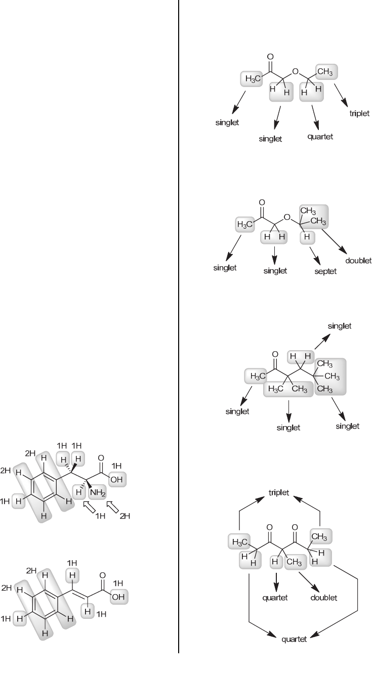 528 CHAPTER 15 15.11. Among the integration values provided, the lowest number is 33.2, so we divide all integration values by 33.2, giving the following ratio: 1 : 1.5 : 1 : 1.5 Since there is no such thing as a half of a proton, these numbers must represent 2, 3, 2, and 3 protons, respectively. This is confirmed by the molecular formula, which indicates that the compound has ten hydrogen atoms. Therefore, The signal at 4.0 ppm represents two protons. The signal at 2.0 ppm represents three protons. The signal at 1.6 ppm represents two protons. The signal at 0.9 ppm represents three protons. 15.12. Among the integration values provided, the lowest number is 17.1, so we divide all integration values by 17.1, giving the following ratio: 1 : 5 : 1 : 3 The molecular formula indicates that the compound has ten hydrogen atoms, so the numbers above are not only relative values, but they are also exact values. Therefore, The signal at 9.6 ppm represents one proton. The signal at 7.5 ppm represents five protons. The signal at 7.3 ppm represents one proton. The signal at 2.1 ppm represents three protons. 15.13. Among the integration values provided, the lowest number is 18.92, so we divide all integration values by 18.92, giving the following ratio: 1 : 1 : 1 The molecular formula indicates that the compound has six hydrogen atoms (not just three), so the numbers above are only relative values. Each signal must actually represent two protons. 15.14. We expect a total of eight signals in the 1H NMR spectrum of phenylalanine; note the symmetry in the benzene ring and the nonequivalent diastereotopic protons next to the chiral center bearing the NH2 group. Cinnamic acid has a simpler 1H NMR spectrum with only six signals. 15.15. (a) This compound has four different kinds of protons, highlighted here. In each case, we apply the n+1 rule, giving the multiplicities shown: (b) This compound has four different kinds of protons, highlighted here. In each case, we apply the n+1 rule, giving the multiplicities shown: (c) This compound has four different kinds of protons, highlighted here. In each case, we apply the n+1 rule, giving the multiplicities shown: (d) This compound has six different kinds of protons, highlighted here. In each case, we apply the n+1 rule, giving the multiplicities shown: www.MyEbookNiche.eCrater.com