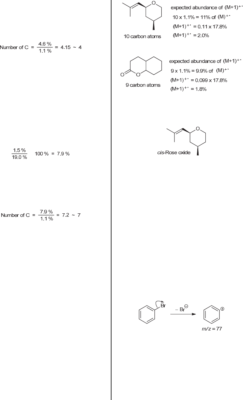 496 CHAPTER 14 This means that the (M+1)+ peak is 4.6% as tall as the (M)+ peak. Recall that each carbon atom in the compound contributes 1.1% to the height of the (M+1)+ peak, so we must divide by 1.1% to determine the number of carbon atoms in the compound: The compound cannot have 4.15 carbon atoms. It must be a whole number, so we round to the nearest whole number, which is 4. That is, the compound contains four carbon atoms, which account for 4 12 = 48 amu (atomic mass units), but the molecular weight is 54 amu. So we must account for the remaining 54 – 48 = 6 amu. This indicates six hydrogen atoms, giving the following proposed molecular formula: C4H6. (d) In order to determine the number of carbon atoms in the compound, we compare the relative heights of the (M+1)+ peak and the (M)+ peak, like this: This means that the (M+1)+ peak is 7.9% as tall as the (M)+ peak. Recall that each carbon atom in the compound contributes 1.1% to the height of the (M+1)+ peak, so we must divide by 1.1% to determine the number of carbon atoms in the compound: The compound cannot have 7.2 carbon atoms. It must be a whole number, so we round to the nearest whole number, which is 7. That is, the compound contains seven carbon atoms, which account for 7 12 = 84 amu (atomic mass units), but the molecular weight is 96 amu. So we must account for the remaining 96 – 84 = 12 amu. This indicates twelve hydrogen atoms, giving the following proposed molecular formula: C7H12. 14.21. The molecular formula of the first structure is C10H18O, while the molecular formula of the second structure is C9H14O2. Each compound is expected to exhibit a parent ion at m/z = 154, so the location of the parent signal cannot be used to differentiate these compounds. Instead, we can use the relative abundance of the (M+1)+• peak. The following calculations show that the observed data are more consistent with a compound containing 10 carbon atoms, rather than 9. The first structure is expected to give an (M+1)+• peak with a relative abundance of 2.0%. Therefore, we conclude that the first structure is cis-rose oxide: When comparing the relative abundance of the (M+1)+• peaks in this particular case, the expected difference is quite small (1.8% vs. 2.0%), so other techniques will be more useful for differentiating these compounds, including high-resolution mass spectrometry (Section 14.13). As a side note, these compounds can be easily distinguished by their strong odors: cis-rose oxide smells like roses, and the other compound (bicyclononalactone) smells like coconuts! 14.22. (a) This fragment is M – 79, which is formed by loss of a Br. So the fragment does not contain Br. Also, the fragment has a smaller mass than a single bromine atom (77