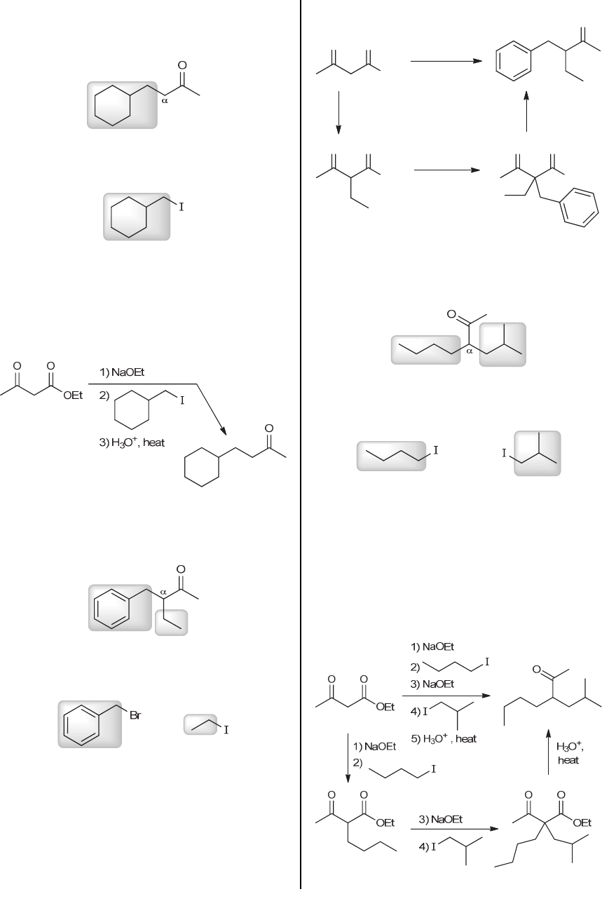 CHAPTER 21 857 21.33. (a) The product is a methyl ketone that has the following (highlighted) group connected to the position: This group can be installed via an acetoacetic ester synthesis, using the following alkyl halide: An acetoacetic ester synthesis begins with the deprotonation of ethyl acetoacetate (using ethoxide as a base). The resulting resonance-stabilized conjugate base is then treated with the alkyl halide above, thereby installing the alkyl group. Subsequent hydrolysis and decarboxylation give the product, as shown: (b) The product is a methyl ketone that has the following two (highlighted) groups connected to the position: Each of these groups can be installed via an acetoacetic ester synthesis, using the following halides: An acetoacetic ester synthesis begins with the deprotonation of ethyl acetoacetate (using ethoxide as a base). The resulting resonance-stabilized conjugate base is then treated with one of the halides above, to install one of the two groups. The other group is installed in a similar way (deprotonation with a base, followed by alkylation). Subsequent hydrolysis and decarboxylation give the product, as shown: OEt O O O 1) NaOEt 2) EtI 3) NaOEt 4) PhCH2Br 5) H3O+, heat1) NaOEt 2) EtI OEt O O 1) NaOEt 2) PhCH2Br OEt O O H3O+, heat (c) The product is a methyl ketone that has the following two (highlighted) groups connected to the position: Each of these groups can be installed via an acetoacetic ester synthesis, using the following alkyl halides: An acetoacetic ester synthesis begins with the deprotonation of ethyl acetoacetate (using ethoxide as a base). The resulting resonance-stabilized conjugate base is then treated with one of the alkyl halides above, thereby installing one of the two alkyl groups. The other alkyl group is installed in a similar way (deprotonation with a base, followed by alkylation). Subsequent hydrolysis and decarboxylation give the product, as shown: www.MyEbookNiche.eCrater.com